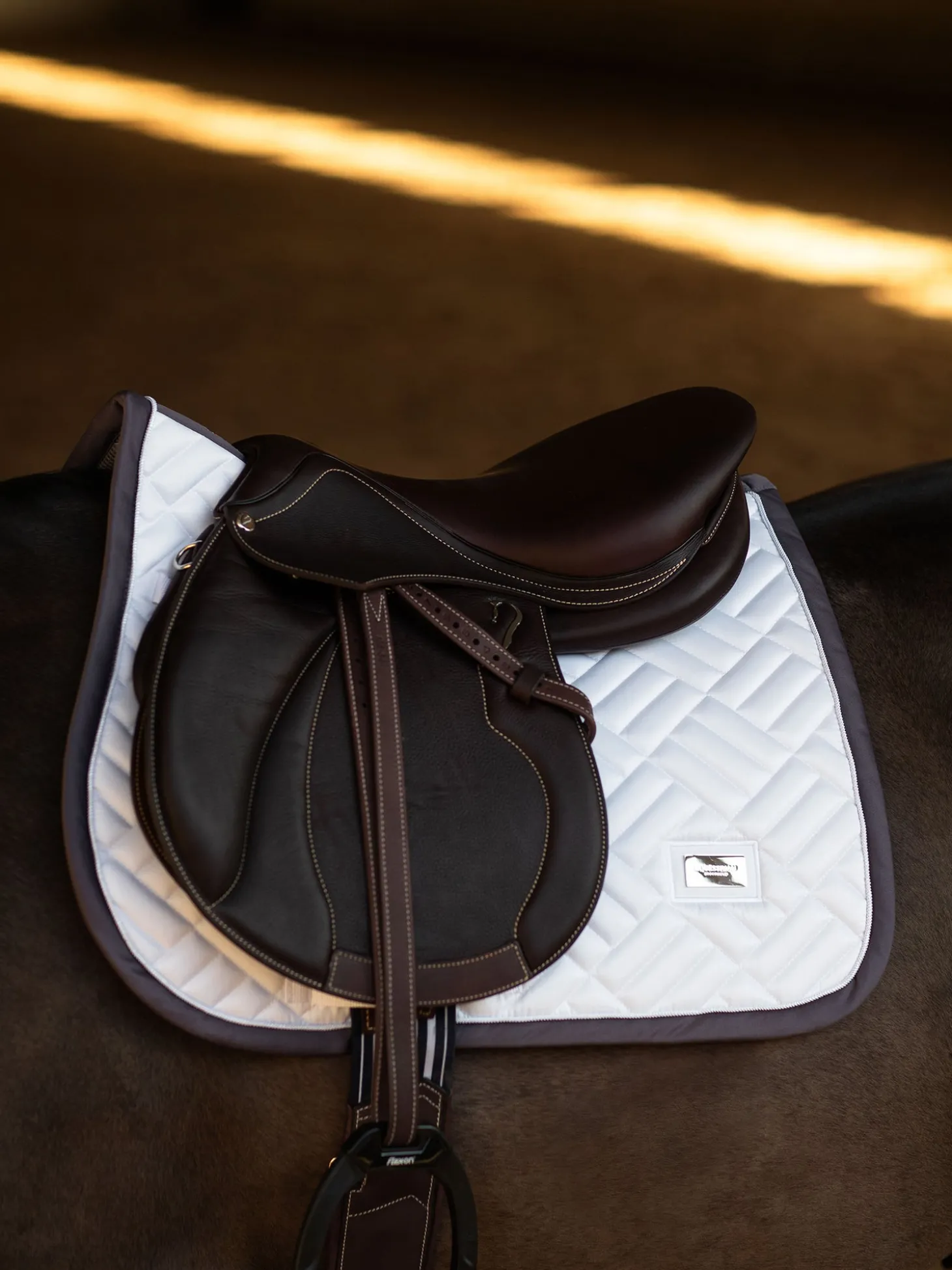 Elegante Schabracke mit modernem Steppmuster in Weiß mit silbernen Details. Verziert mit dem Equestrian Stockholm Abzeichen in Silber. Das Bambusmaterial ist aufgrund seiner thermoregulierenden Wirkung – kühlend im Sommer und wärmend im Winter – das ganze Jahr über perfekt geeignet. Es ist außerdem schnell trocknend, feuchtigkeitstransportierend und antibakteriell. Kombinieren Sie die Schabracke mit anderen Teilen aus der Dark Violet Kollektion für einen stilvollen Look von Kopf bis Fuß.