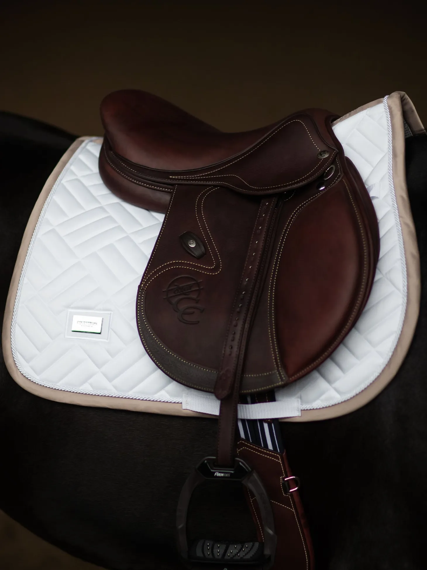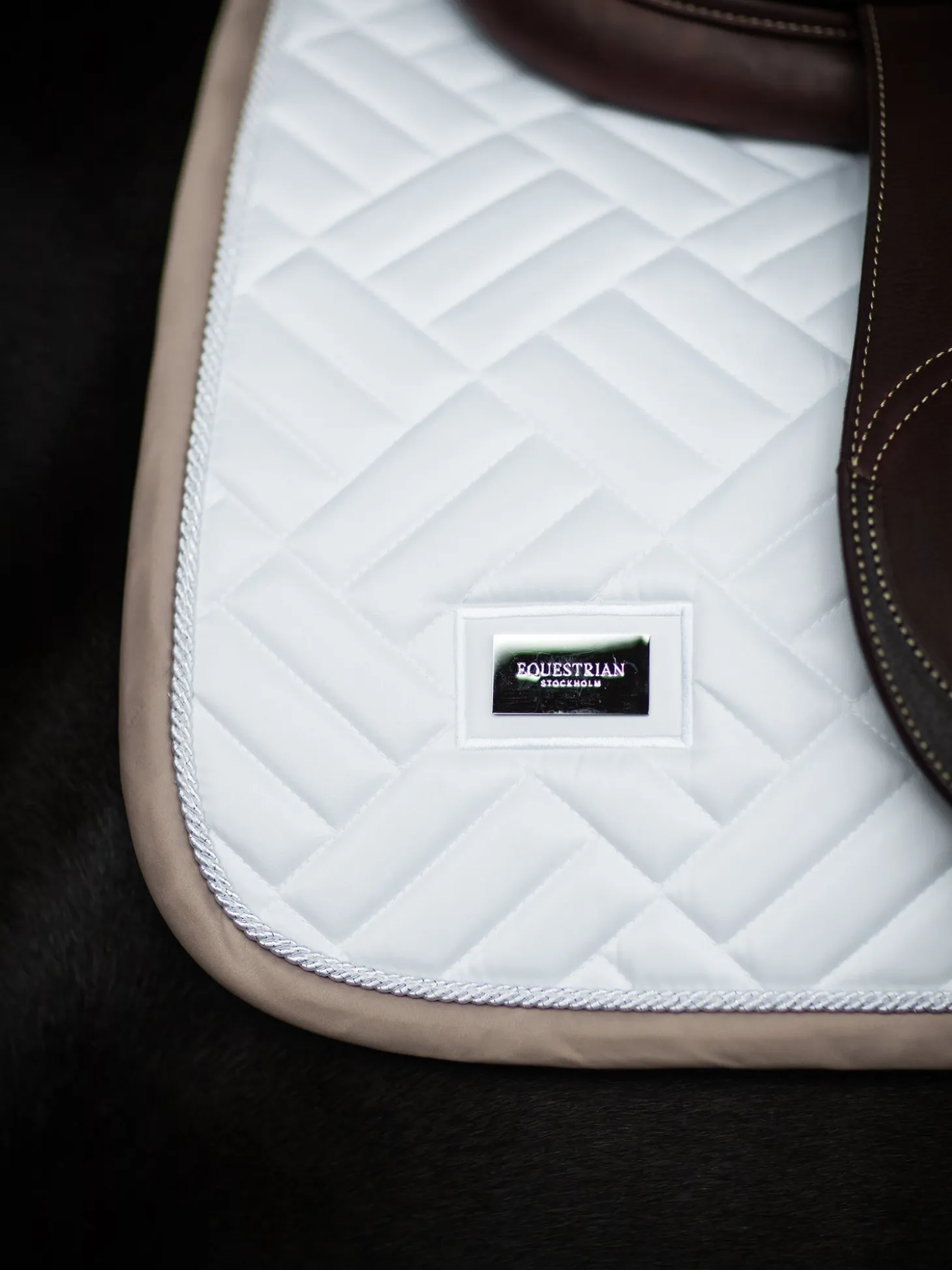 Details: Beigefarbene Einfassung mit weißem Equestrian Stockholm-Logo / Moderne Steppung