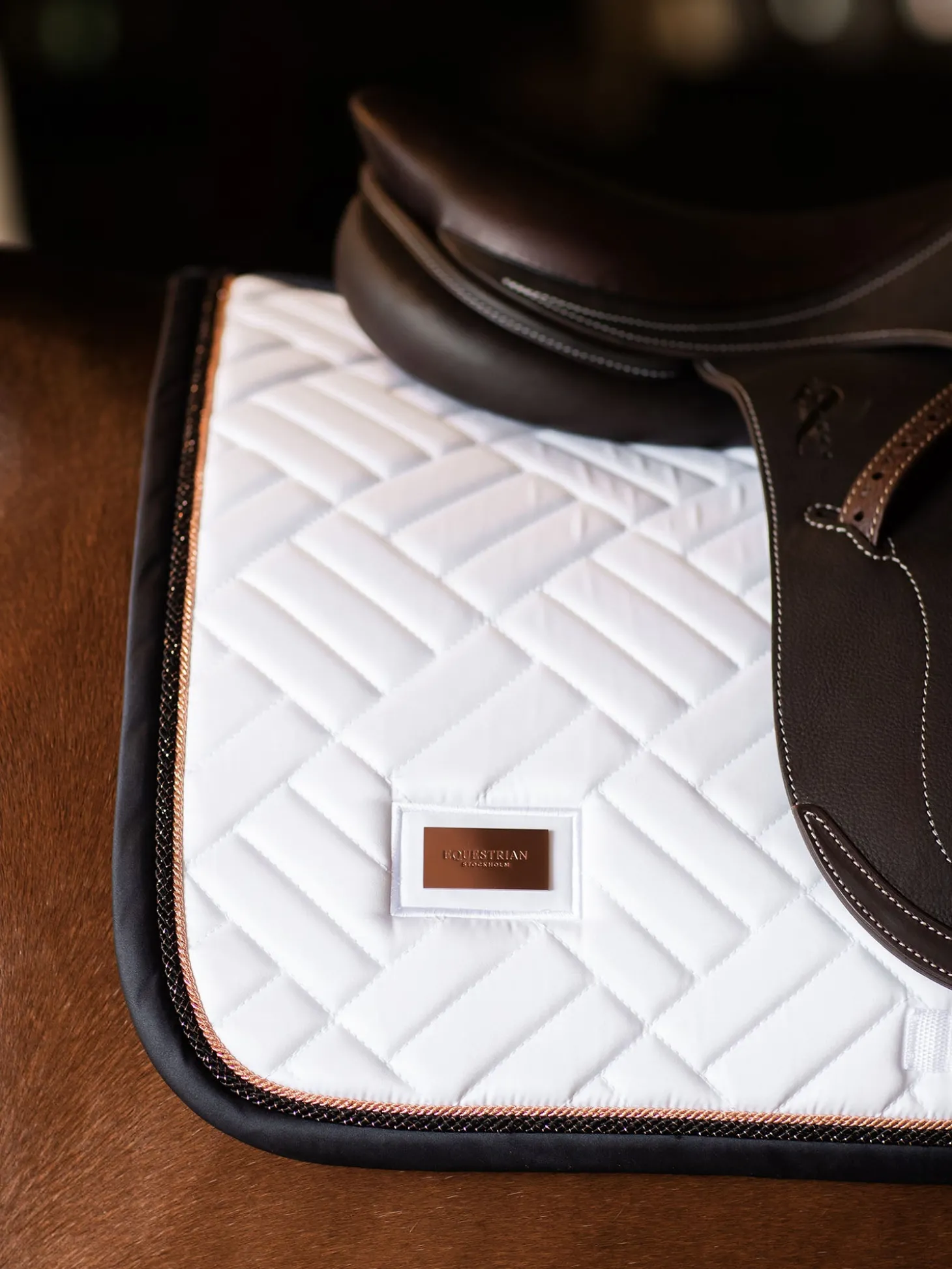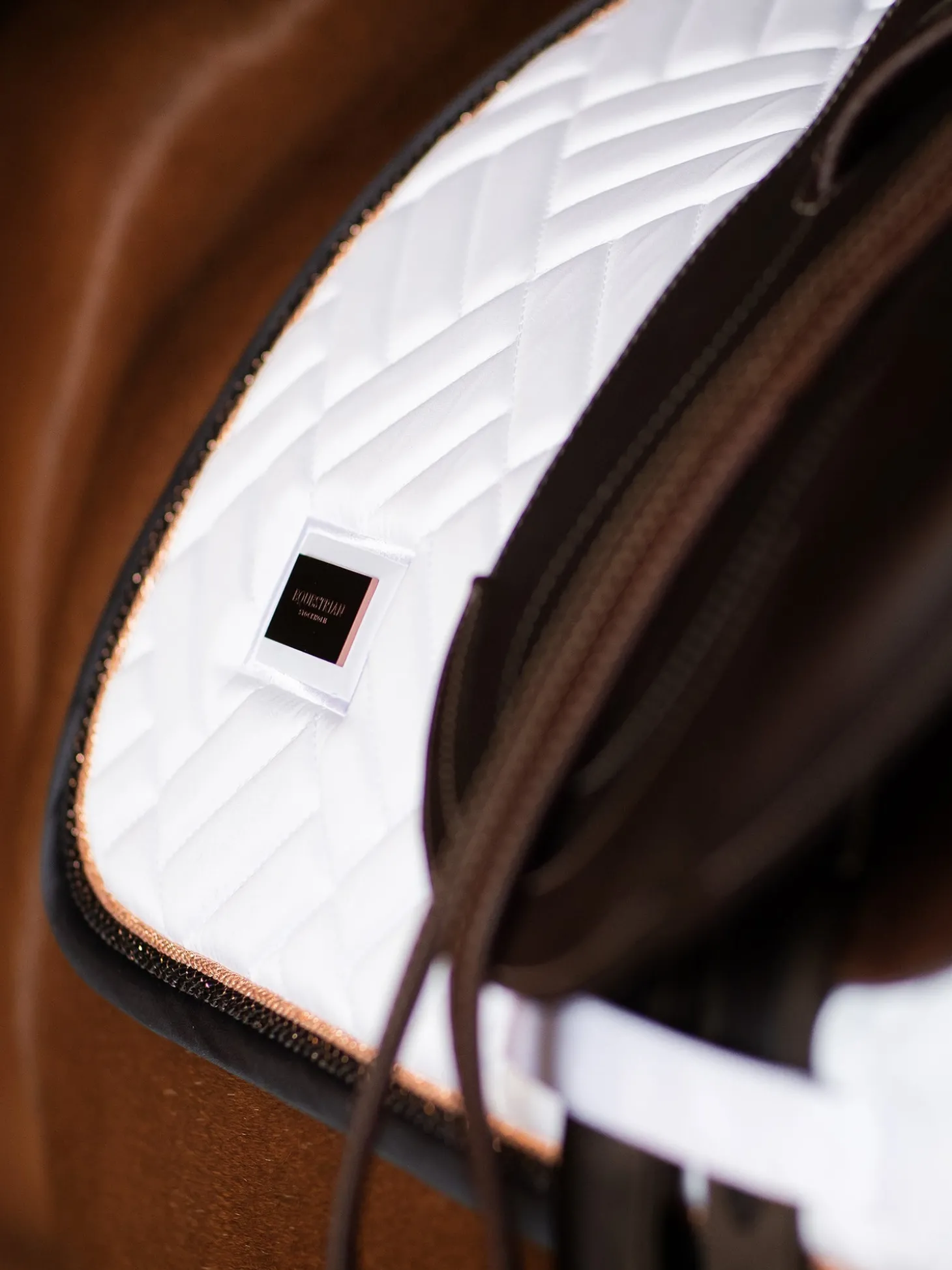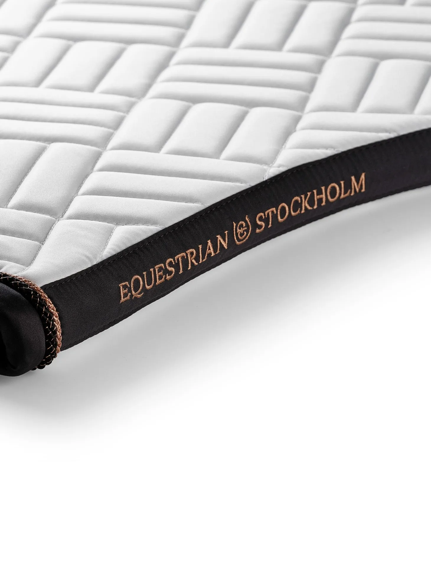 Elegante Schabracke mit moderner Steppung in Weiß mit dunklem Ozeanblau und roségoldenen Details. Verziert mit dem Equestrian Stockholm Abzeichen in Roségold. Das Bambusmaterial ist aufgrund seiner thermoregulierenden Wirkung das ganze Jahr über perfekt – kühlend im Sommer und wärmend im Winter. Außerdem ist es schnelltrocknend, feuchtigkeitsableitend und antibakteriell.