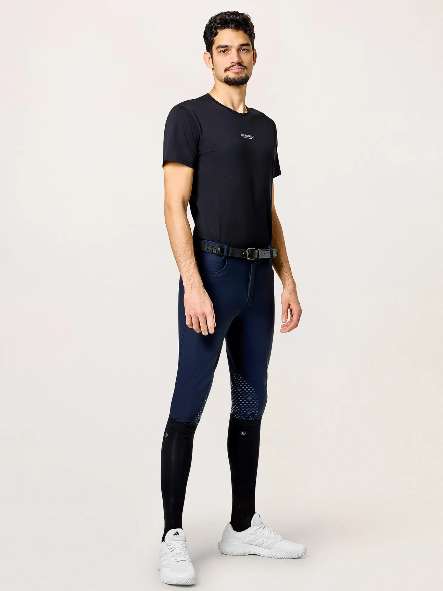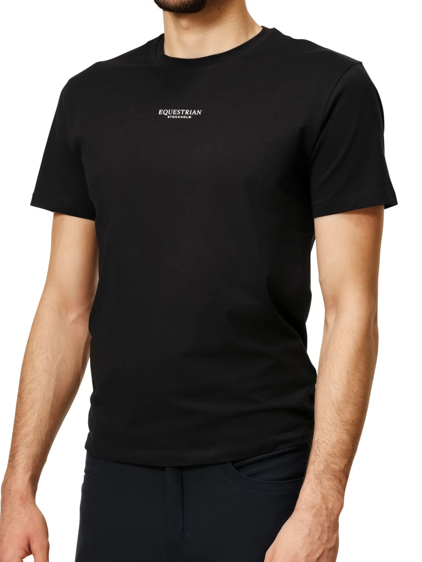 Stilvolles schwarz t-shirt mit klassischem Rundhalsausschnitt. Das t-shirt ist mit dem Label von Equestrian Stockholm in weißen Buchstaben über der Brust bedruckt Die lockere Passform sieht cool aus und fühlt sich bequem an.