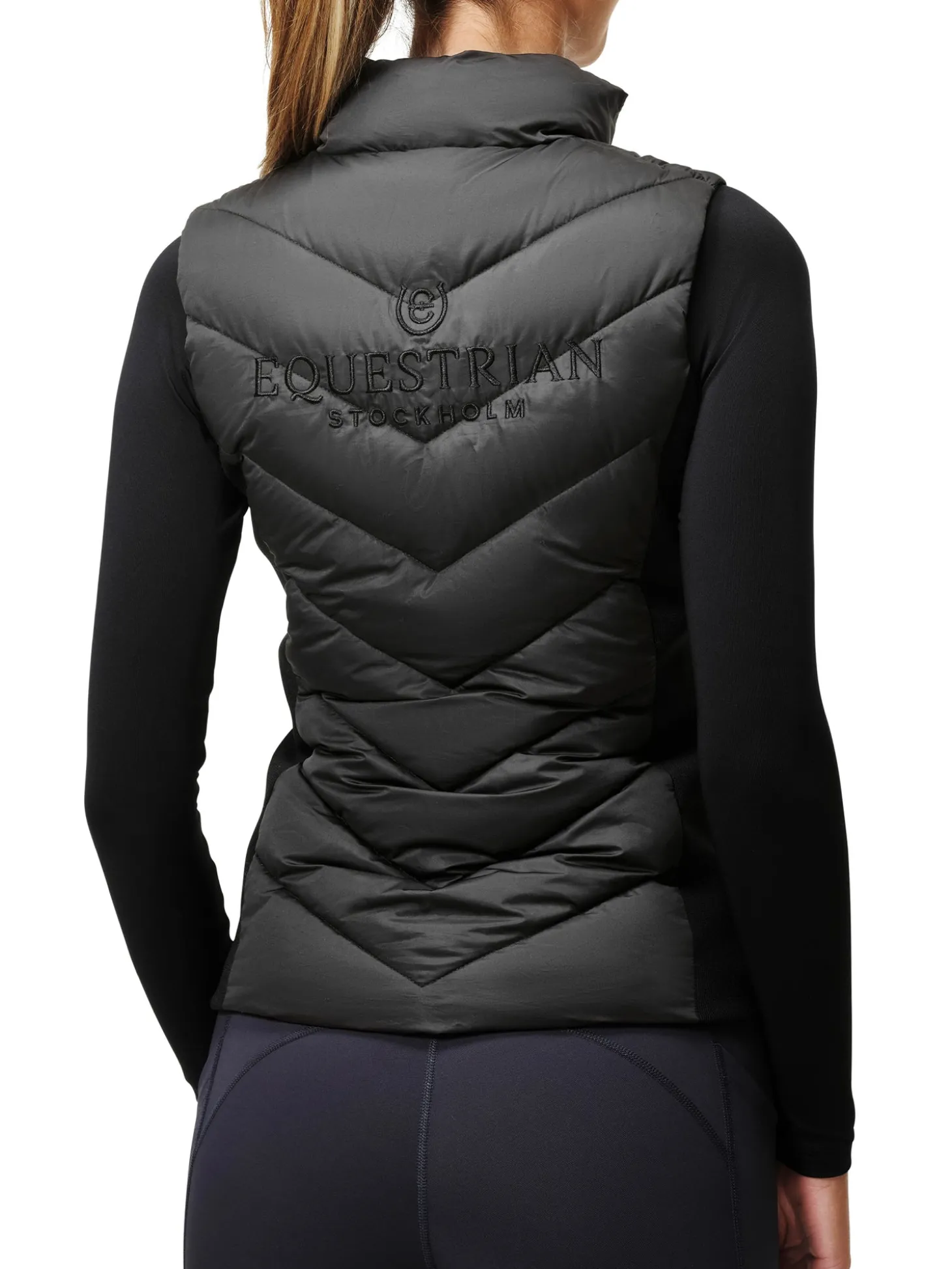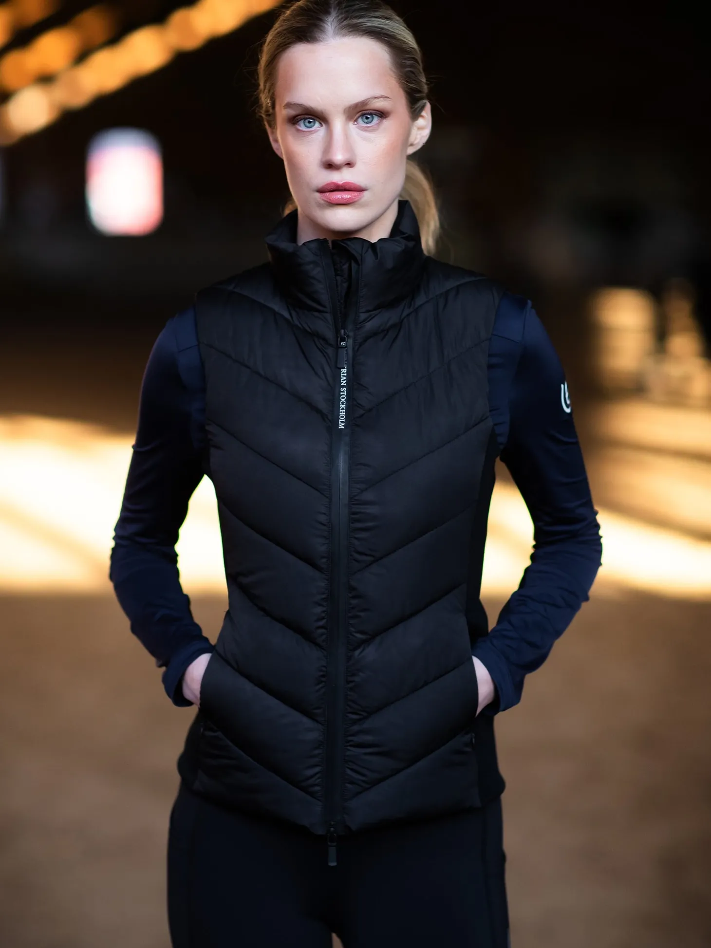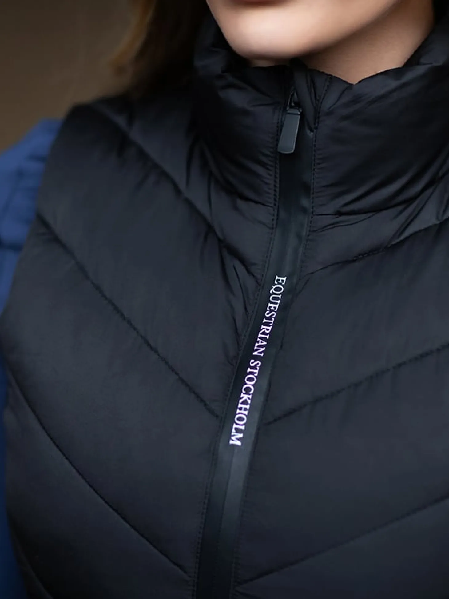 Elegante Weste in Schwarz mit schwarzen und weißen Details. Hergestellt aus wasser- und windabweisendem Material und recyceltem Polyester. Aufgrund ihrer erstaunlichen Isolierung kann die Weste Temperaturen bis zu 4 Grad Celsius / 39 Fahrenheit handhaben, was sie zu einer perfekten Frühlings- und Herbstweste macht. Der 2-Wege-Reißverschluss an der Vorderseite macht sie perfekt, wenn Sie während des Reitens eine zusätzliche Weite im unteren Bereich benötigen. Dekoriert mit dem Ton-in-Ton Equestrian Stockholm Logo auf dem Rücken.