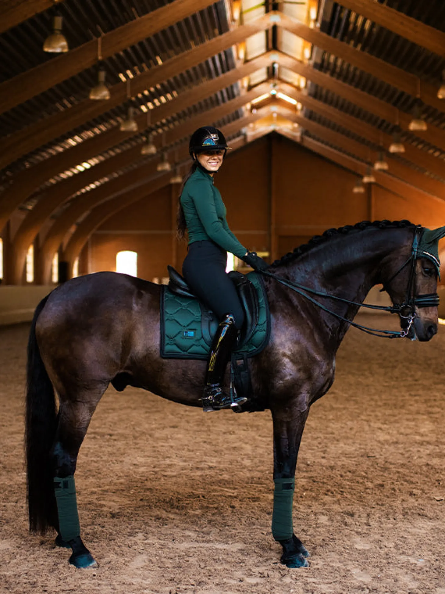 Exklusives und sportliches Vision Top in luxuriösem, coolem Dunkelgrün und mit schwarzen Details. Das Oberteil ist aus einer atmungsaktiven, recycelten Polyestermischung gefertigt und hat eine schmale Passform mit Mesh an den Seiten und am Ärmel unter dem Arm. Es ist mit einem vertikalen Equestrian Stockholm Logo auf dem Rücken und einem kleineren Logo auf dem linken Arm verziert. Tragen Sie das Top mit anderen Produkten aus der Sycamore Green Kollektion für einen kompletten Look.