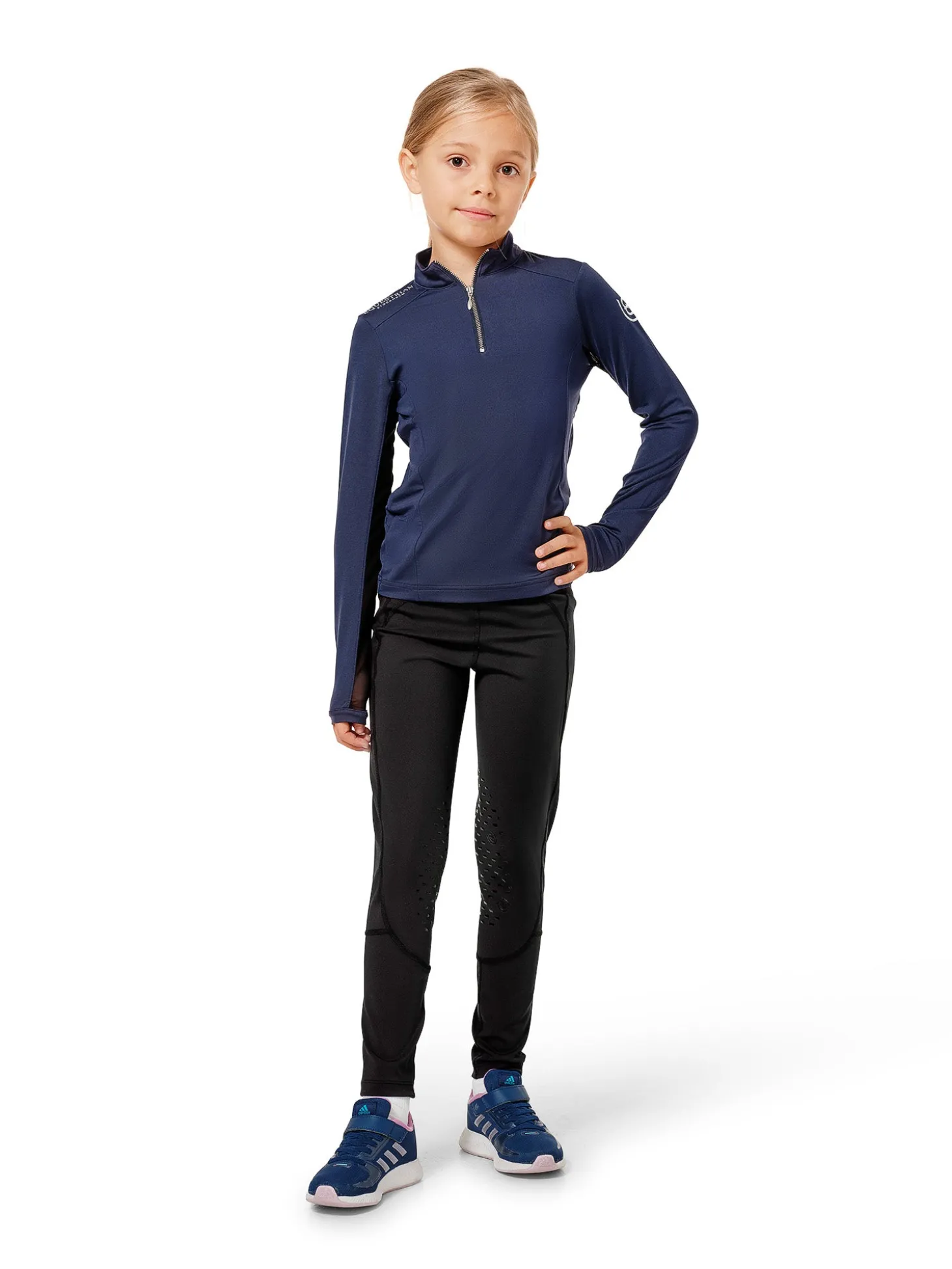 Dieses ultimative Reittop für wärmere Tage ist in einem eleganten marineblauen Design mit einem silbernen Reißverschluss auf der Vorderseite gehalten. Es besteht aus einem atmungsaktiven Netzeinsatz und ultradünnem Material, das atmungsaktiv ist und einen kühlenden Effekt hat.