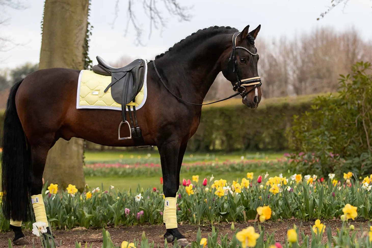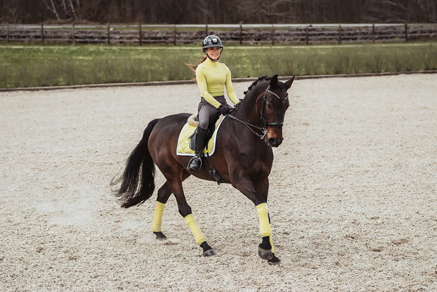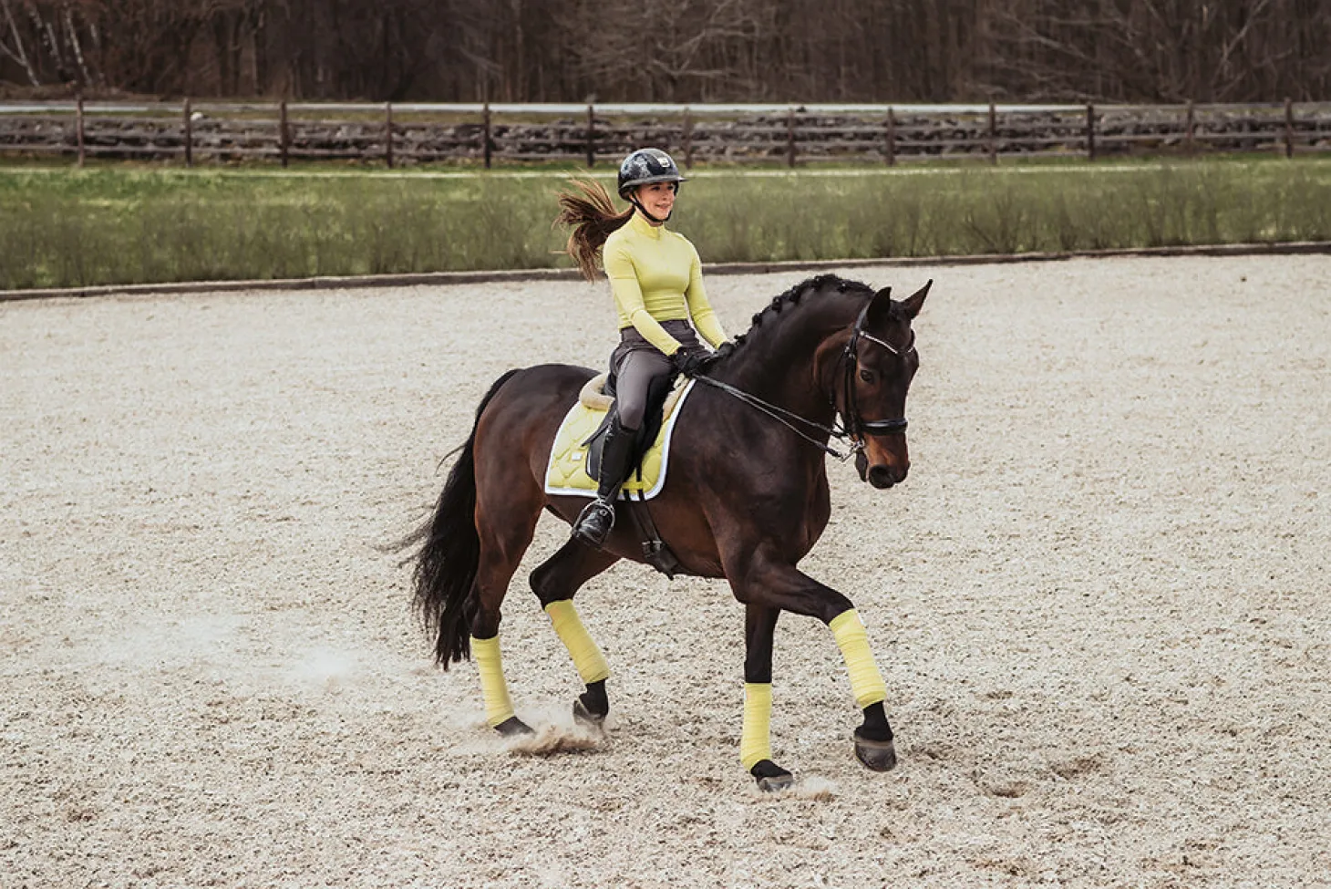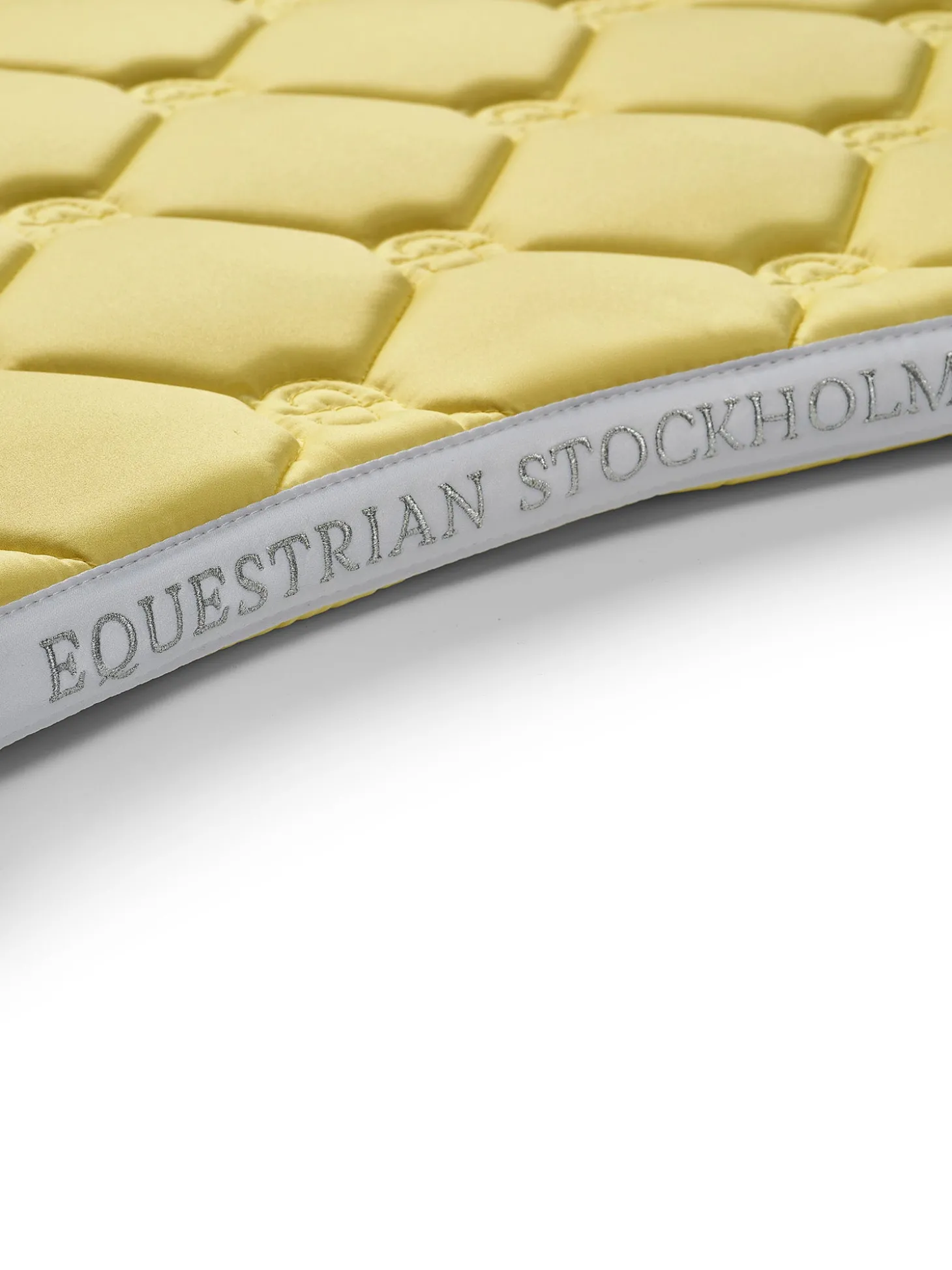 Die exklusive Dressurschabracke passt sowohl auf die Trainingsstrecke als auch in die Wettkampfarena. In einem schicken hellen gelb mit stilvollen weißen und silbernen Details designt. Zusammengesetzt aus einem glänzenden und schmutzabweisenden Material, das gut atmet und Ihr Pferd während schweißtreibender Trainingseinheiten trocken hält. Gesteppt mit dem Muster von Equestrian Stockholm. Kombinieren Sie sie mit anderen Teilen aus der gleichen Kollektion für einen kompletten Look.