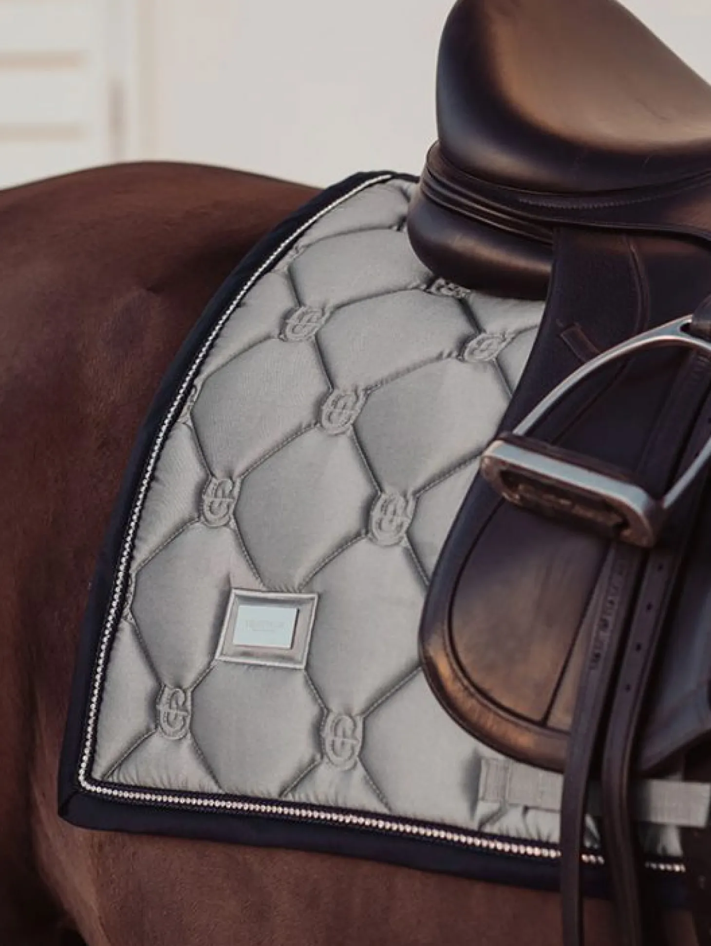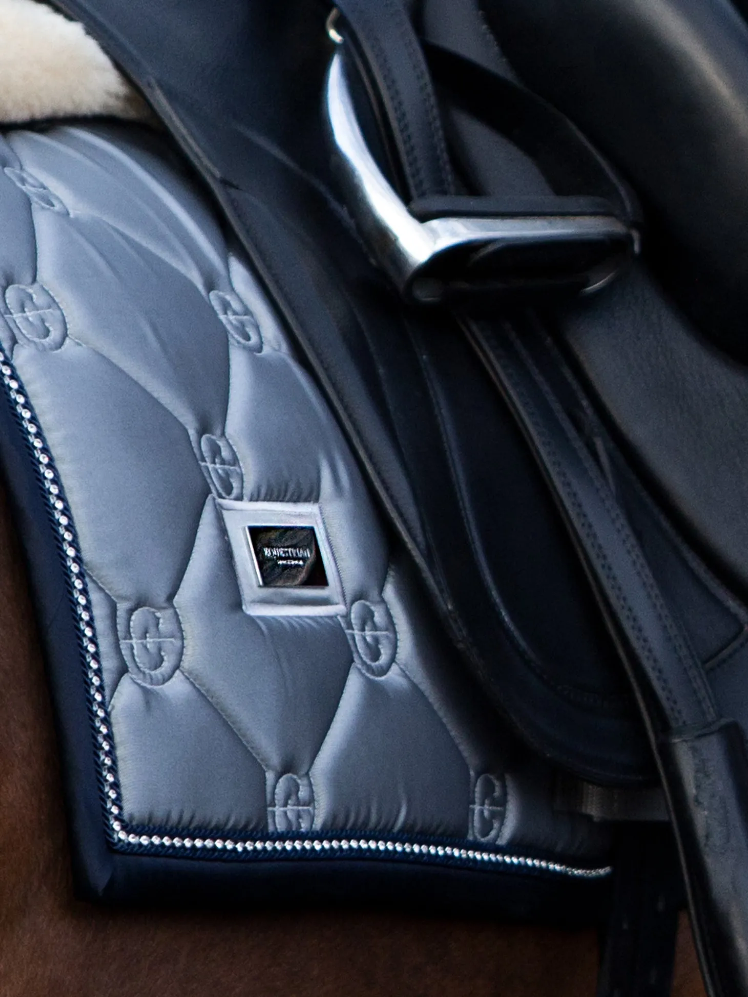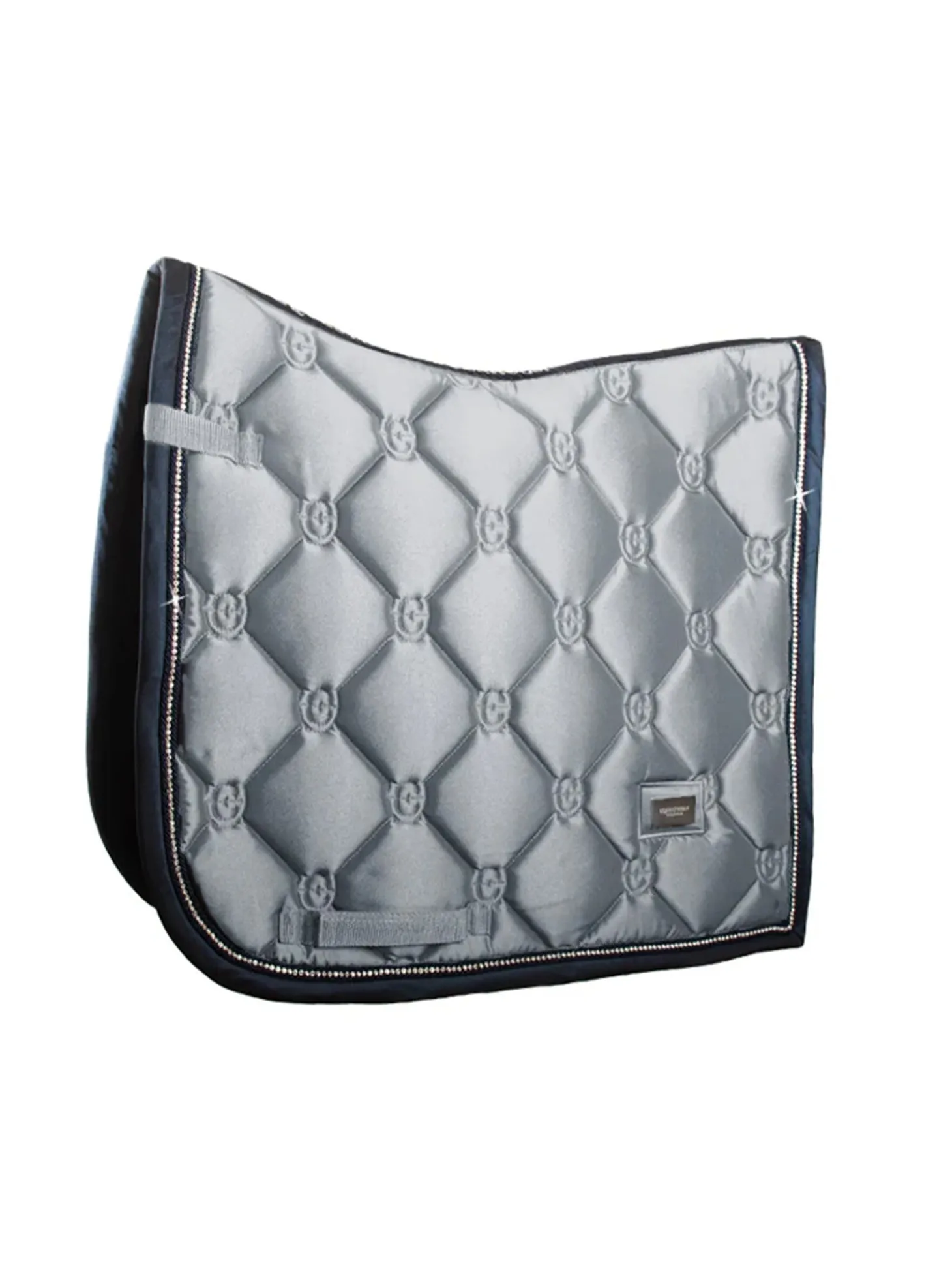 Die schöne graue Dressurschabracke passt perfekt auf die Trainingsstrecke. Der Einband wird in einem tiefen Dunkelblau mit einer Paspelierung in schimmernden Strasssteinen geschmückt. Das glänzende Material auf der Außenseite verleiht der Schabracke ein luxuriöses Aussehen und die Trockenfunktion auf der Innenseite hält das Pferd bei schweißtreibenden Trainings trocken.