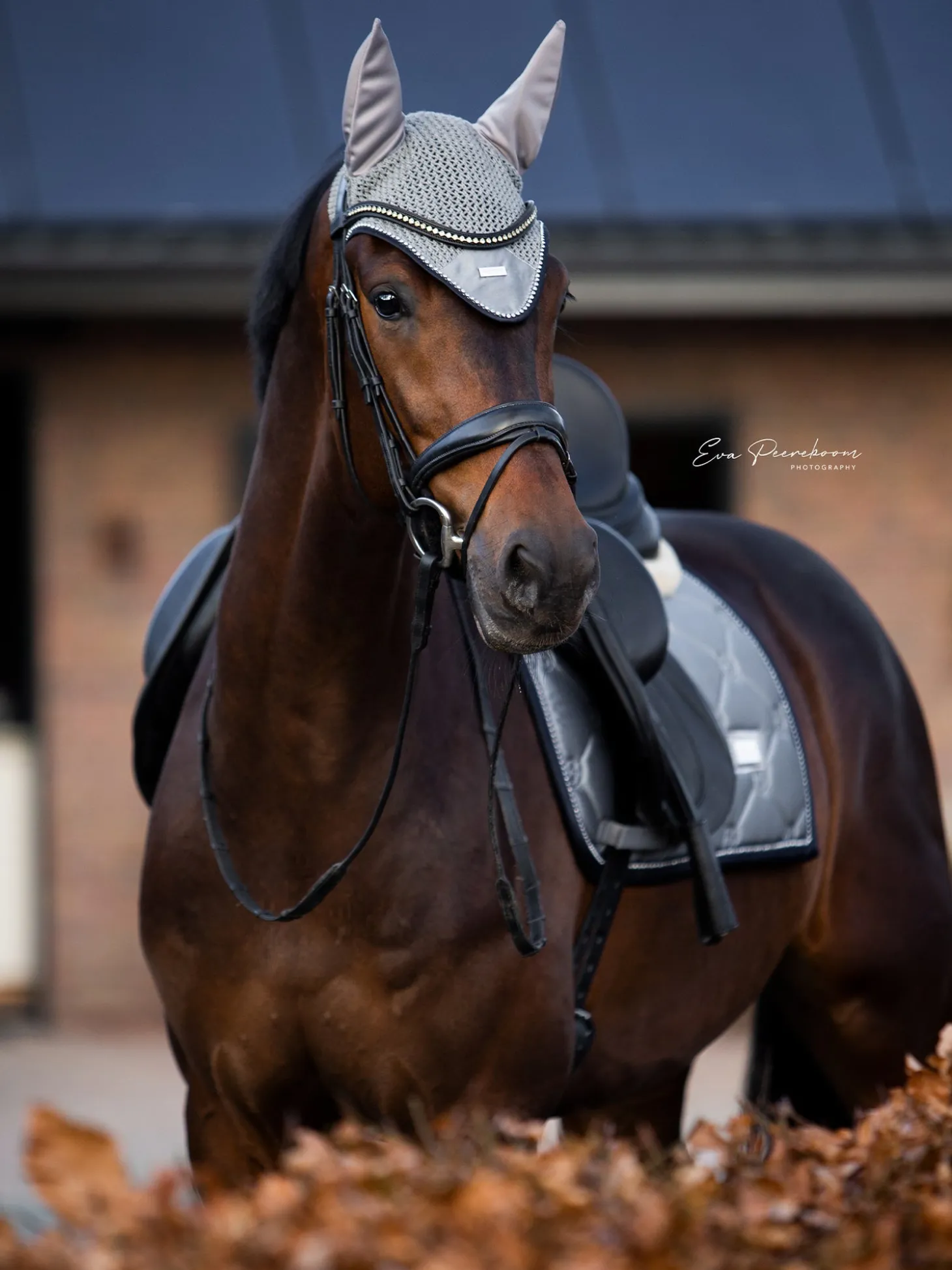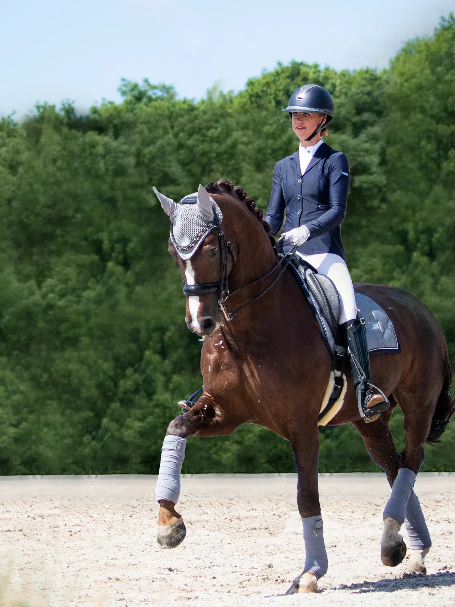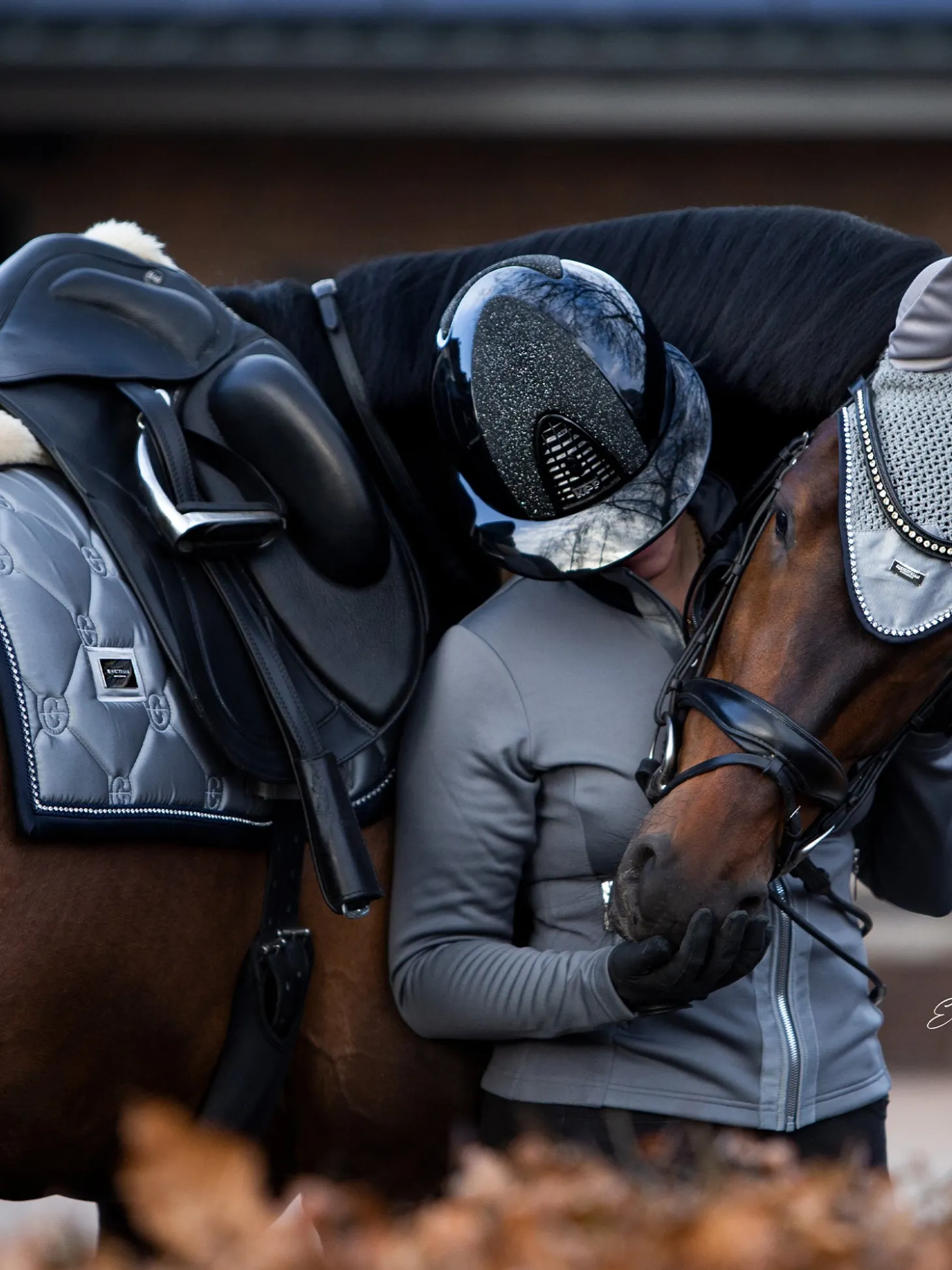 Die schöne graue Dressurschabracke passt perfekt auf die Trainingsstrecke. Der Einband wird in einem tiefen Dunkelblau mit einer Paspelierung in schimmernden Strasssteinen geschmückt. Das glänzende Material auf der Außenseite verleiht der Schabracke ein luxuriöses Aussehen und die Trockenfunktion auf der Innenseite hält das Pferd bei schweißtreibenden Trainings trocken.