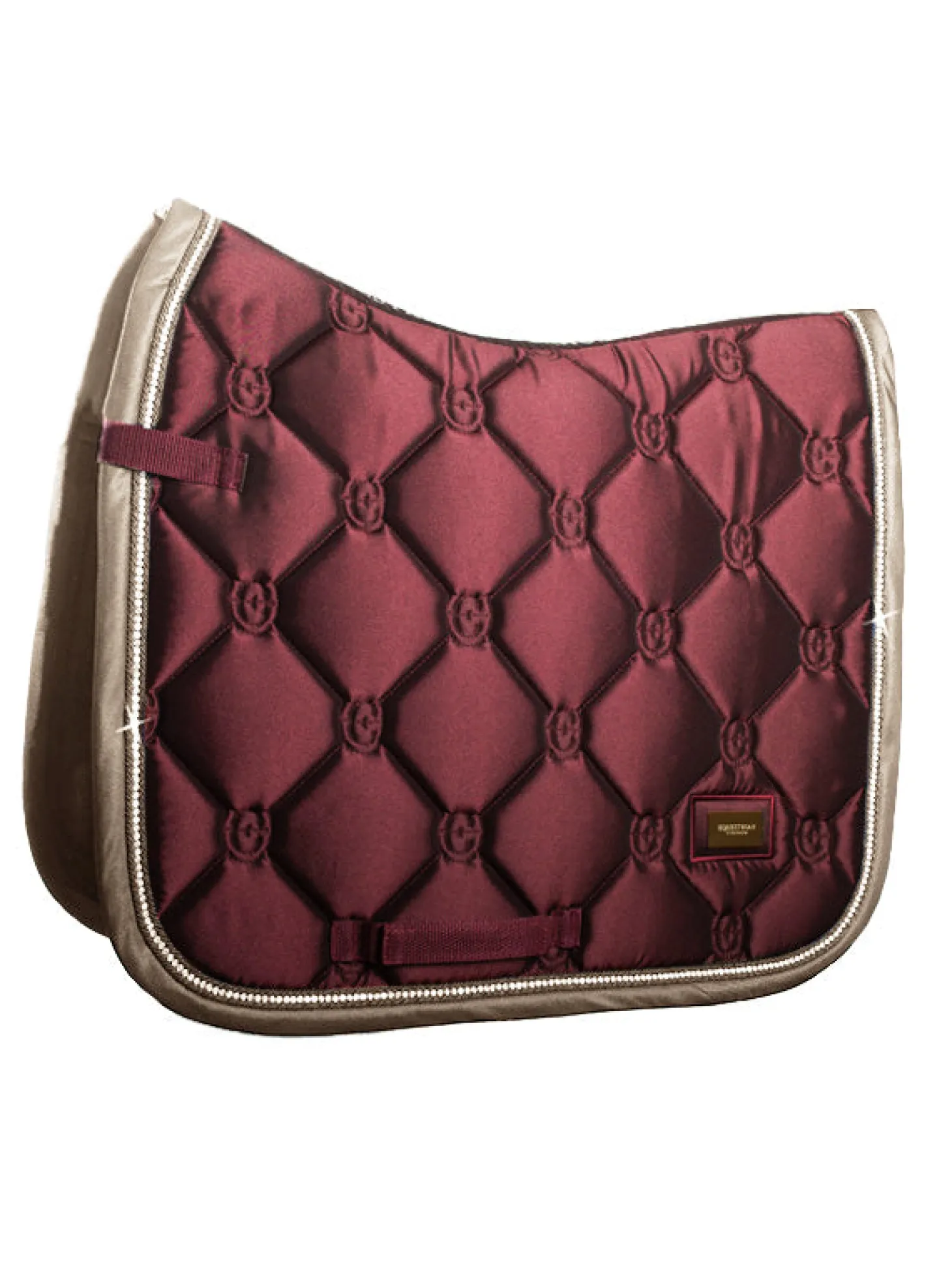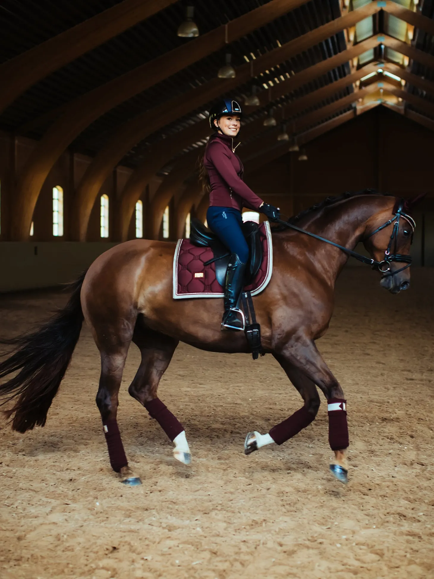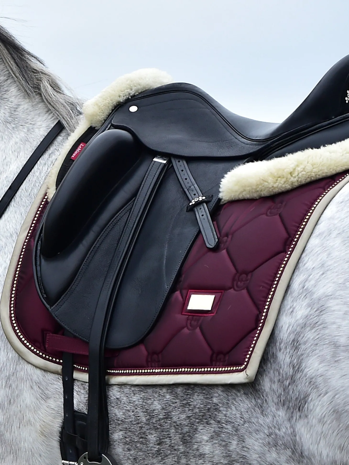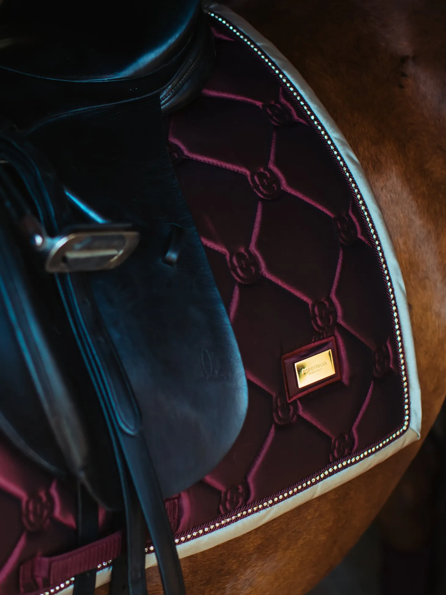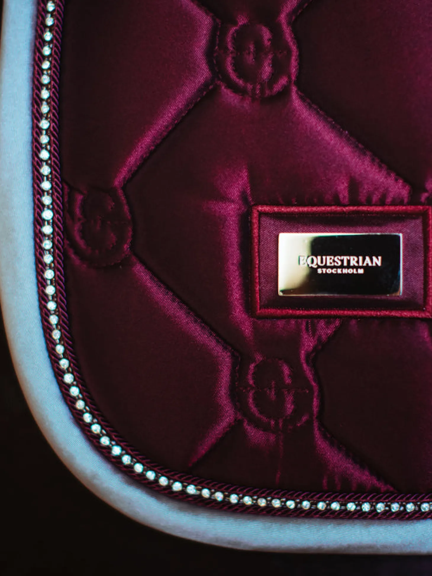 Glamouröse Schabracke in einer romantischen Nuance von Merlot, mit schimmernden goldenen Kristallen und merlotfarbenen Paspeln. Gefertigt aus einem exquisiten Stoff, der glänzend, schmutzabweisend und atmungsaktiv ist. Verziert mit dem ikonischen Abzeichen von Equestrian Stockholm in Gold. Mit anatomischer Form und Steppung im Muster von Equestrian Stockholm. Kombinieren Sie diese mit anderen Teilen aus der gleichen Kollektion für einen glamourösen Look von Kopf bis Fuß.