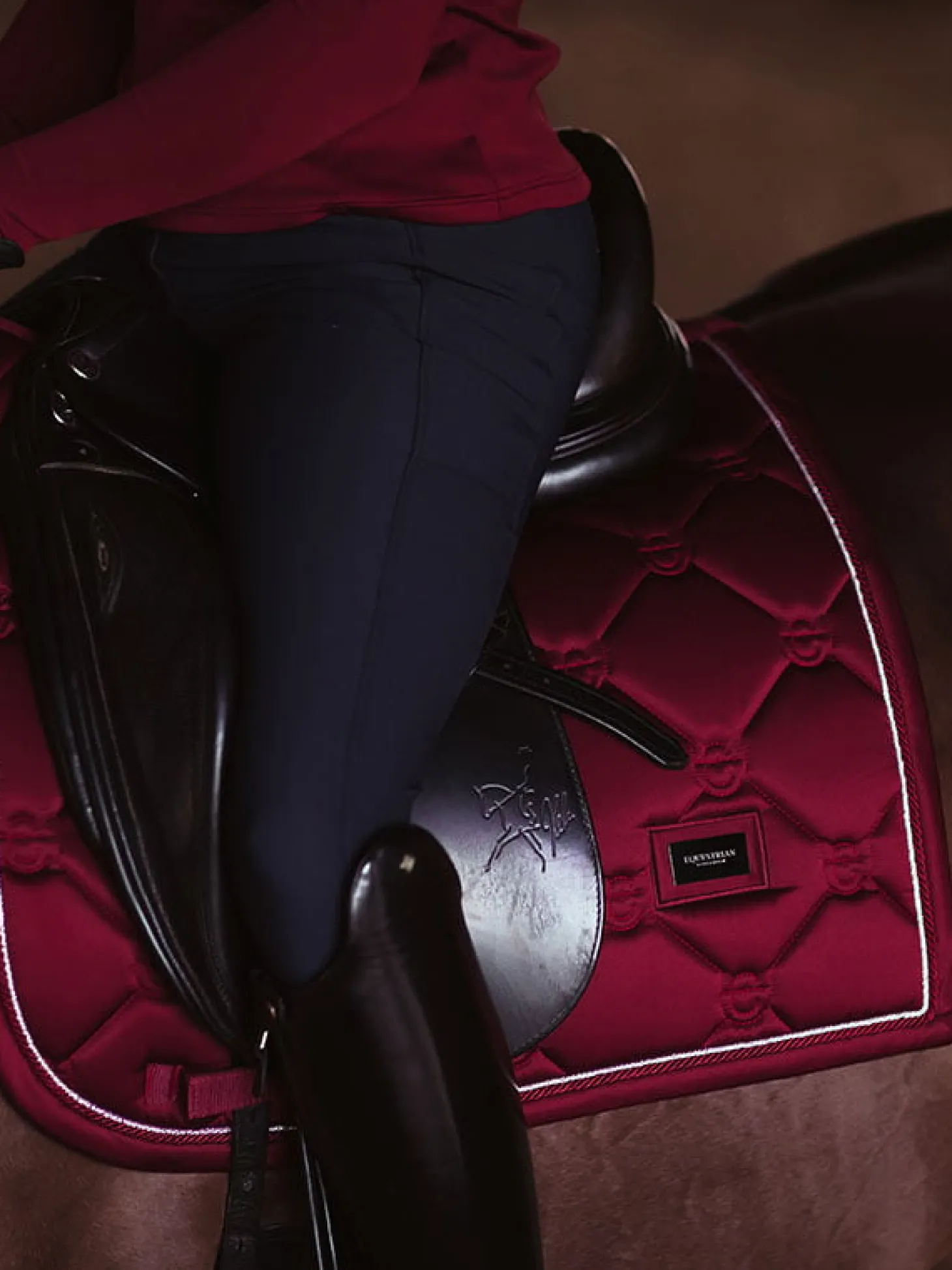 Die schöne Schabracke für den Herbst ist da! Eine elegante Burgundafarbende Schabracke mit Details in Silber und Chrome. Das Innenmaterial ist besonders schnell trocknend und das Außenmaterial glänzend und schmutzabweisend. Kombinieren Sie diese mit anderen Teilen aus der gleichen Kollektion für einen glamourösen Look von Kopf bis Fuß.