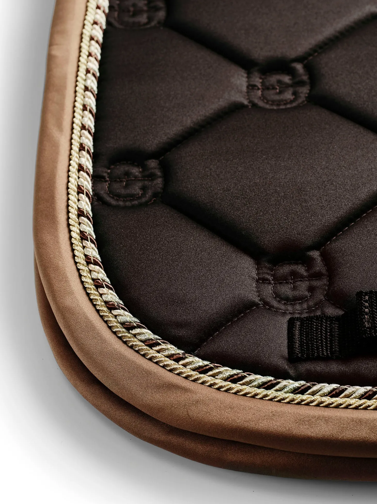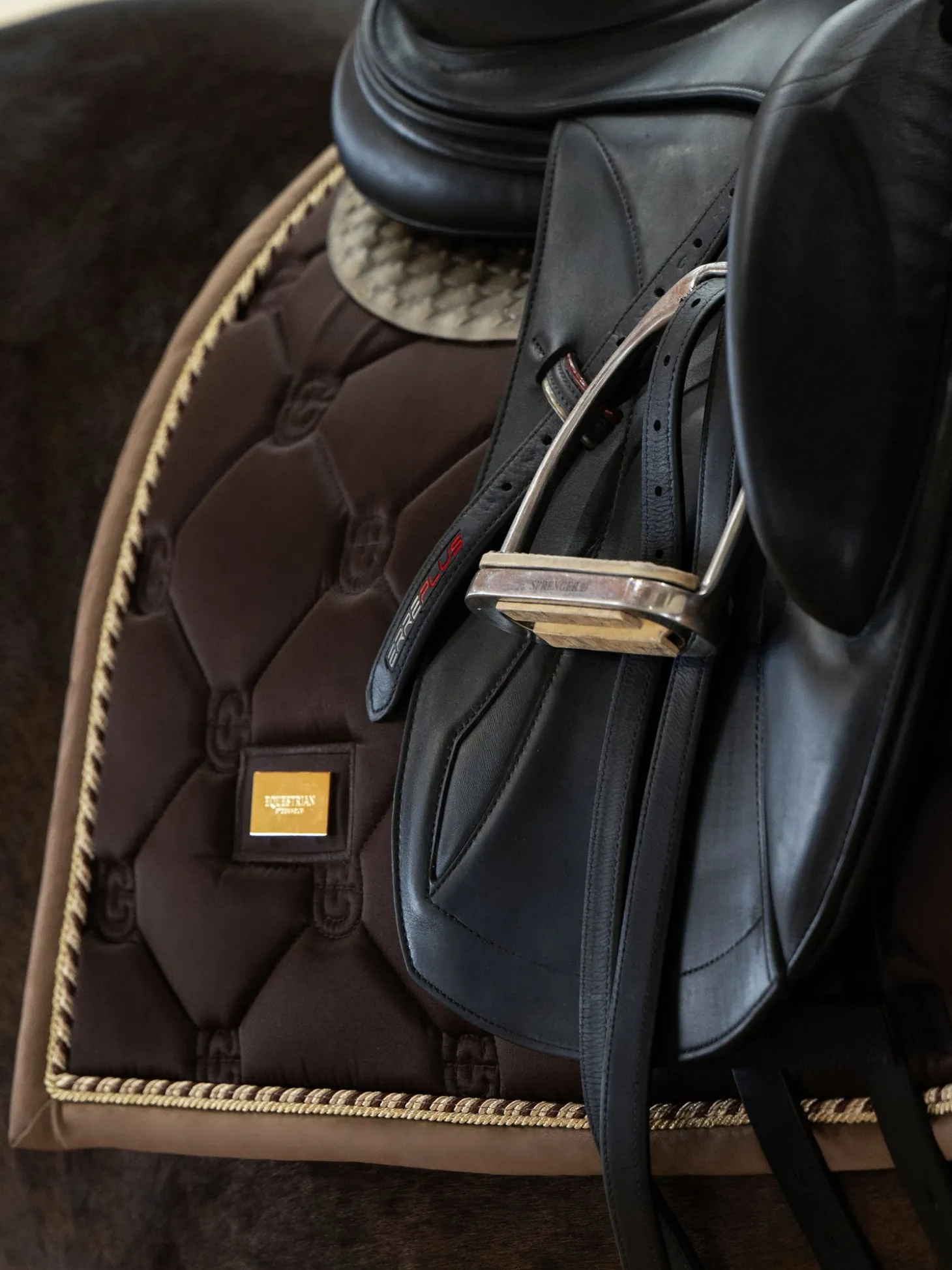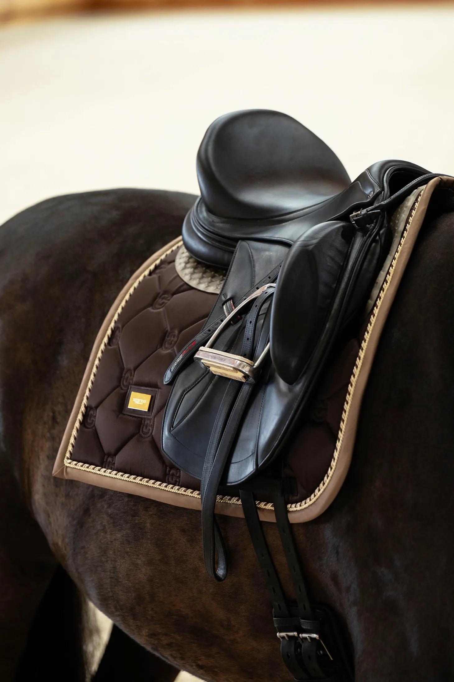 Die Golden Brown Schabracke ist ein echter Favorit! Die hochwertige Dressurschabracke in Shiny Dark Brown ist ideal für das Training. Das Innenmaterial trocknet besonders schnell und hält dein Pferd während des Trainings trocken. Die Schabracke besteht aus glänzendem, schmutzabweisendem Material mit schönen Details in Gold und einem Muster mit dem Logo von Equestrian Stockholm.