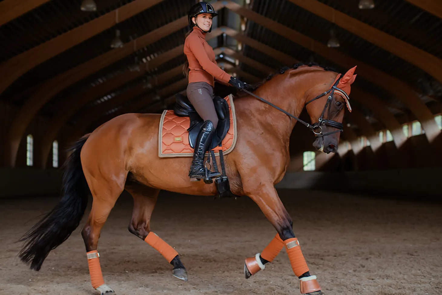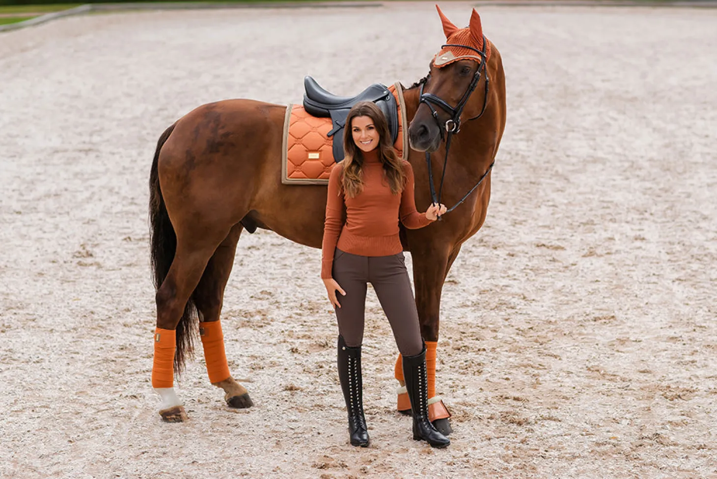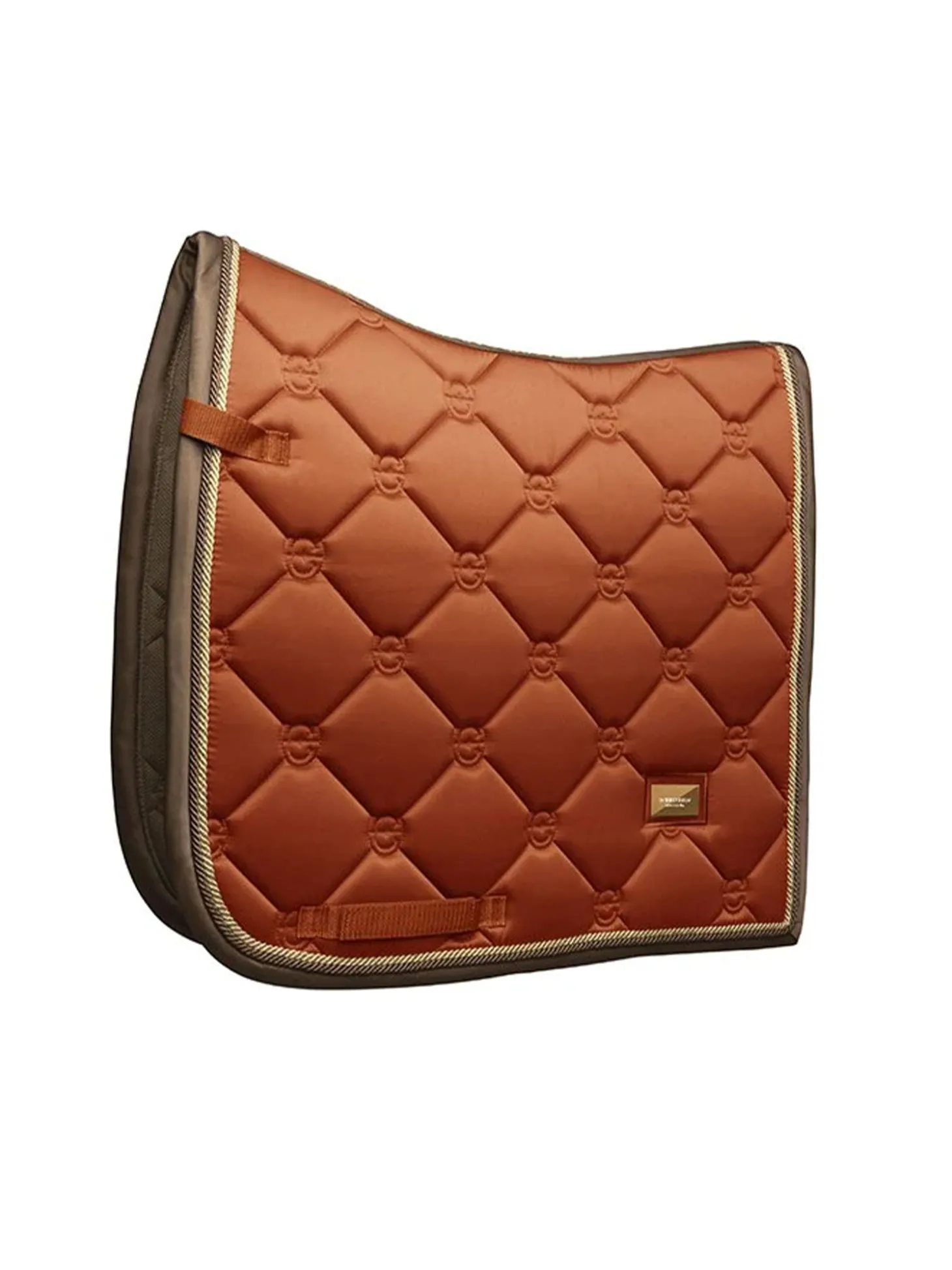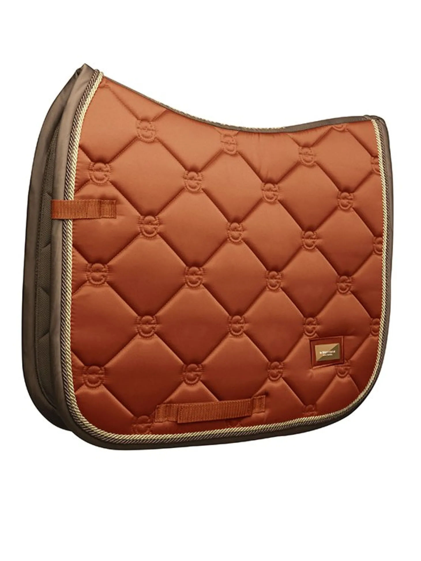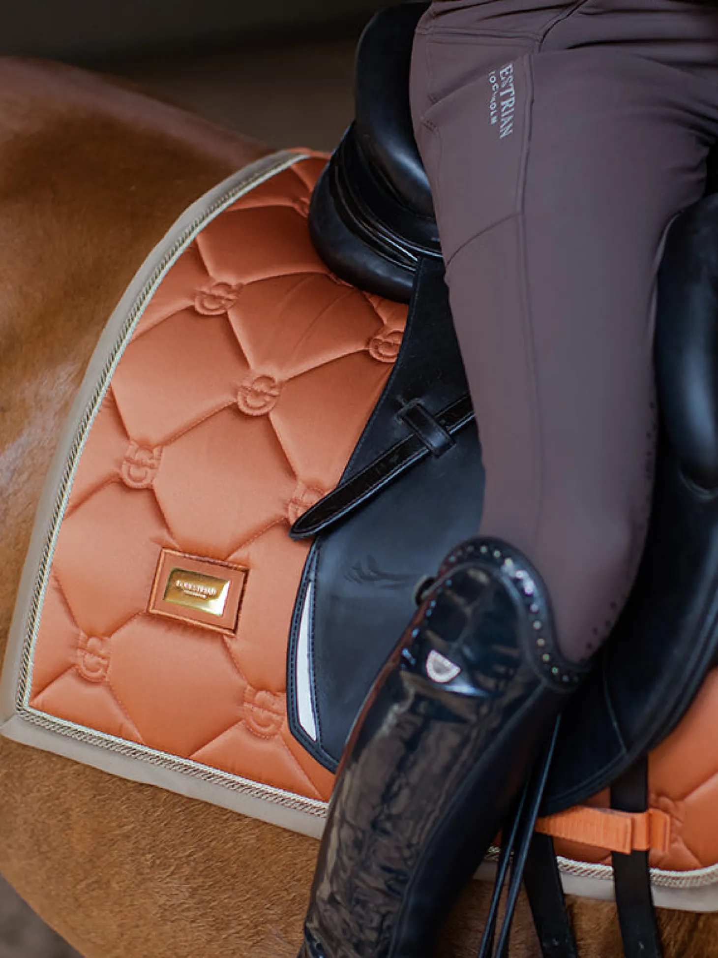 Exklusive Dressurschabracke in einem schönen warmen Copper Orangem Design mit goldenen und champagnerfarbenen Details. Verziert mit einem stilvollen goldenen Equestrian Stockholm Abzeichen.