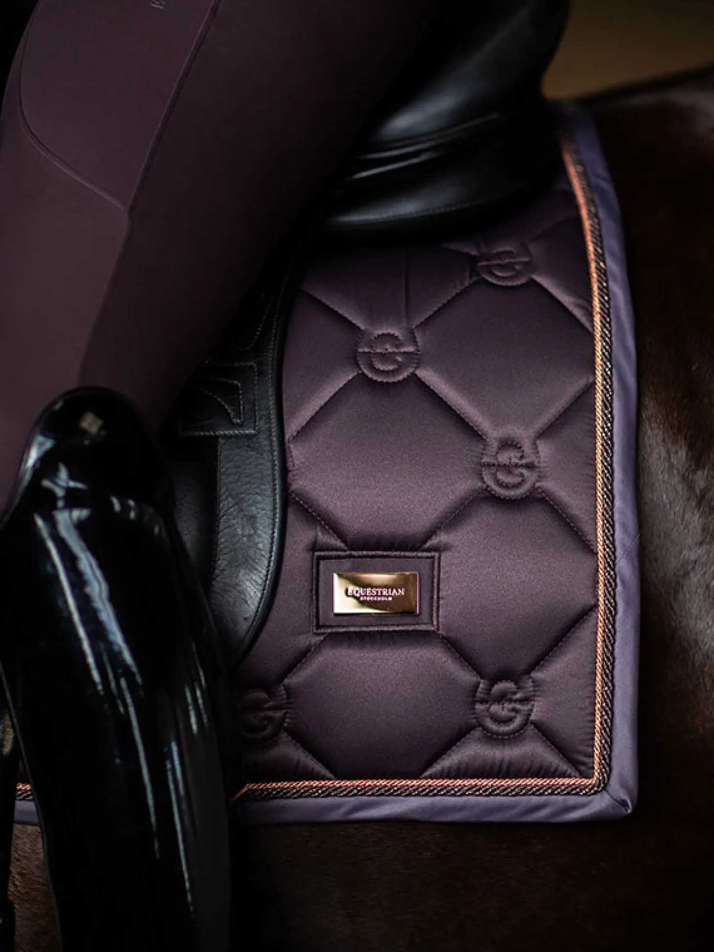 Elegante Schabracke in braun/violett mit roségoldenen Details. Verziert mit dem Equestrian Stockholm Abzeichen in Roségold. Das Material ist mit High IQ cool comfort behandelt, welches der Schabracke schnell trocknende und feuchtigkeitstransportierende Eigenschaften verleiht. Dadurch bleibt Ihr Pferd länger trocken und frisch. Kombinieren Sie die Schabracke mit anderen Teilen aus unserer Moonless Night Kollektion für einen stilvollen Look von Kopf bis Fuß.