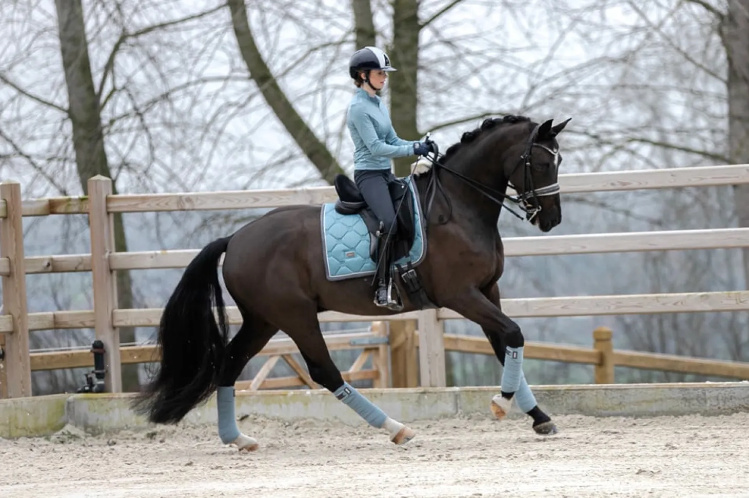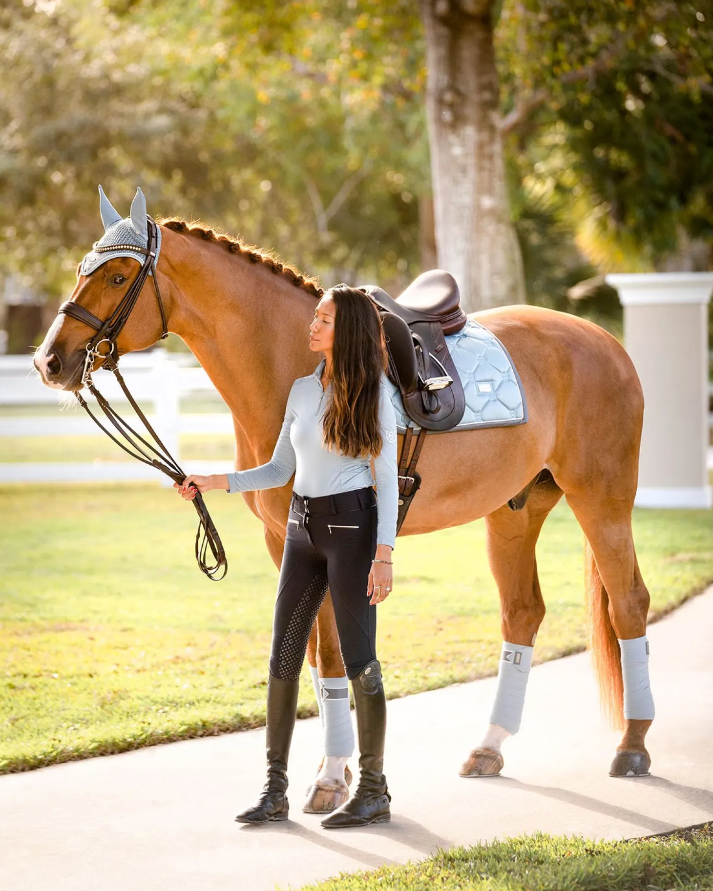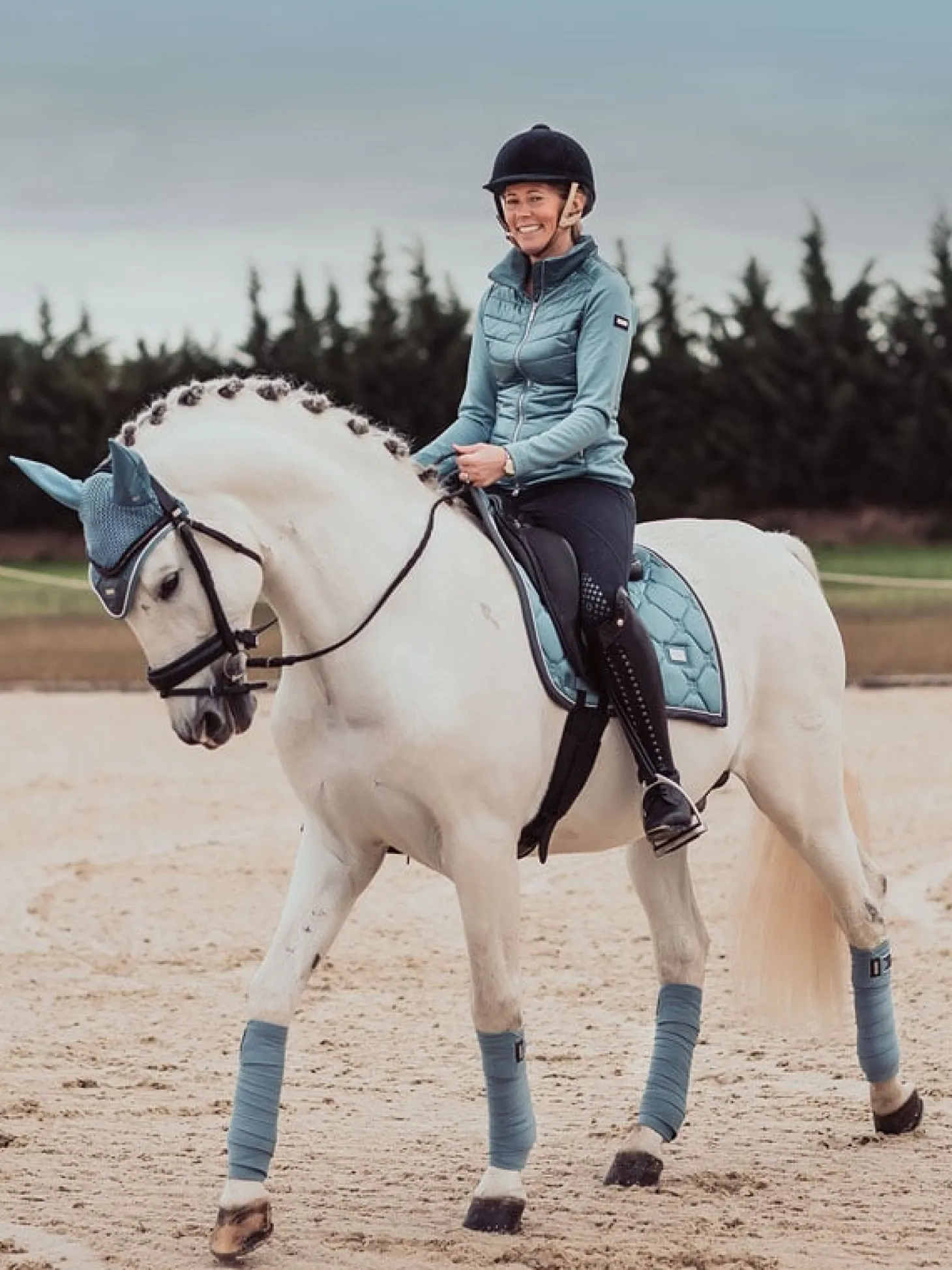 Die wundervolle Dressurschabracke bereitet ein wirklich luxuriöses Gefühl, perfekt für das Training. Hellblau mit einem grau Band und Weiß Kordeln eingefasst. Das Außenmaterial der Schabracke ist glänzend und schmutzabweisend mit schnelltrocknendem Stoff an der Innenseite. Sie passt perfekt zu unseren anderen Produkten der Steel blue Kollektion.