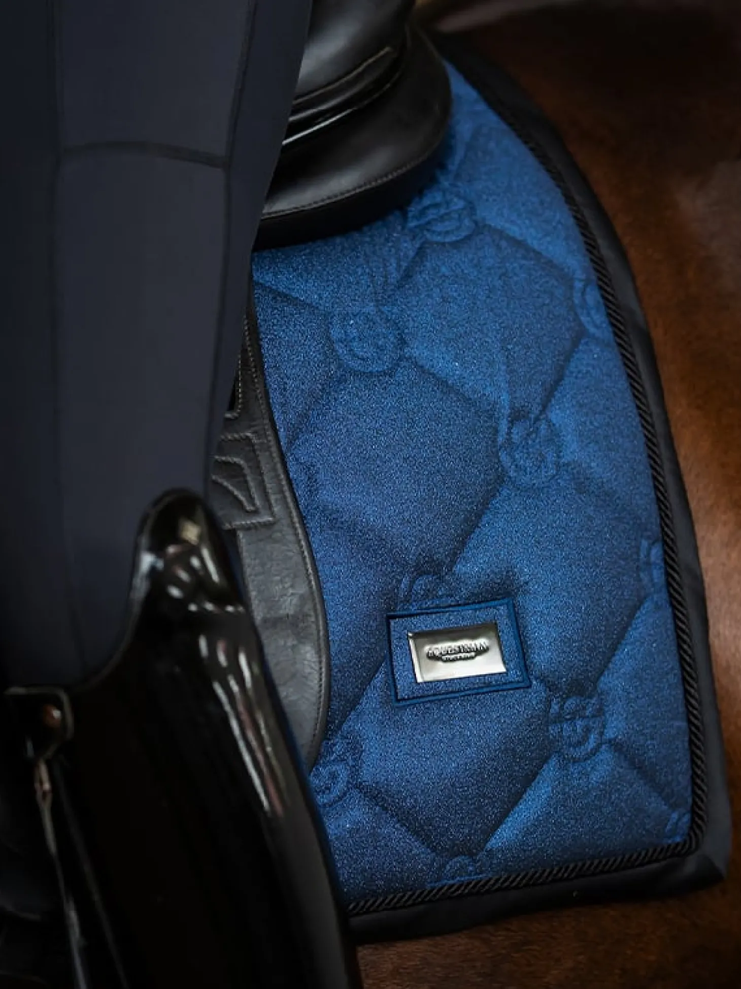 Details: Silbernes Equestrian Stockholm Logo auf der oberen Bindung / Strapazierfähiger Schutzaufnäher unter dem Klettverschluss am Sattelgurt in der Farbe Schwarz