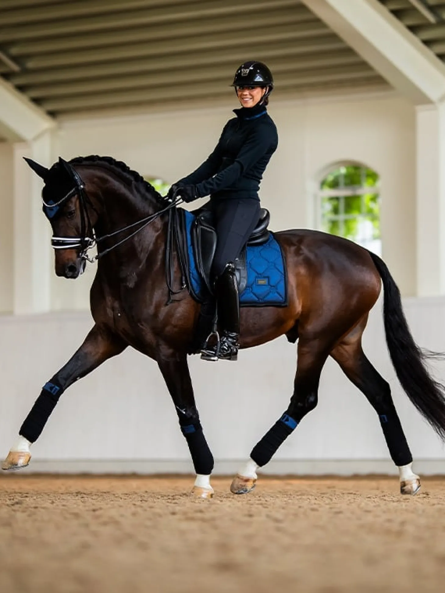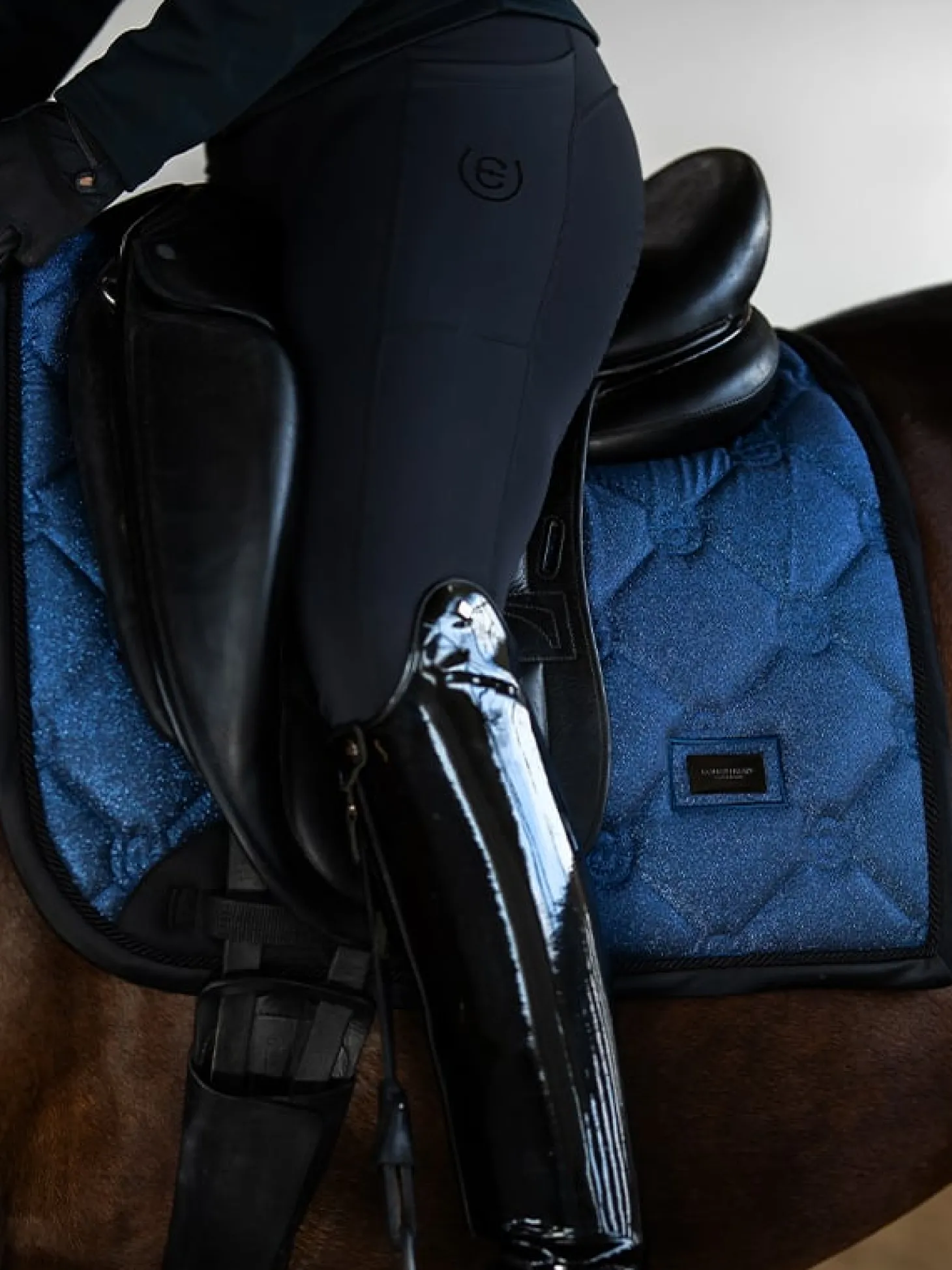 Elegante Schabracke in blauem Glimmer mit schwarzen Details. Dekoriert mit einem Equestrian Stockholm Logo in Schwarz. Das Material ist mit High IQ Cool Comfort behandelt, wodurch die Schabracke schnell trocknet und feuchtigkeitsableitend ist. Dadurch bleibt Ihr Pferd länger trocken und frisch. Unter dem Klettverschluss am Sattelgurt, wo die Schabracke am stärksten beansprucht wird, haben wir einen dauerhaften Schutzstreifen angebracht. Kombinieren Sie die Schabracke mit anderen Teilen aus unserer Polar Night Glimmer Kollektion für einen stilvollen Look von Kopf bis Fuß.