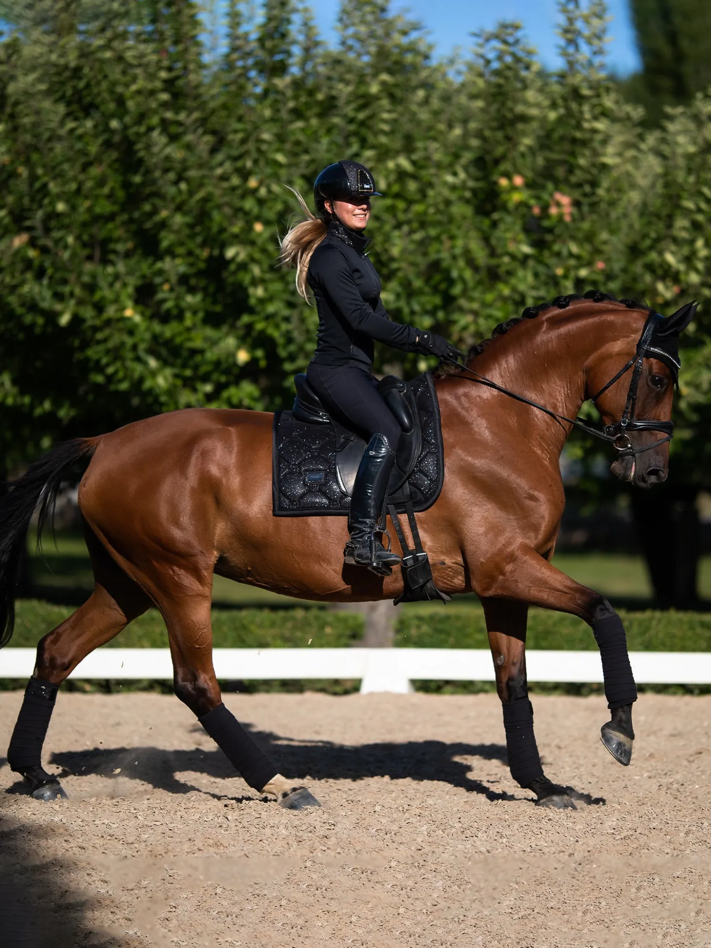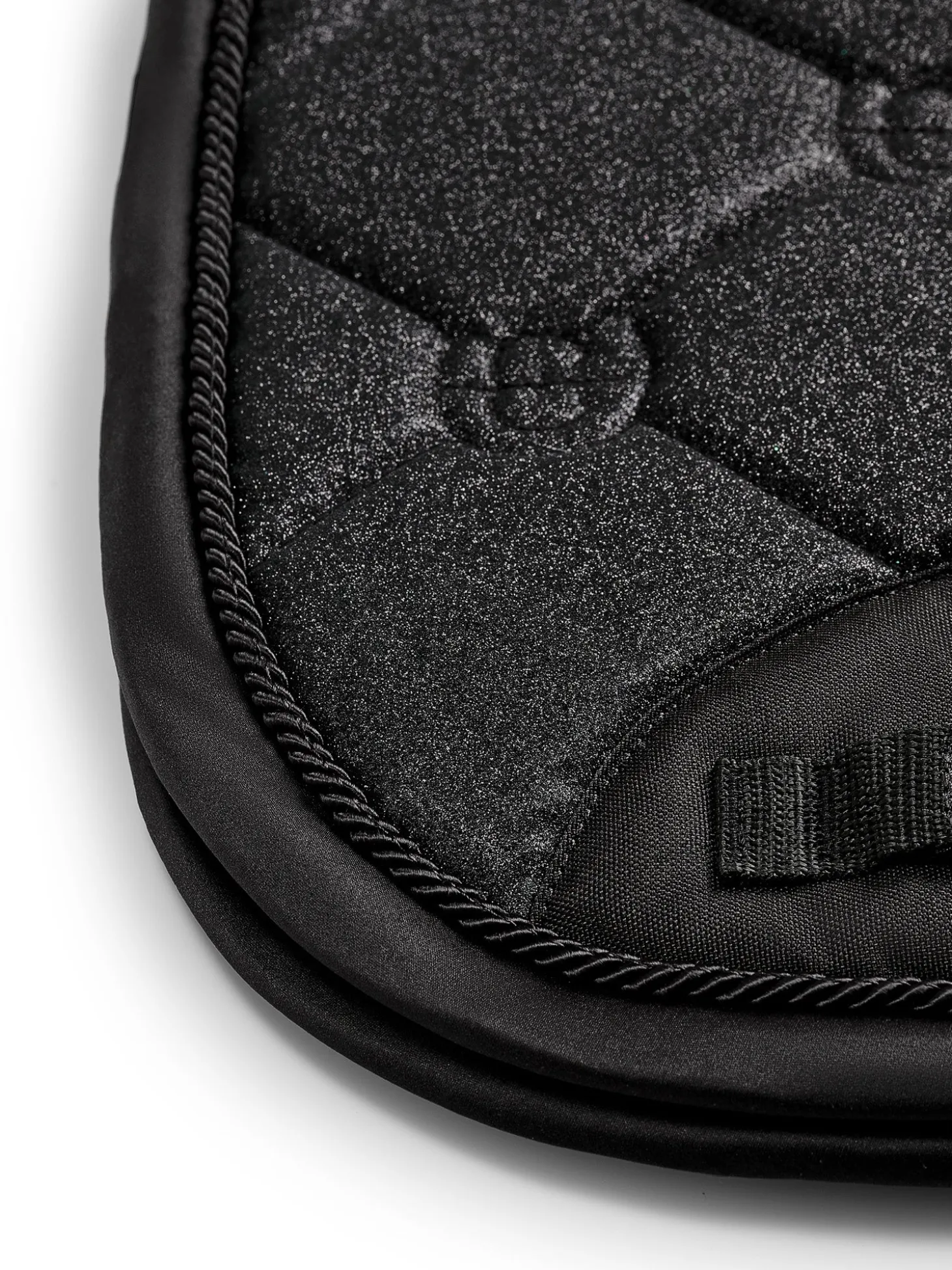 Elegante Schabracke in Schwarz Glitzer mit schwarzen Details. Dekoriert mit unserem Equestrian Stockholm Abzeichen in schwarz. Das Material ist mit High IQ kühlen Komfort behandelt und sorgt somit für schnell trocknende und feuchtigkeitstransportierende Eigenschaften. Dies hilft Ihrem Pferd, länger trocken und frisch zu bleiben. Unter dem Klettverschluss am Sattelgurt, wo die Schabracke am stärksten beansprucht wird, haben wir einen dauerhaften Schutzstreifen angebracht. Kombinieren Sie die Schabracke mit anderen Teilen aus unserer All Black Glimmer Kollektion für einen stilvollen Look von Kopf bis Fuß.