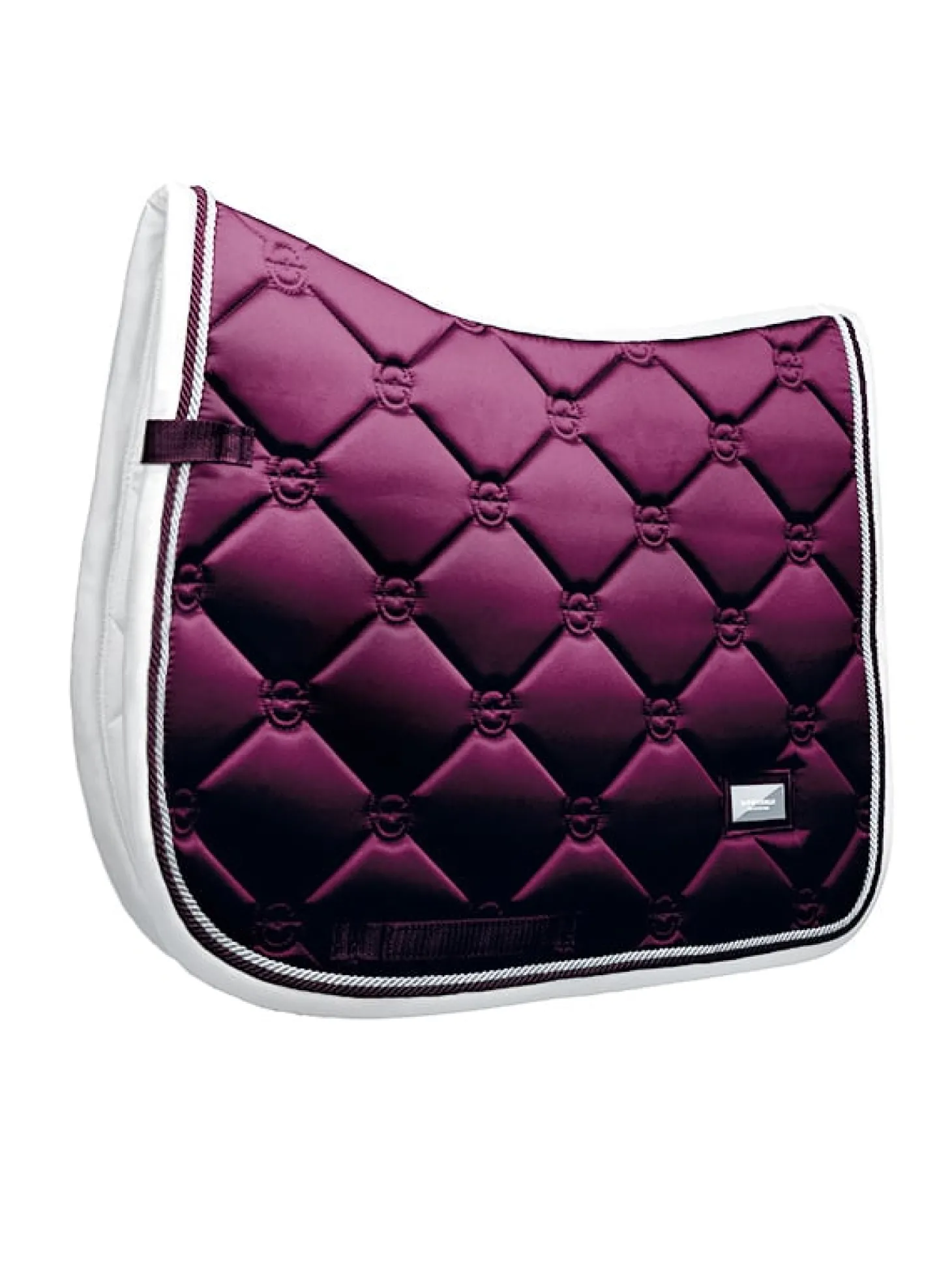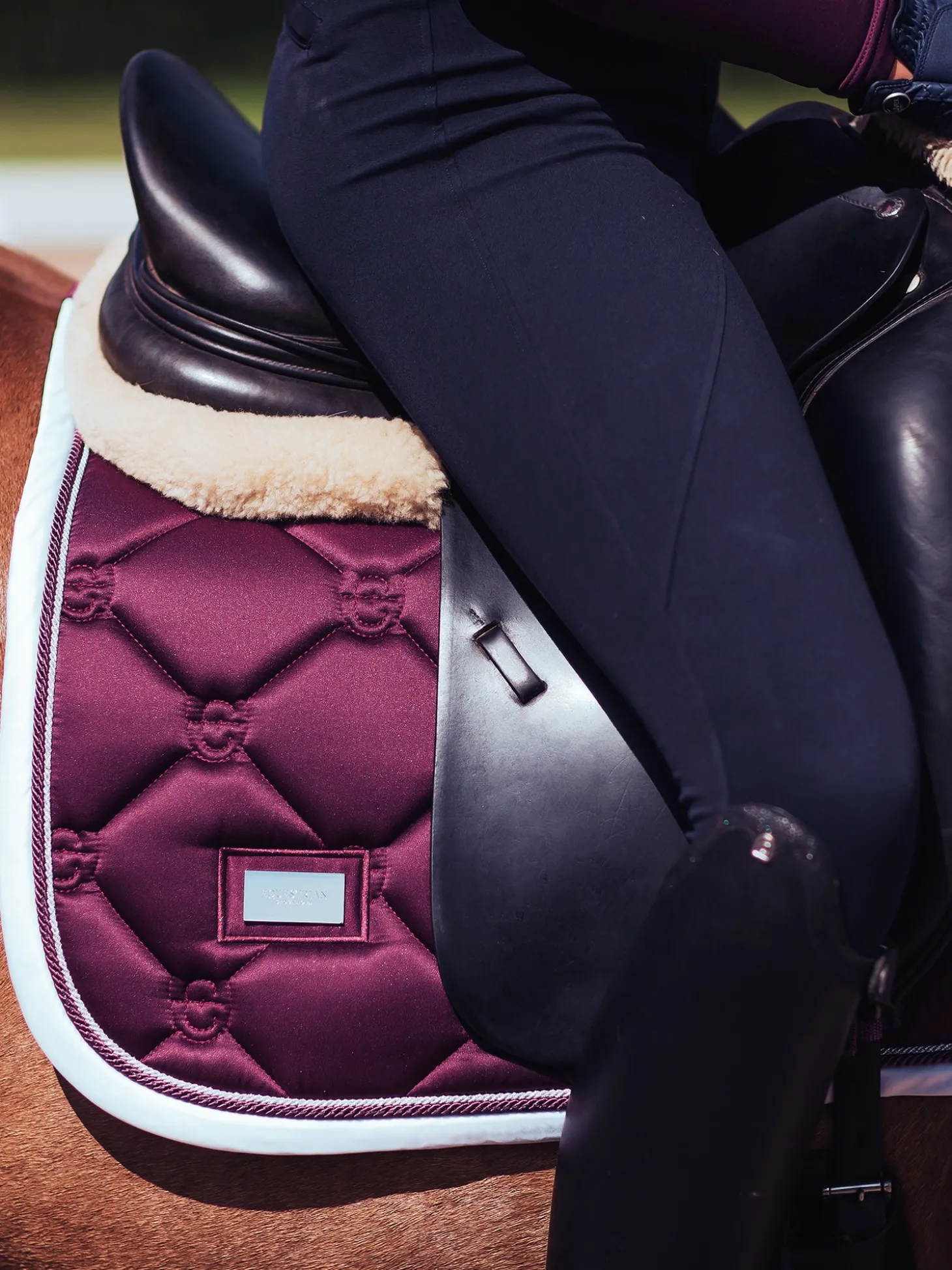 Die Schabracke besticht durch ihre dunkelviolette Farbe mit einem Hauch von Weiß und Kordeln in Silber und passendem Lila. Die Steppung mit stilvollem Equestrian Stockholm Logo.