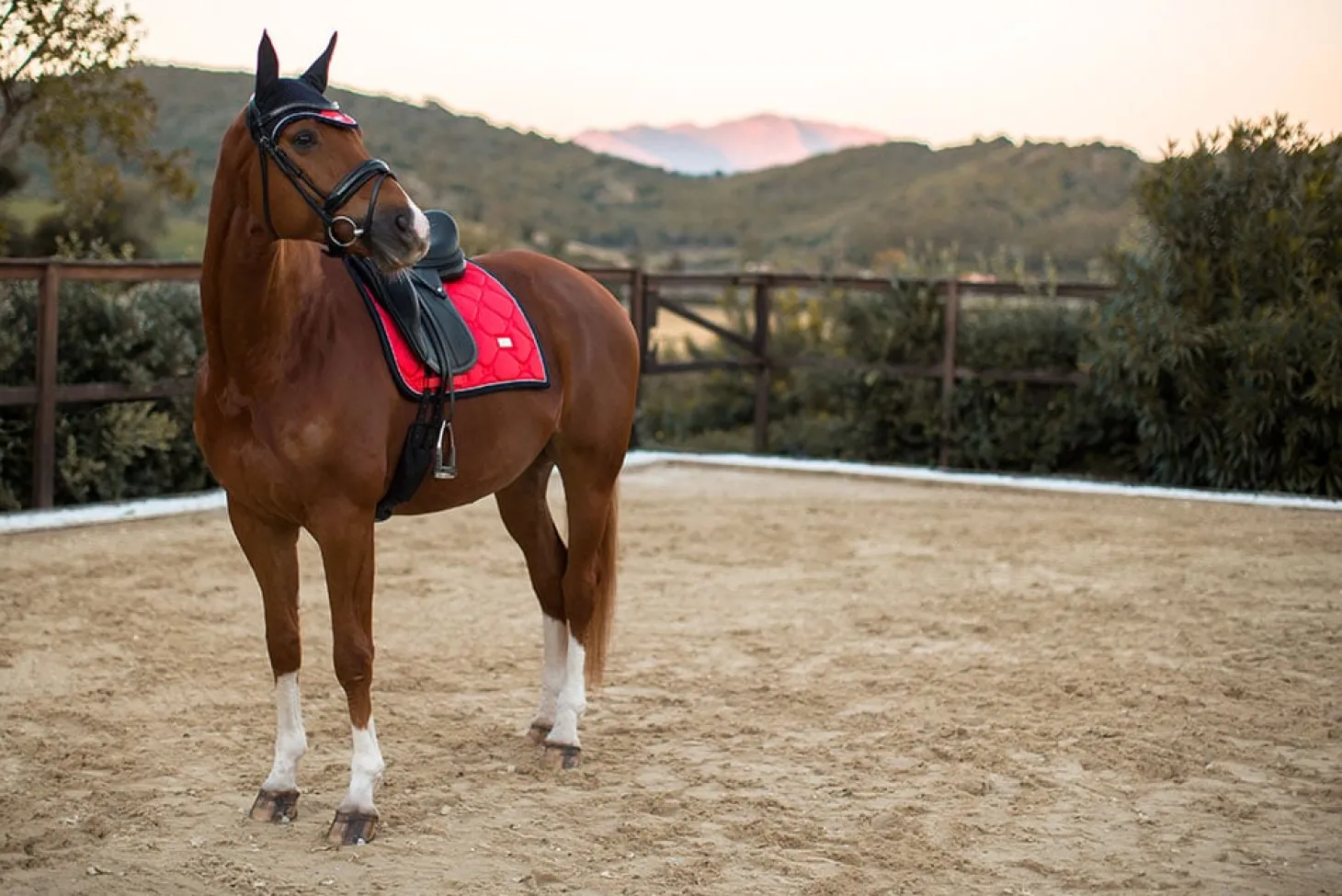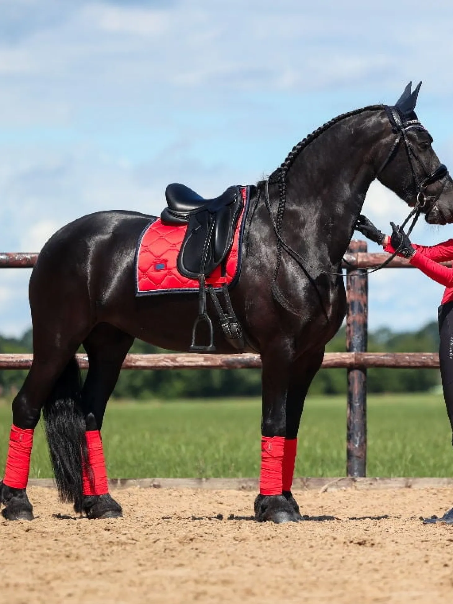 In unserer hochwertigen Dressurschabracke wird Shiny Grenadine Red mit einem Saum in Dark Navy Blue und silberfarbenen Details kombiniert.