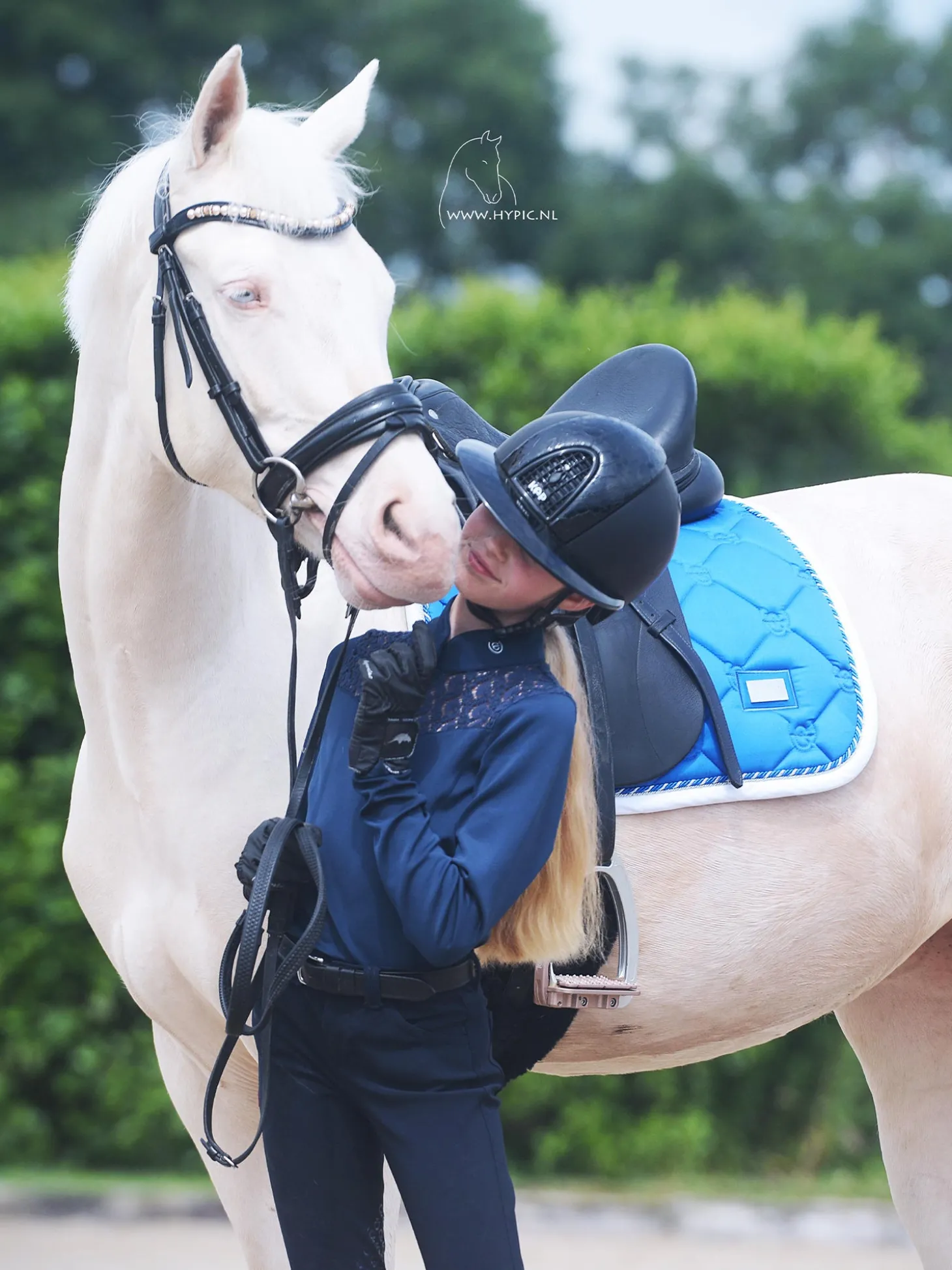 Frische blaue Farbe mit weißer Einfassung und schönen Details in Silber. Gesteppt in Mustern mit dem luxuriösen Logo von Equestrian Stockholm.