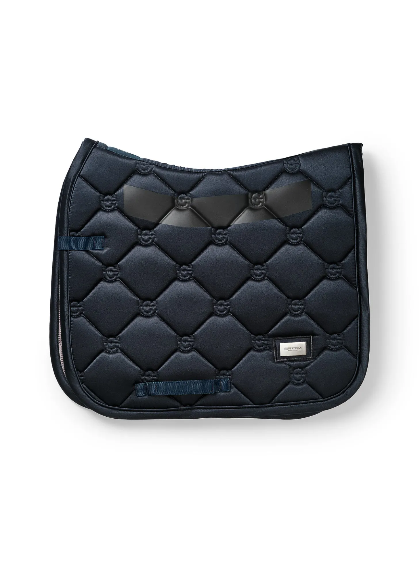 Details: Breites Silikon Grip Panel auf der Sattelfläche in Schwarz / Marineblaues Top Binding mit weißem Equestrian Stockholm Logo