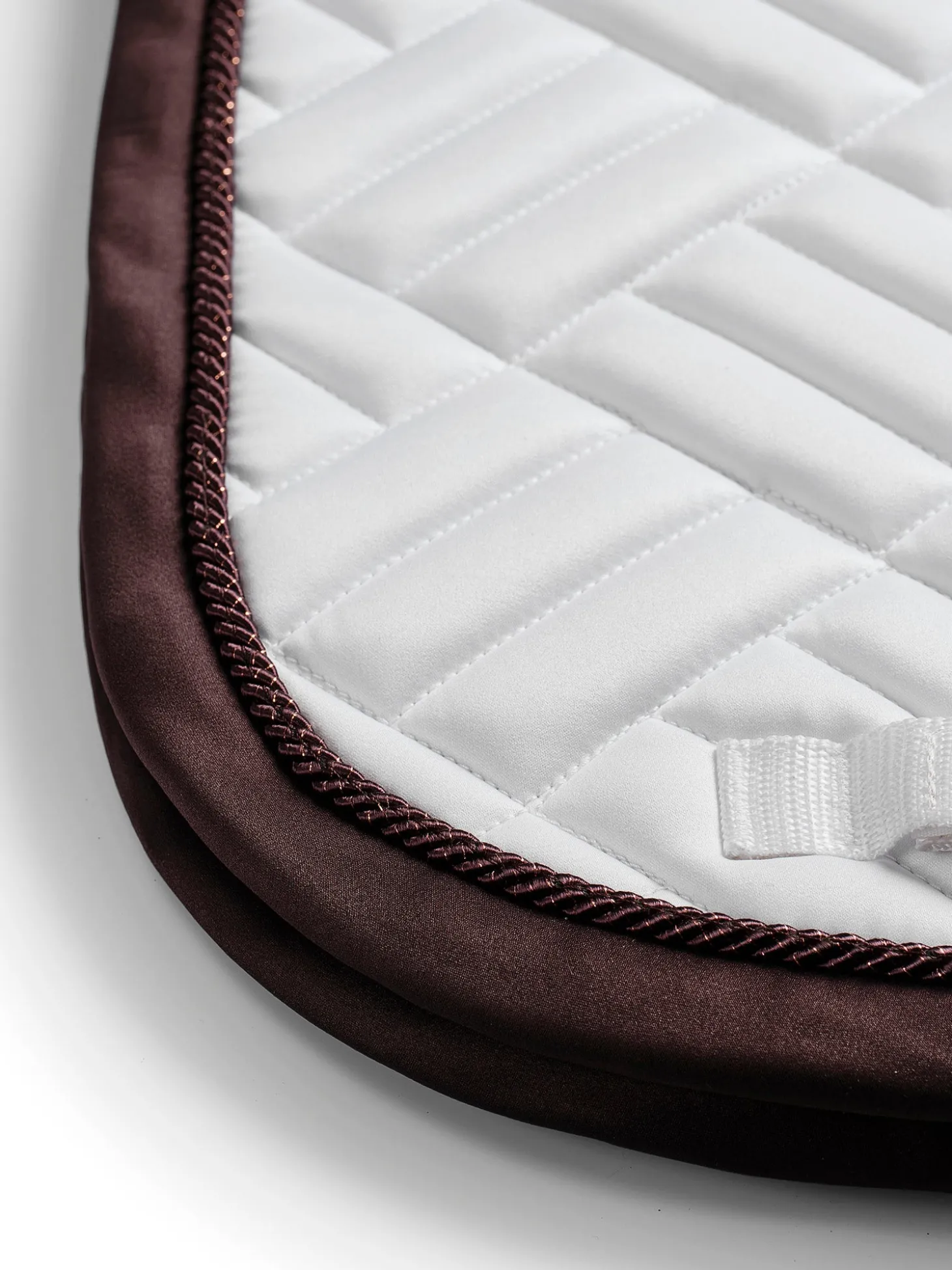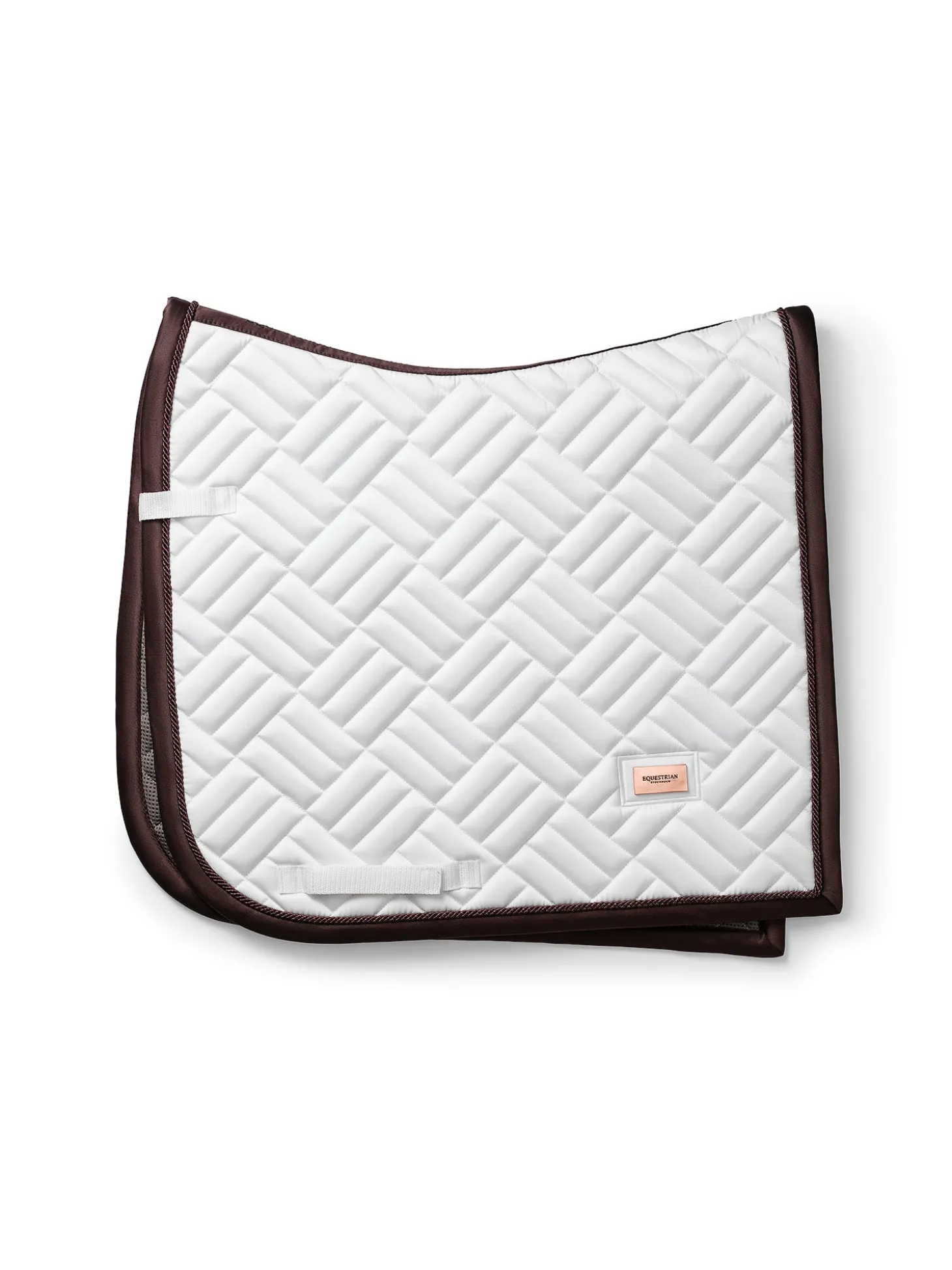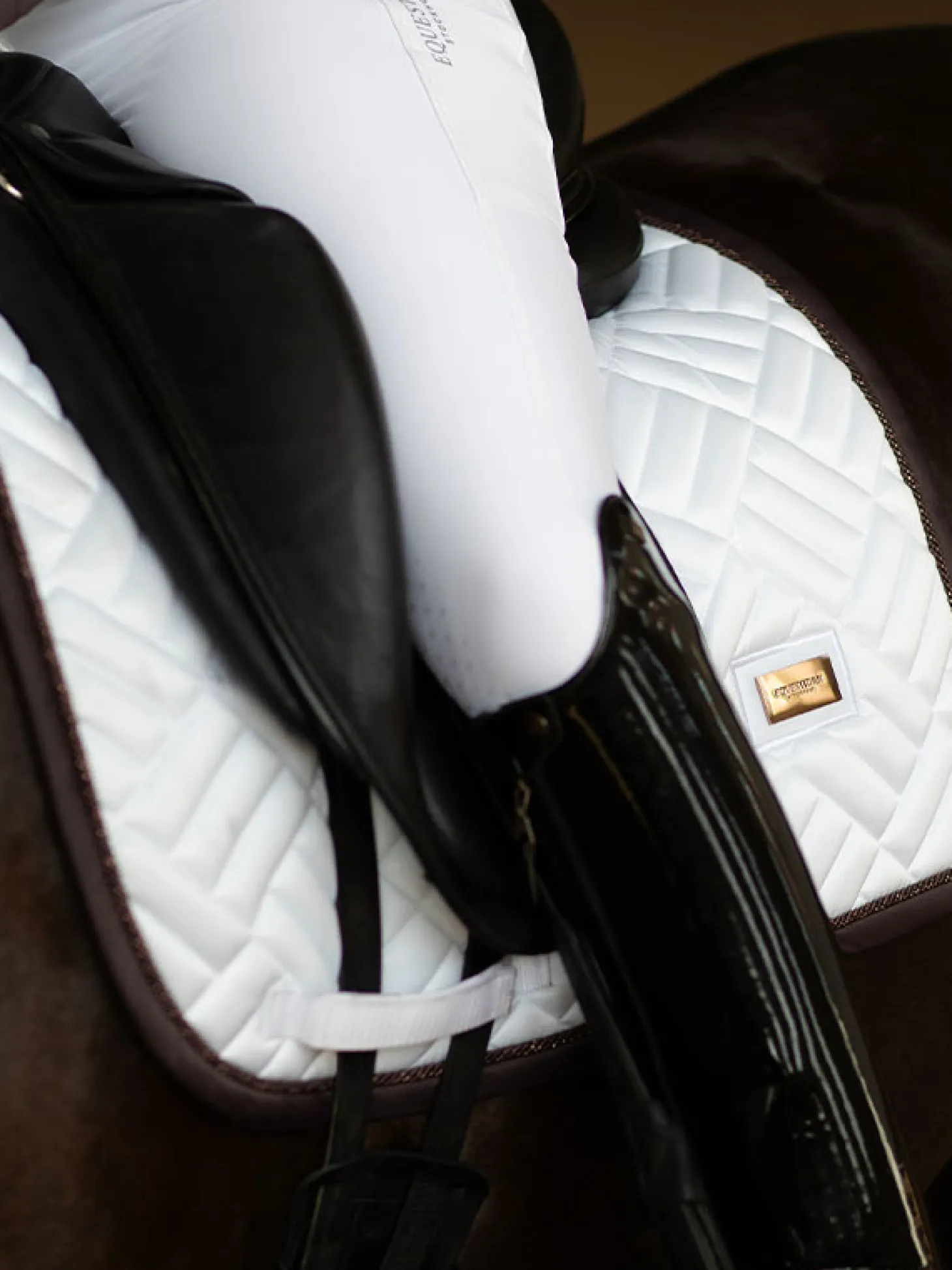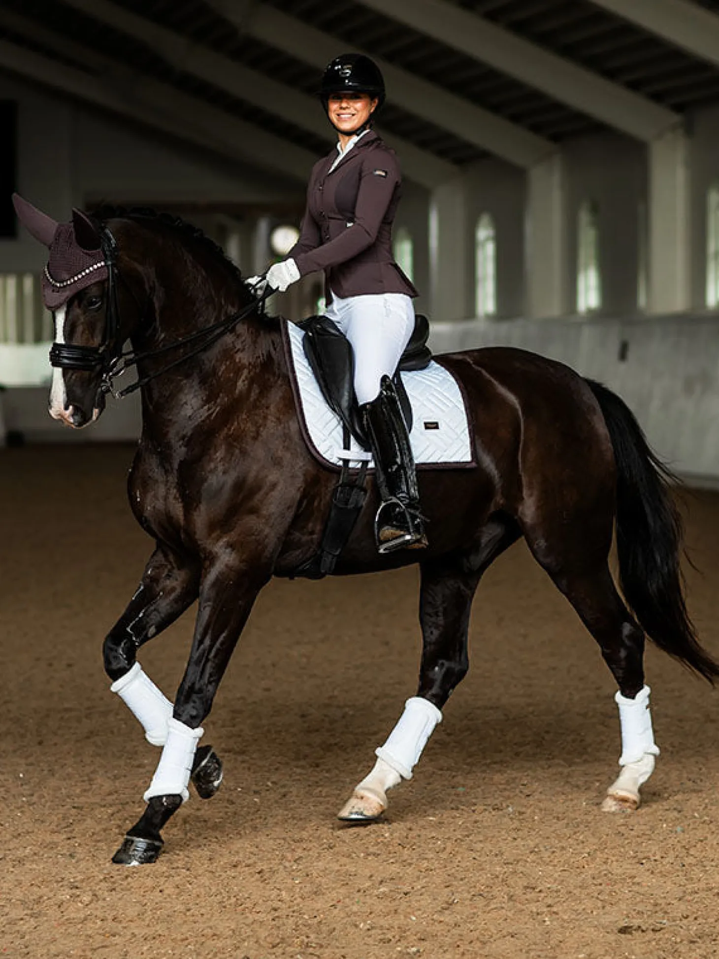 Elegante Schabracke mit moderner Labyrinth Steppung in Weiß mit braun/lila und roségoldenen Details. Verziert mit dem Equestrian Stockholm Abzeichen in Roségold. Das Bambusmaterial ist aufgrund seiner thermoregulierenden Wirkung das ganze Jahr über perfekt – kühlend im Sommer und wärmend im Winter. Außerdem ist es schnelltrocknend, feuchtigkeitsableitend und antibakteriell. Kombinieren Sie die Schabracke mit anderen Teilen aus der Moonless Night Kollektion für einen stilvollen Look von Kopf bis Fuß.