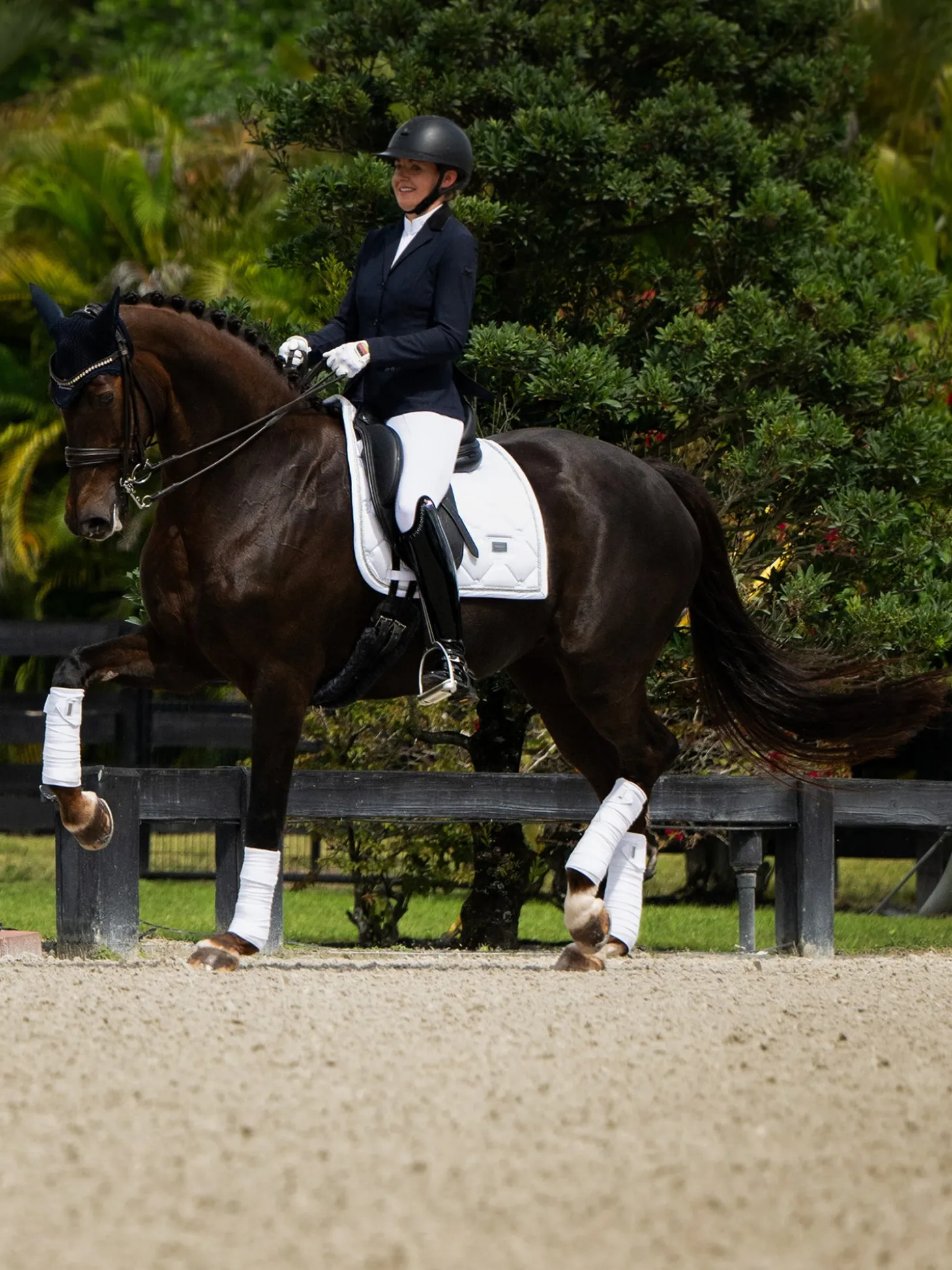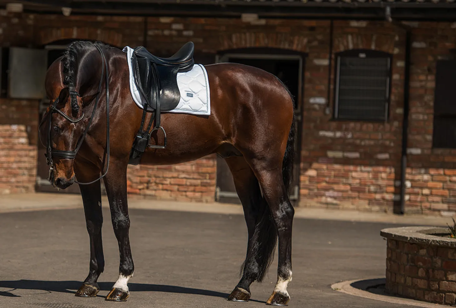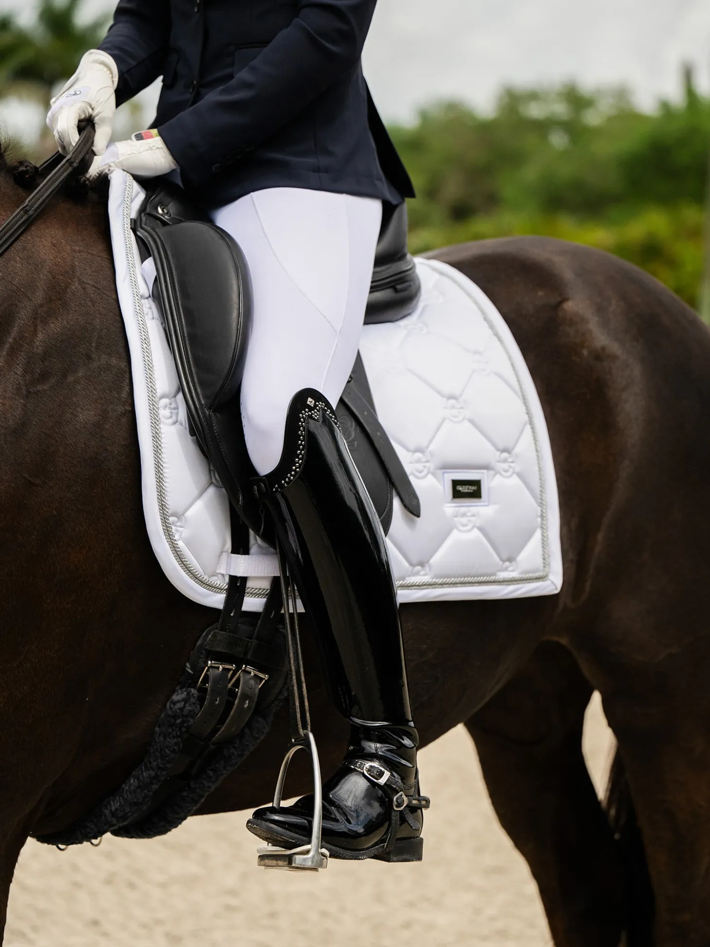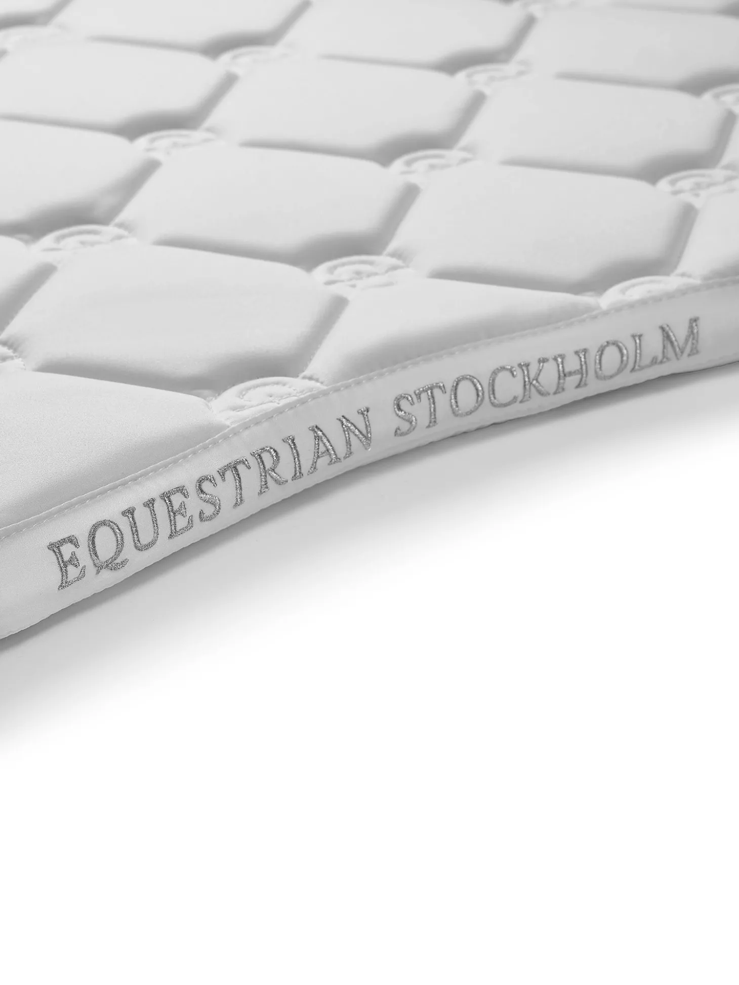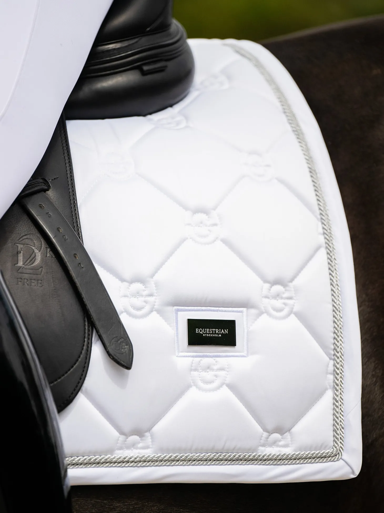 Schöne Dressurschabracke in White mit silberfarbenen Details und einem Muster aus dem Logo von Equestrian Stockholm.