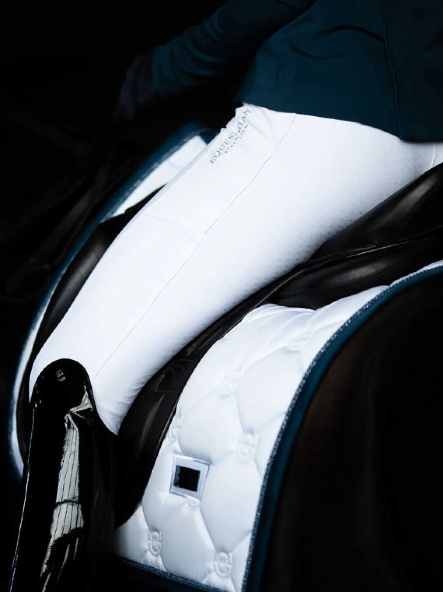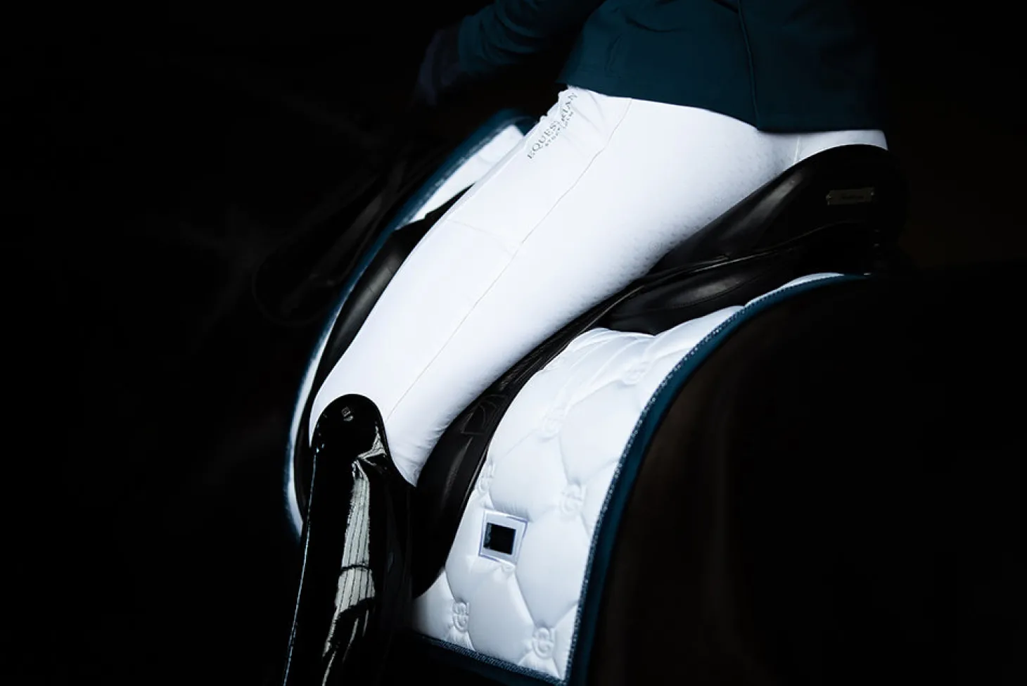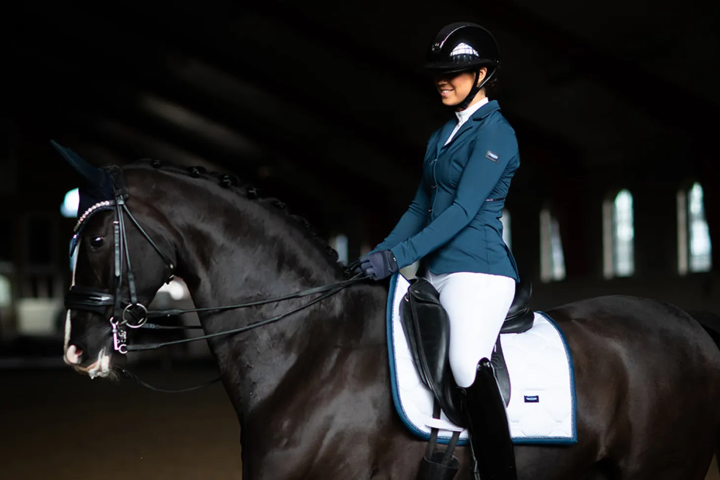 Elegante Schabracke in Weiß mit blauen und blaumetallischen Details. Verziert mit dem Equestrian Stockholm Abzeichen in Dunkelblau. Das Bambusmaterial ist aufgrund seiner thermoregulierenden Wirkung das ganze Jahr über perfekt – kühlend im Sommer und wärmend im Winter. Außerdem ist es schnelltrocknend, feuchtigkeitsableitend und antibakteriell. Kombinieren Sie die mit anderen Teilen aus der Blue Meadoow Kollektion für einen stilvollen Look von Kopf bis Fuß.