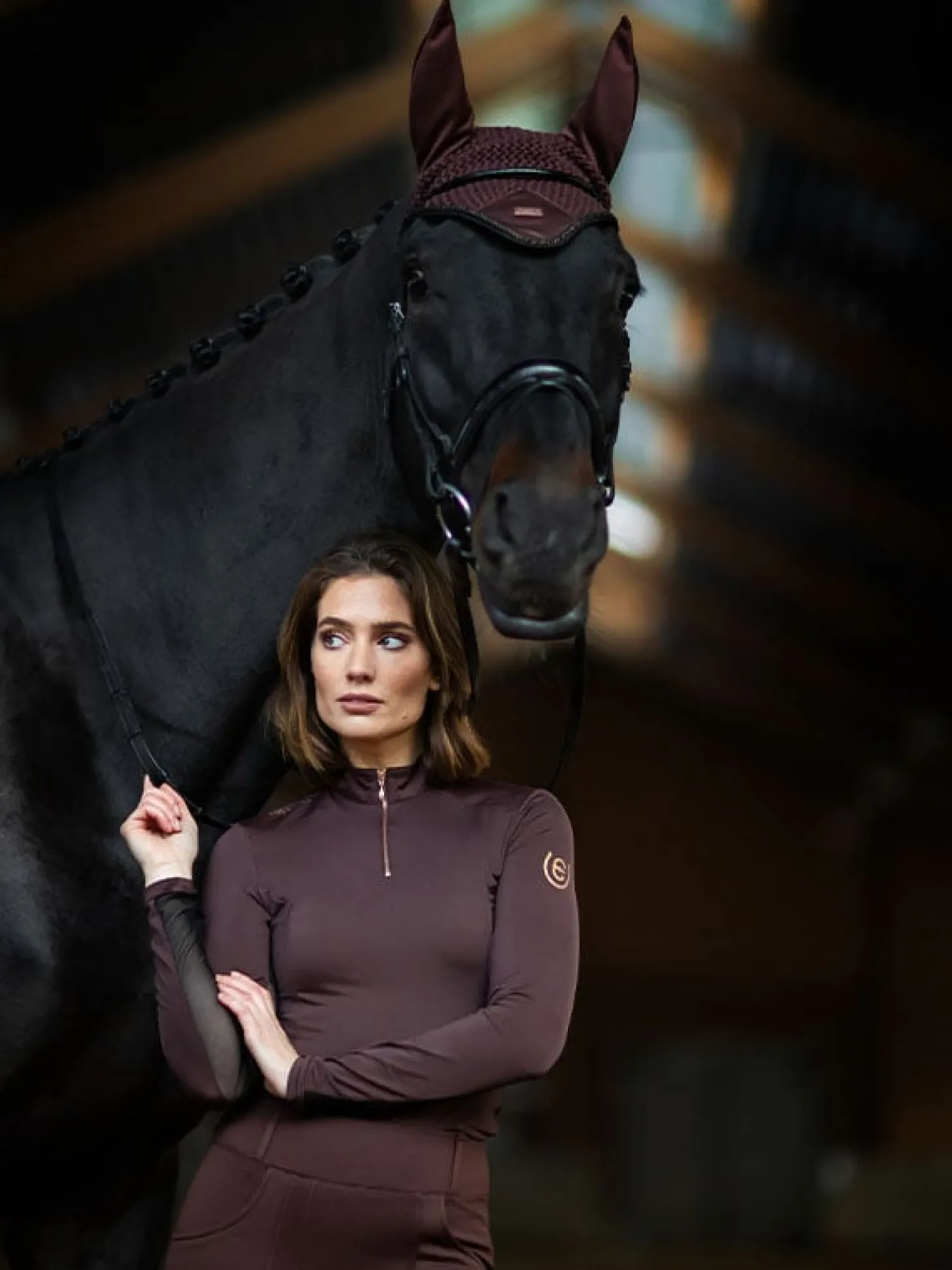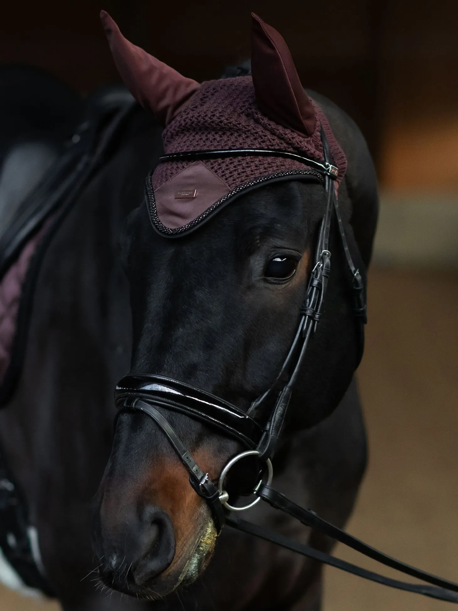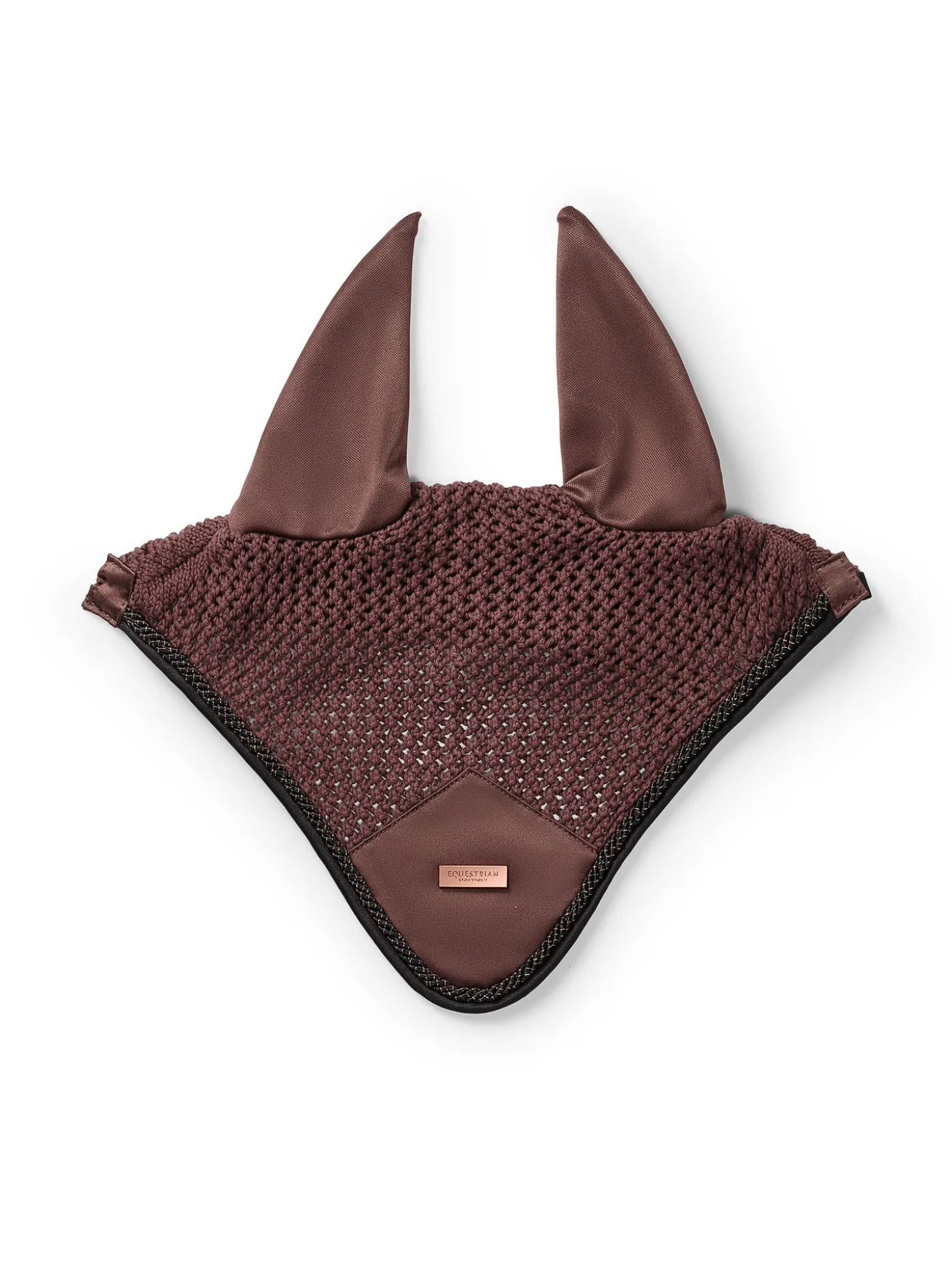 Luxuriöse gehäkelte Fliegenhaube in stilvollem Braun mit einem Hauch von Rot. Verziert mit einem Ton-in-Ton Satinaufnäher auf der Vorderseite, schönen schwarzen Paspeln und einem Equestrian Stockholm Abzeichen in Violettbraun. Die Fliegenhaube bietet sowohl Insektenschutz als auch Geräuschdämmung und hat einen elastischen Stoff an den Ohren für zusätzlichen Komfort.