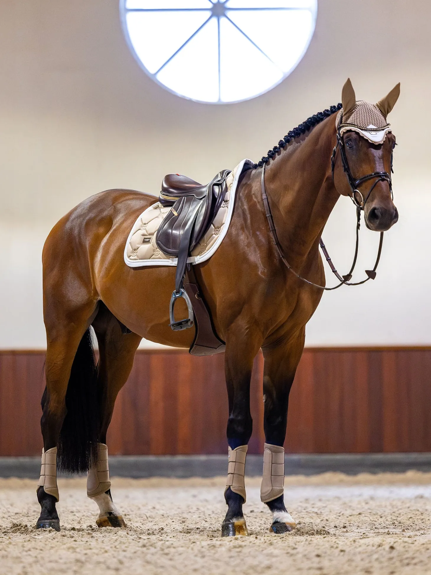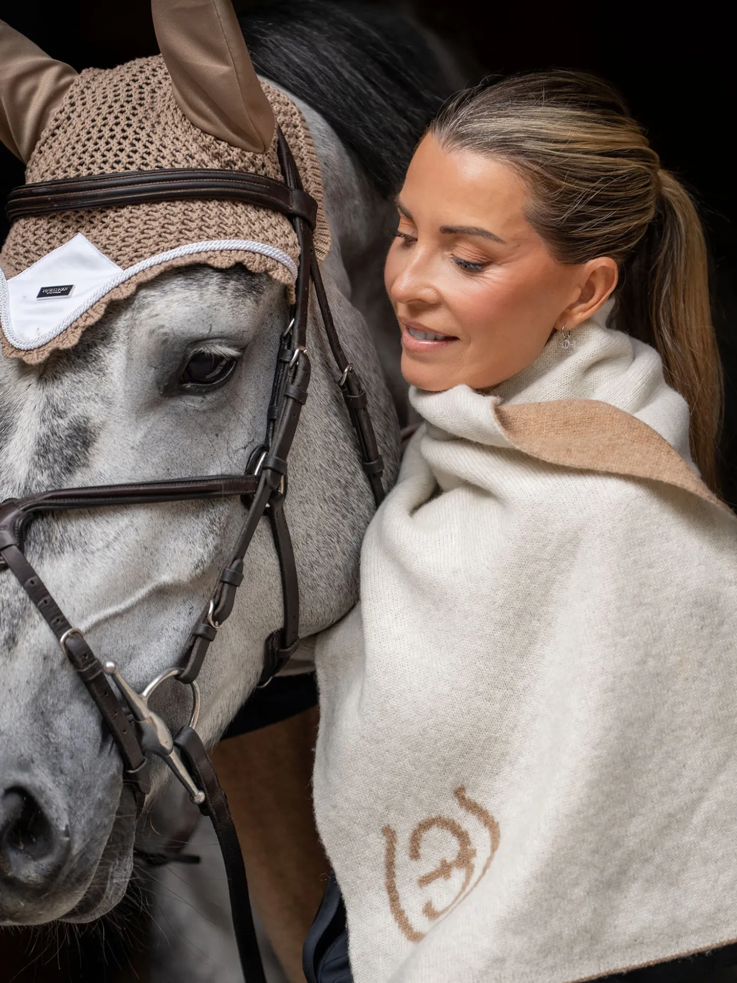 Luxuriöse gehäkelte Fliegenhaube in stilvollem Beige. Verziert mit einem weißen Satinaufnäher auf der Vorderseite, wunderschönen weißen und silbernen Paspeln und einem silbernen Equestrian Stockholm-Emblem. Die Fliegenhaube schützt vor Insekten und dämpft Geräusche. Für zusätzlichen Komfort ist sie an den Ohren mit elastischem Stoff versehen.