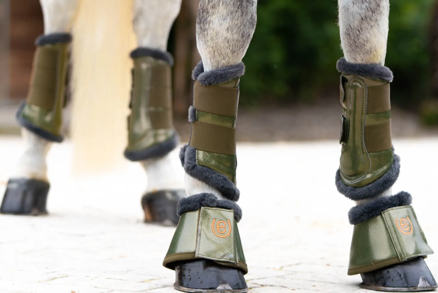 Werten Sie Ihren Stil mit diesen hochwertigen Hufglocken aus glänzendem Kunstleder mit Kroko-Imitat auf. Ein stilvolles Grün mit grauem Teddyfell auf der Innenseite zum Pferdebein. Die Hufglocken sind ca. 6 mm dick und Innen mit Neopren gefüttert, um effektiv Verletzungen der Fersenknolle zu verhindern. Die Hufglocken werden mit einem breiten Klettverschluss geschlossen, der mit dem Logo von Equestrian Stockholm in Rosé verziert ist. Kombinieren Sie Ihren Look mit den Gamaschen und Fleece Bandagen aus der gleichen Kollektion. Passt perfekt zur Striking Valley-Kollektion.