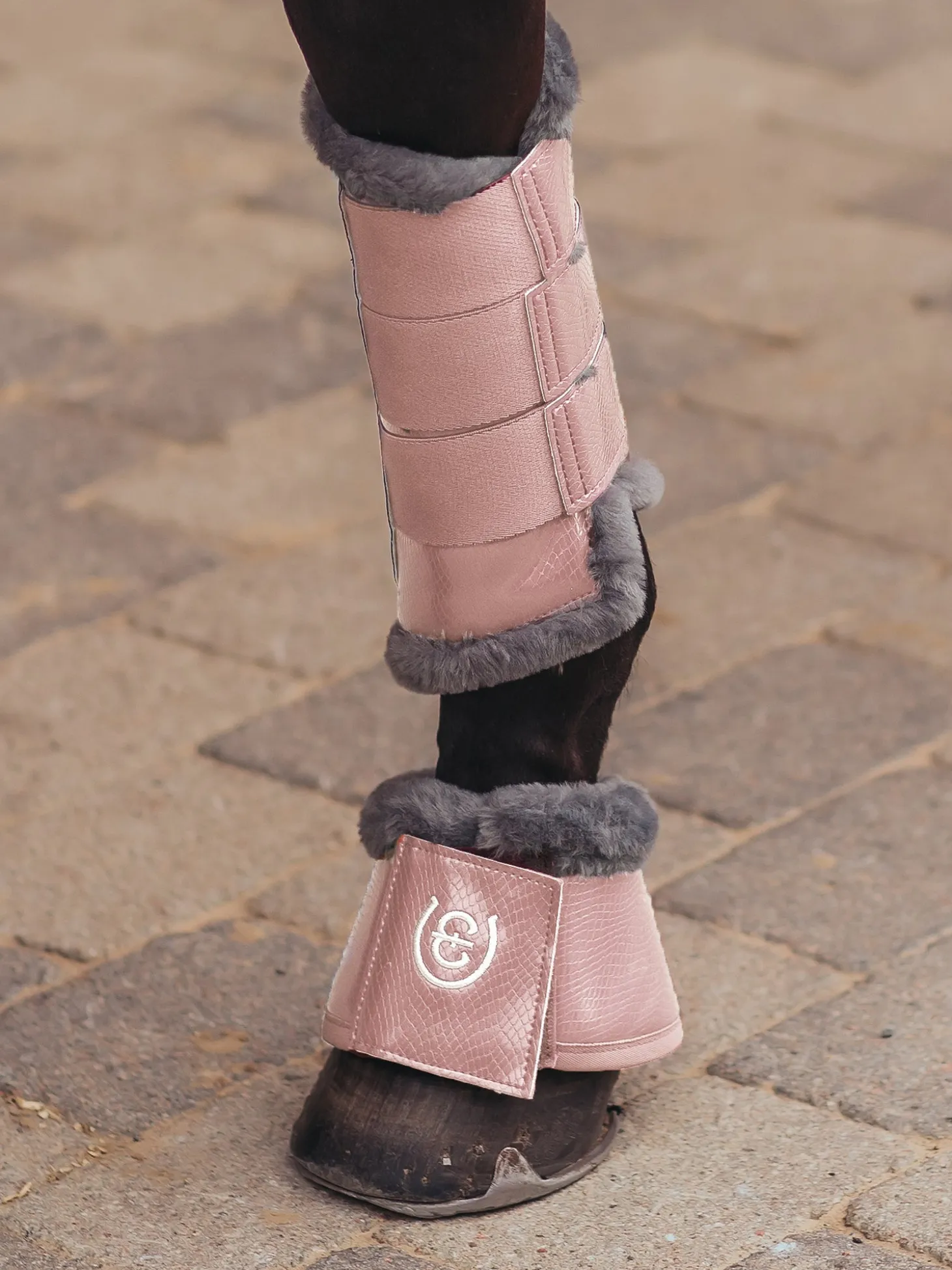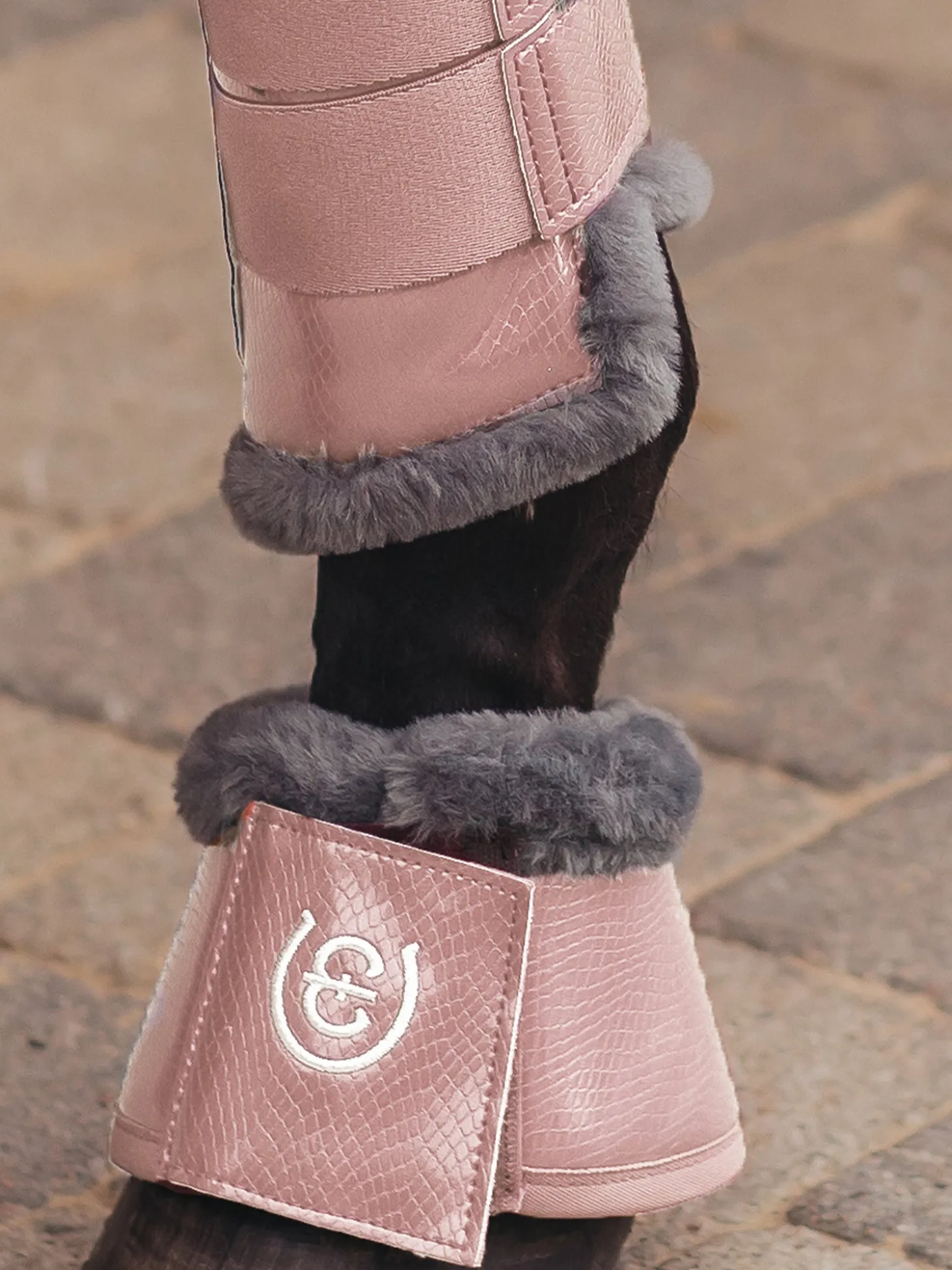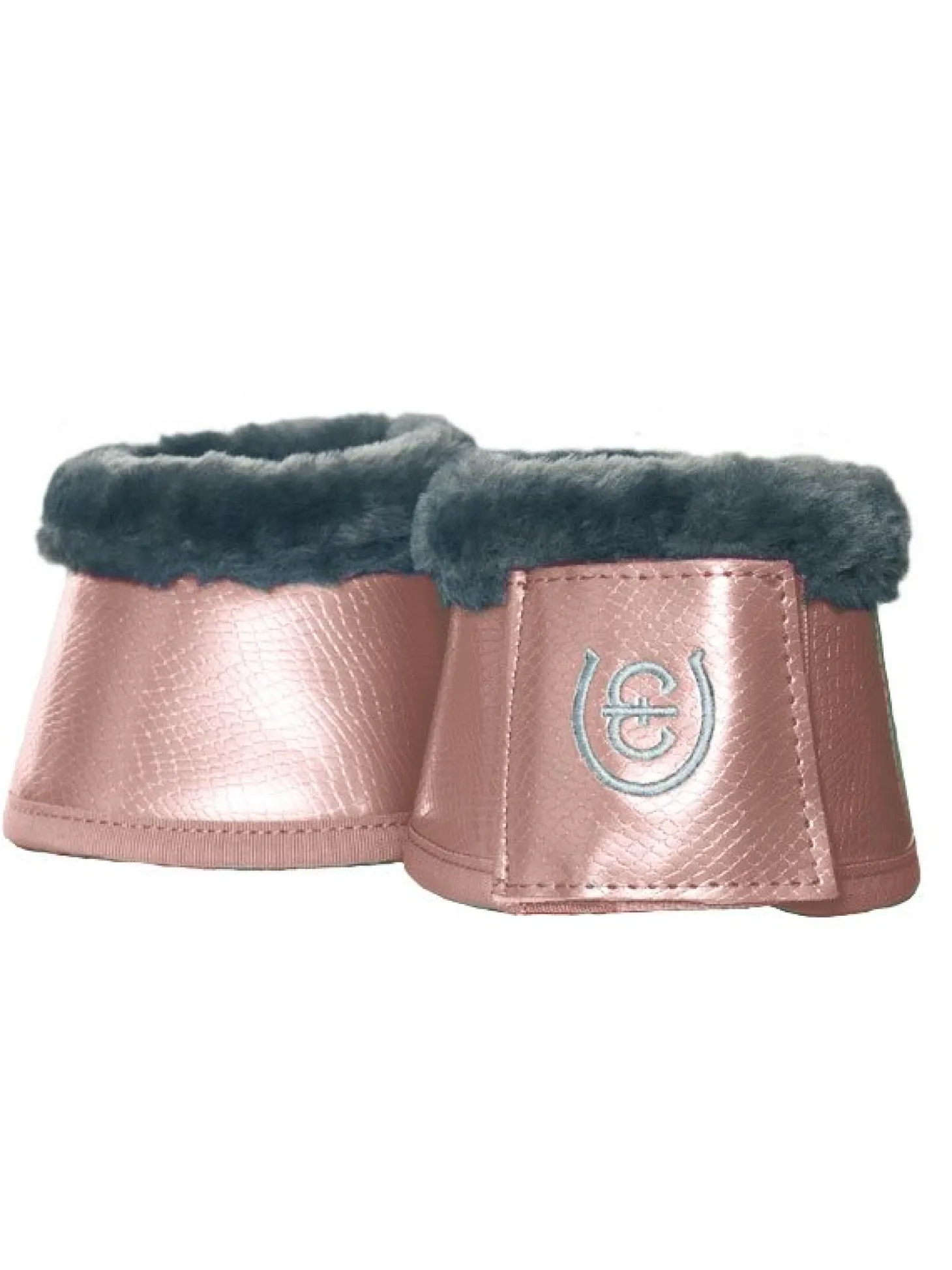 Verbessern Sie Ihren Look mit diesen hochwertigen Hufglocken aus glänzendem Kunstleder mit Krokodil-Imitat. Entworfen in elegantem Rosa mit stilvollen grauen Details. Superweiches grau Teddyfleece-Kunstfell auf der Innenseite gegen das Pferdebein. Die Hufglocken sind ca. 6 mm dick und innen mit Neopren gefüttert, welches effektiv Verletzungen an der Ferse des Pferdes verhindert. Die Hufglocken werden mit einem breiten Klettverschluss geschlossen, der mit dem Equestrian Stockholm-Logo verziert ist. Kombinieren Sie die Hufglocken mit den gamaschen aus unserer Pink Kollektion für einen kompletten Look.