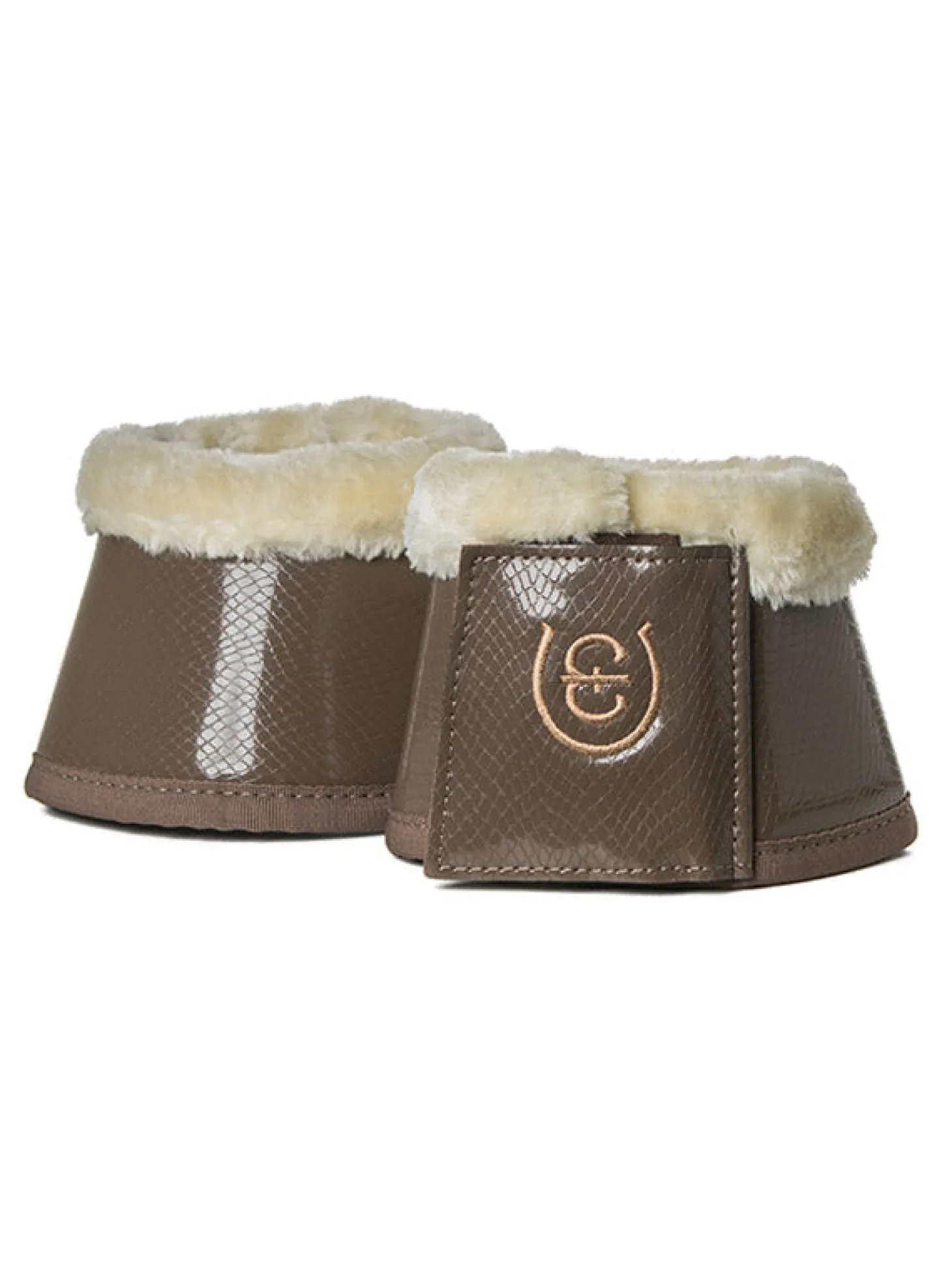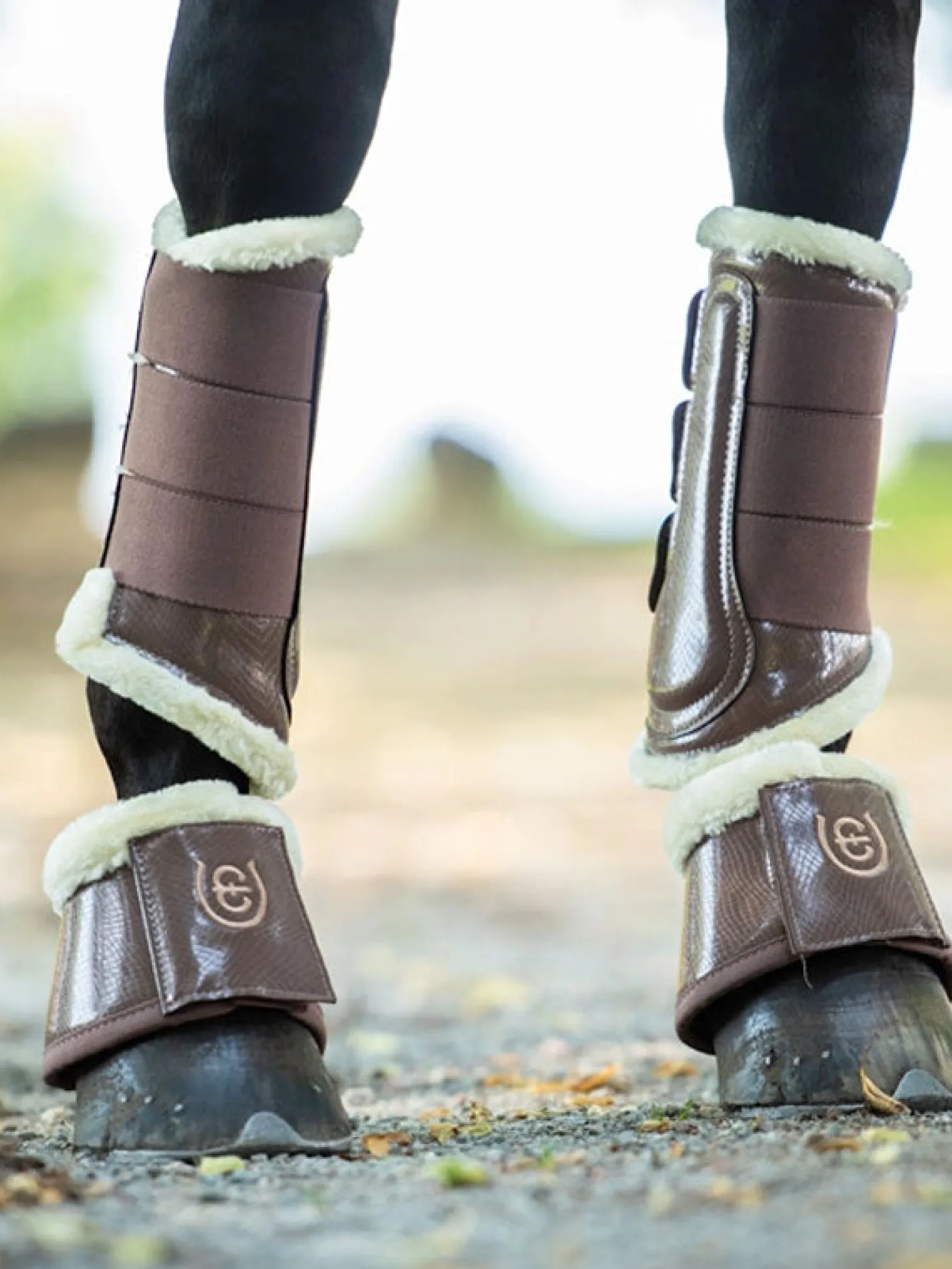 Stylische hochqualitative Hufglocken aus Schlangenleder-Imitat mit weichem Faux Fur Synthetik-Fellrand. Die Hufglocken sind etwa 6mm dick, die Innenseite ist mit Neopren ausgekleidet, welches den Hufballen effektiv vor Verletzungen schützt. Sie sind mit einem breiten Klettverschluss zu verschließen, verziert mit einem gestickten Equestrian Stockholm Logo. Außerdem passen sie perfekt den Gamaschen aus derselben Serie.