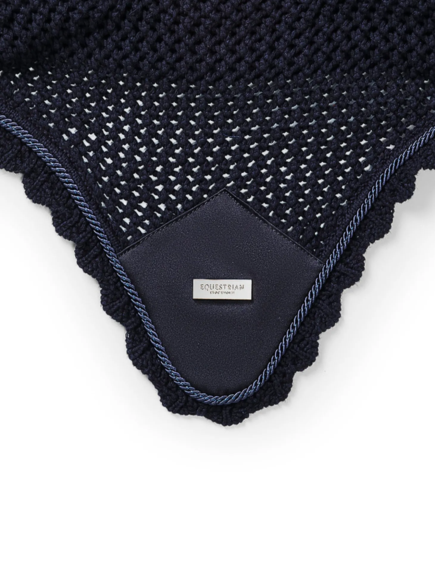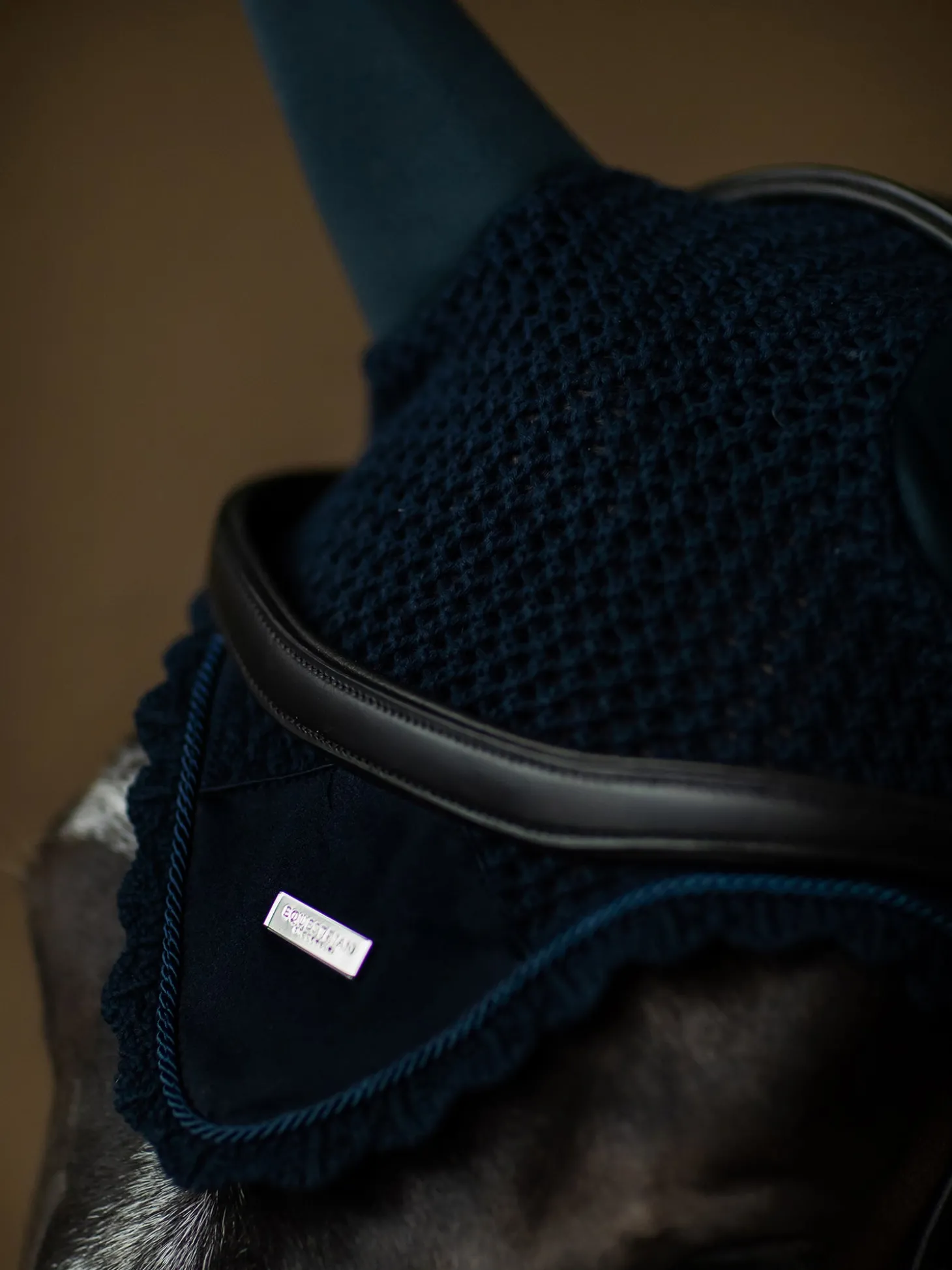 Diese Fliegenhaube passt zu allem! Hochwertige Fliegenhaube mit klarem Design und silberfarbenen Details. Die gehäkelte Fliegenhaube mit wattierten Ohren reduziert Geräusche auf ein Minimum.