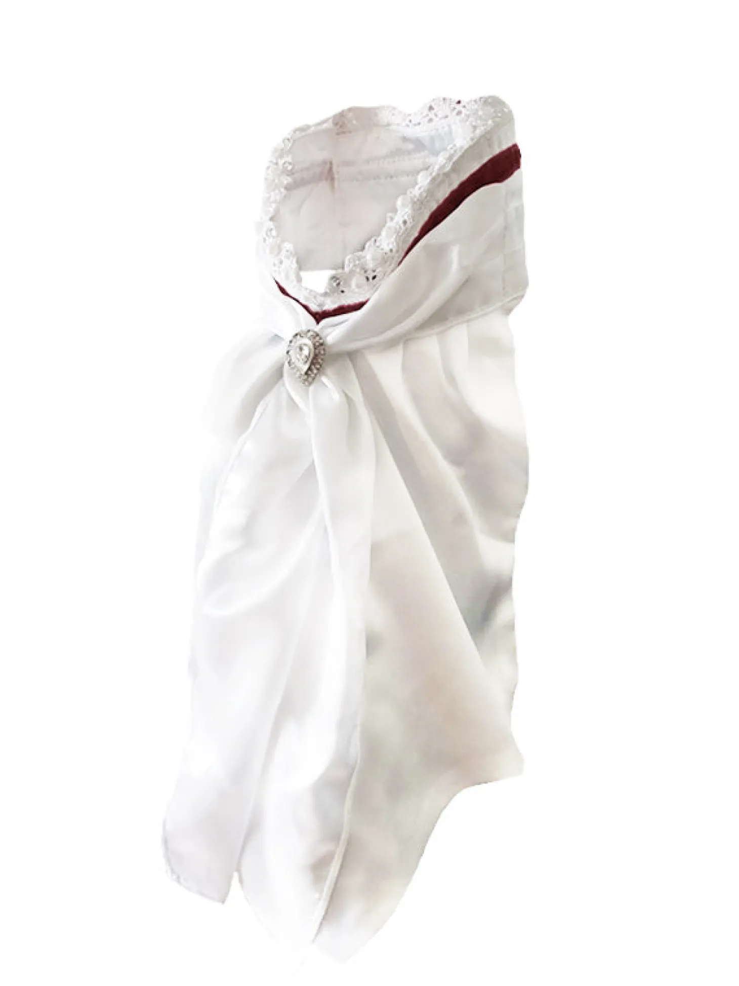 Ein luxuriöses Plastron mit drapiertem Satin und einer Kristallbrosche vorne. Samtdetail in Bordeaux.