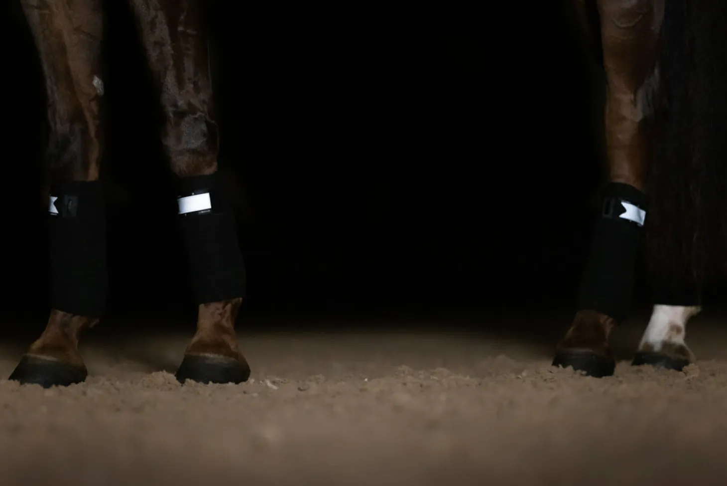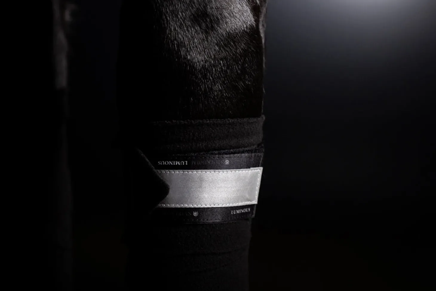 Hochwertige Fleecebandagen in schönem Schwarz. Verziert mit reflektierenden Details und dem Equestrian Stockholm Abzeichen in Tiefschwarz. Kombinieren Sie die Fleecebandagen mit der Schabracke und der Fliegenhaube aus der Kollektion Luminous Black für einen glamourösen Look. Verkauft im Viererset.