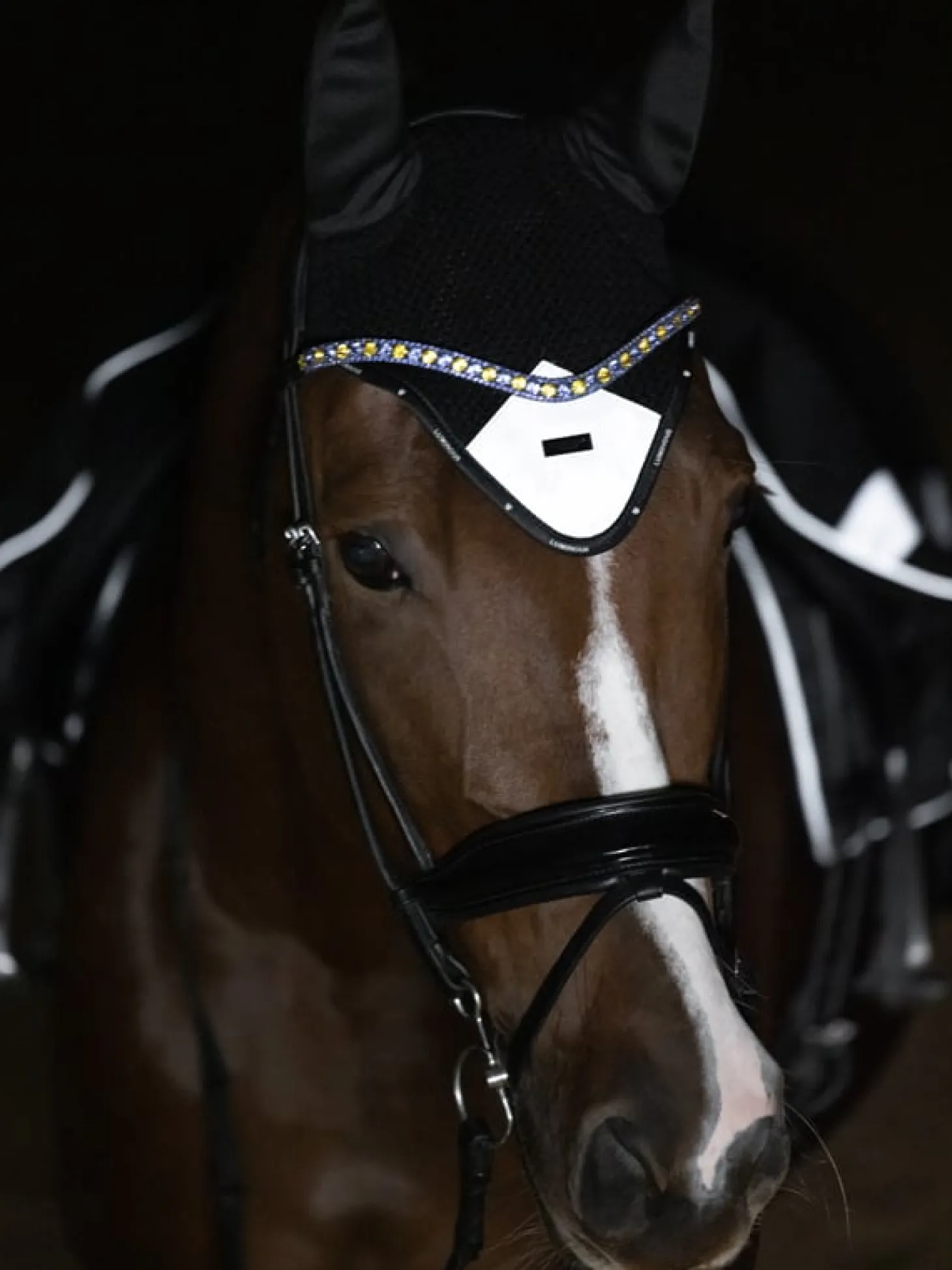 Fliegenhaube in einem schönen Design in Schwarz. Verziert mit einem Reflex-Patch auf der Vorderseite und einem schönen Chrom und Reflex Equestrian Stockholm Logo am Rand. Mit dem Equestrian Stockholm Abzeichen in tiefem Schwarz. Die Fliegenhaube dient sowohl als Insekten- als auch als Schallschutz und ist an den Ohren mit einem Gummizug versehen, der für zusätzlichen Komfort sorgt. Passt perfekt zur Schabracke aus der Kollektion Luminous Black.