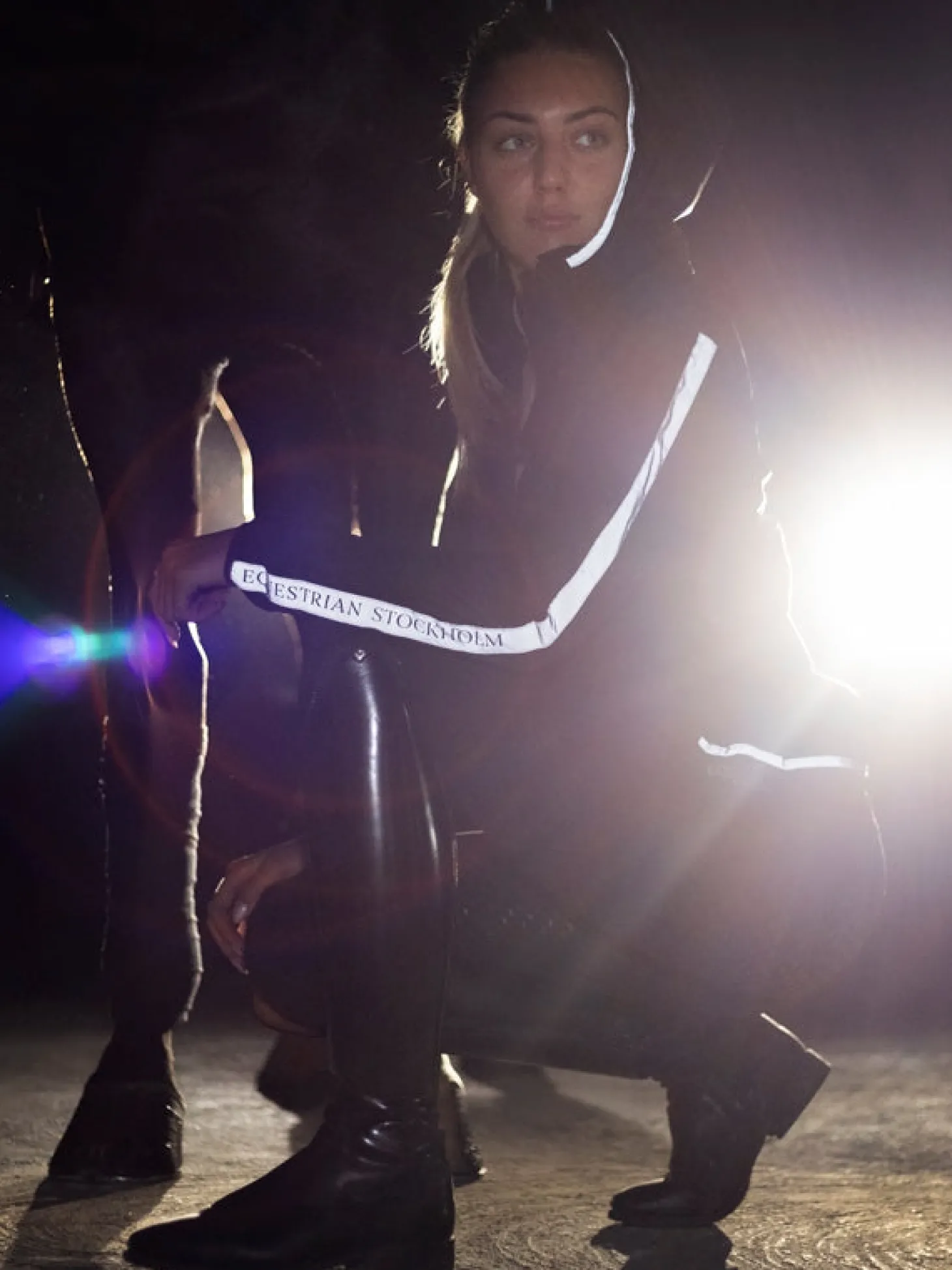 Details: Vertikales reflektierendes Paneel auf der hinteren Mitte mit dem Equestrian Stockholm Logo in Schwarz / Reflektierende Ärmeleinsätze auf beiden Ärmeln mit schwarzem Equestrian Stockholm Logo / Reflektierendes Band entlang des Saums / Reflektierendes Band entlang des abnehmbaren Kapuzenrands / Reflektierendes Logo auf der linken Seite der Kapuze / Reflektierendes Logo am vorderen Kragen, sichtbar wenn die Kapuze vorne abgenommen ist / 2 Seitentaschen