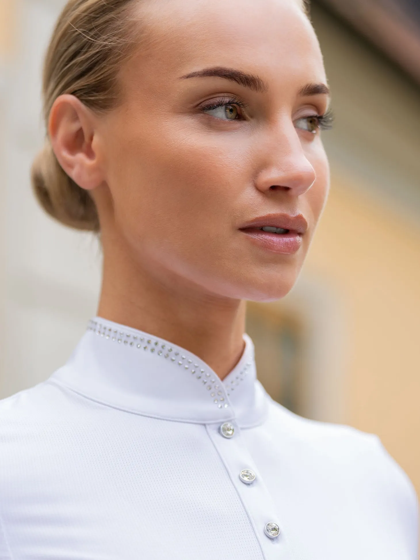Details: Small Equestrian Stockholm logo in silver on the left side of the collar/ Small clear crystals, 2 rows along the whole collar edge/ Small diamond buttons at center front opening.