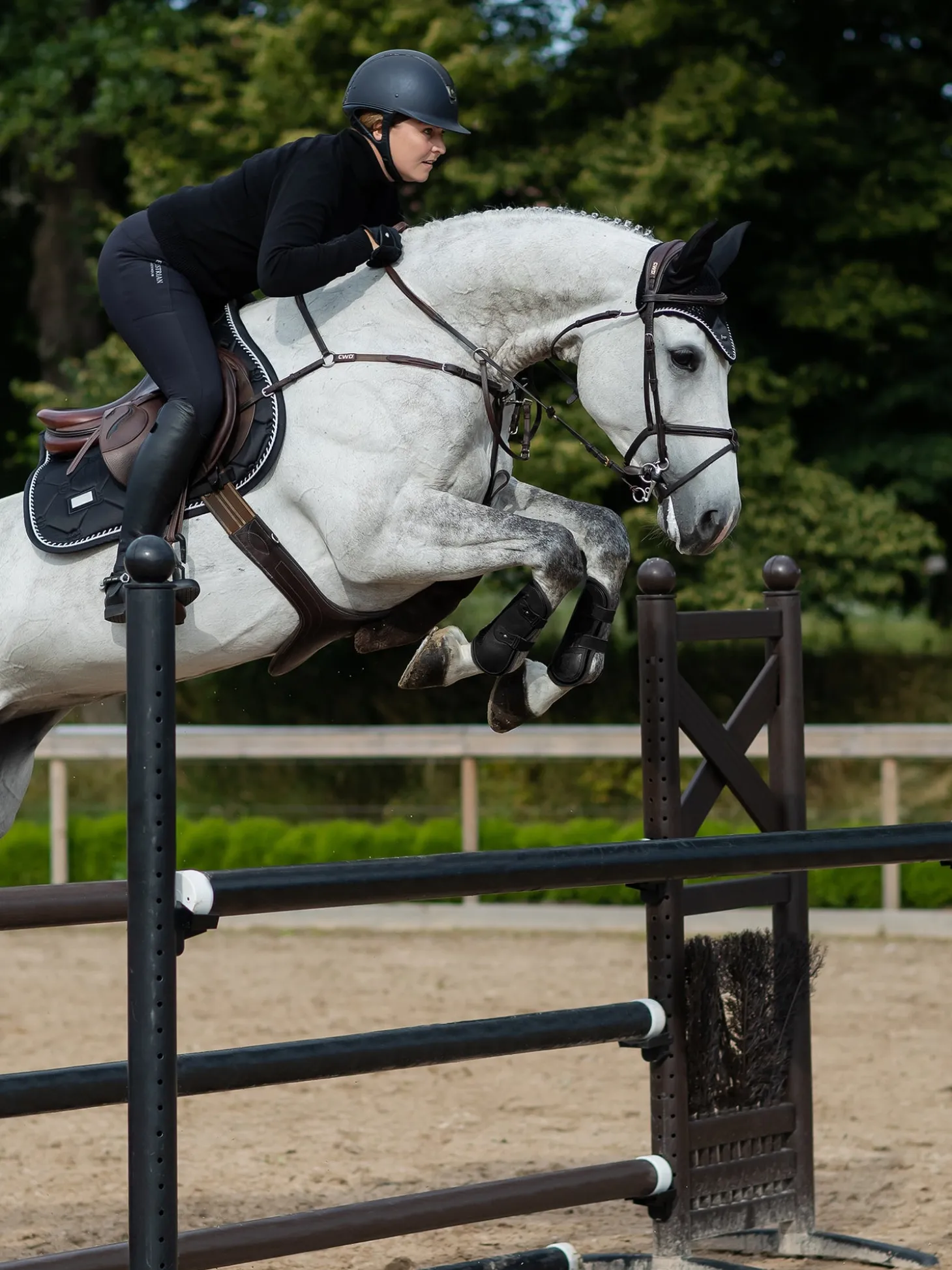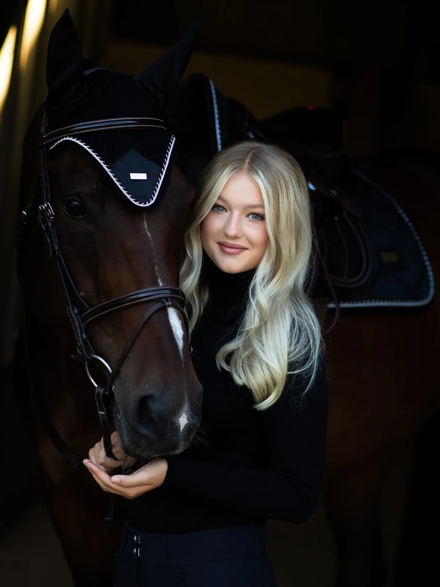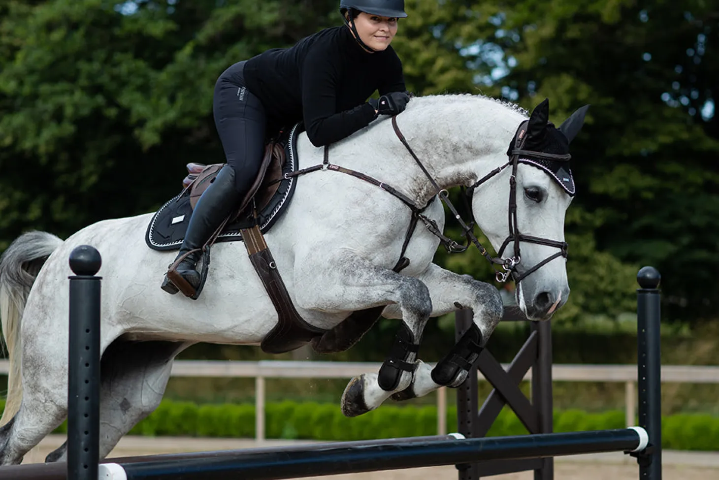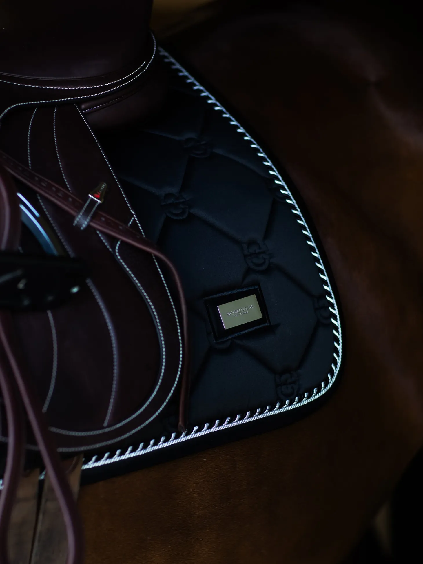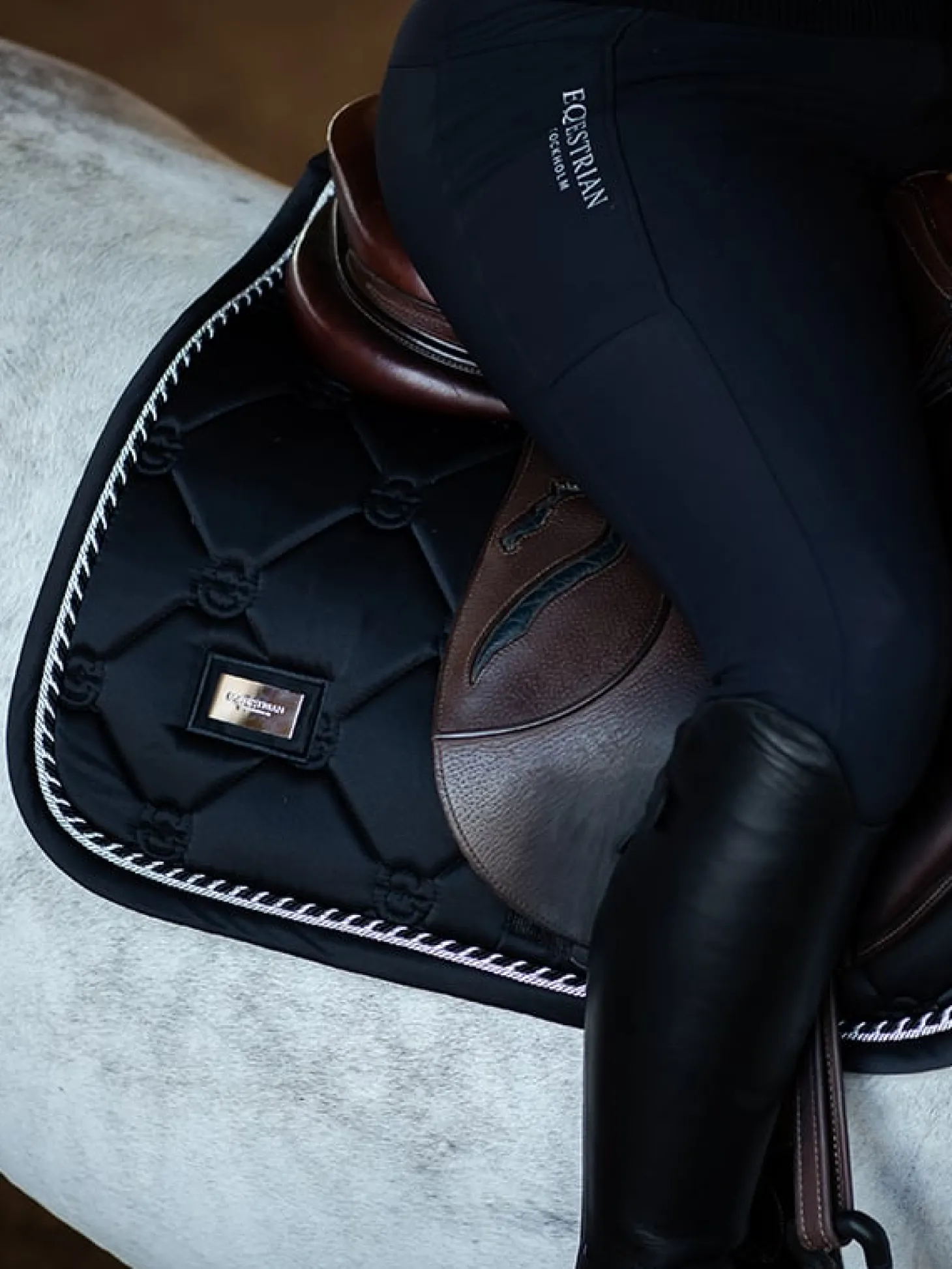 Hier ist unsere perfekte, zeitlose Schabracke! Die hochwertige Springschabracke in Shiny Black ist ideal für Turniere oder für das Training. Das Material der Schabracke glänzt und ist schmutzabweisend. Sie hat schöne Details in Silver und ein Muster aus dem Logo von Equestrian Stockholm.