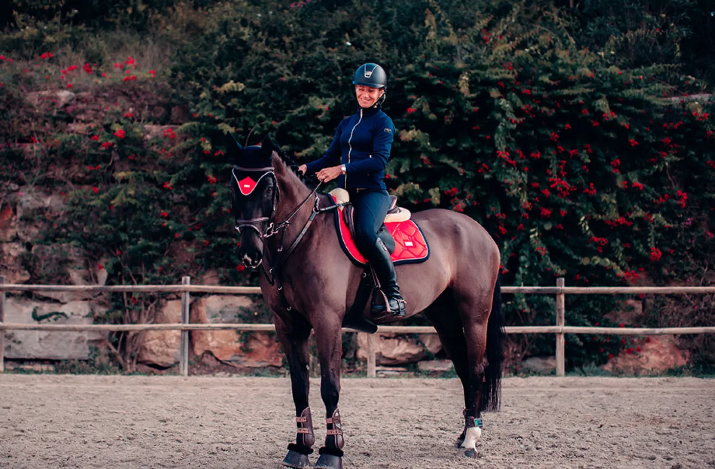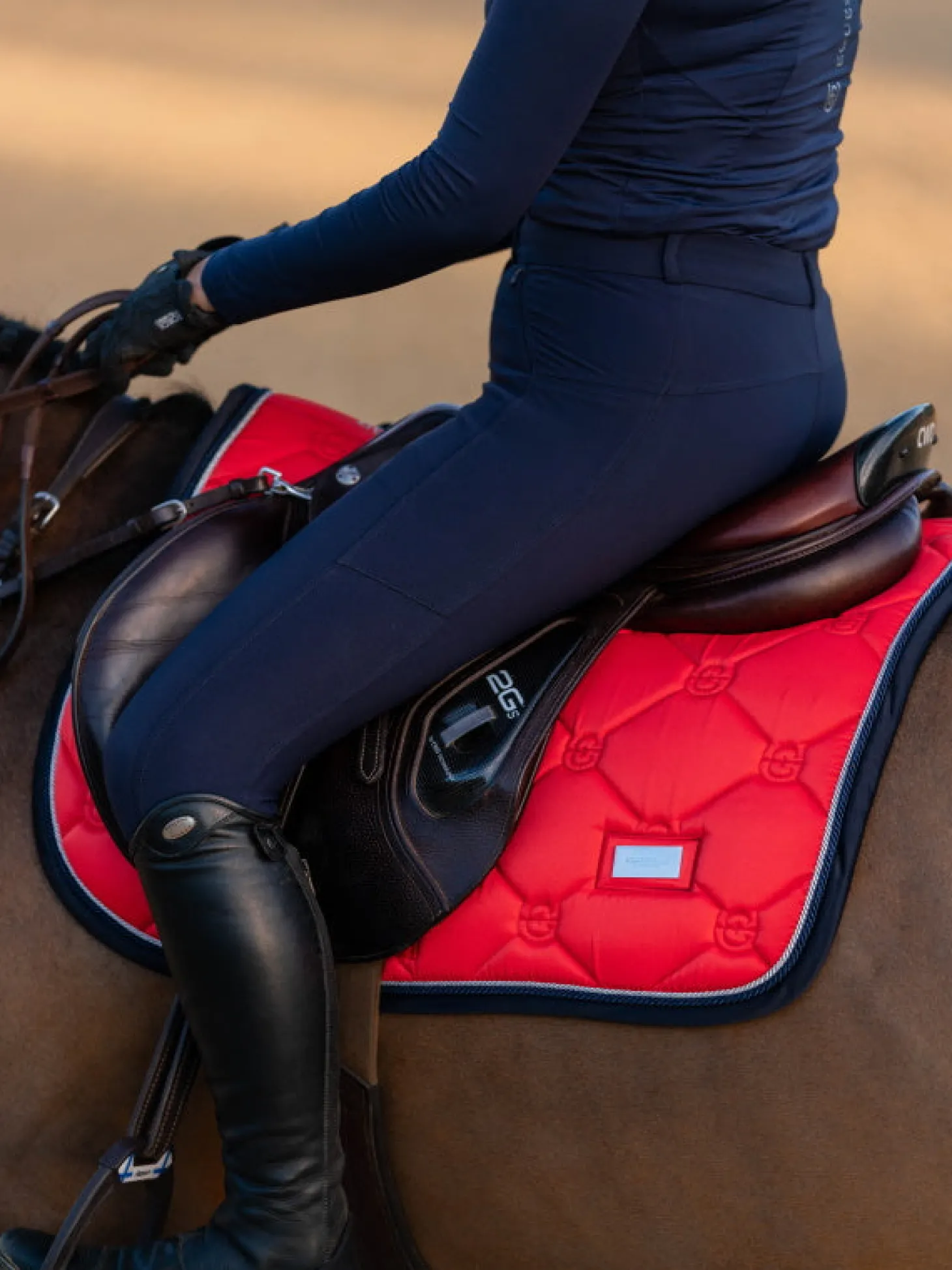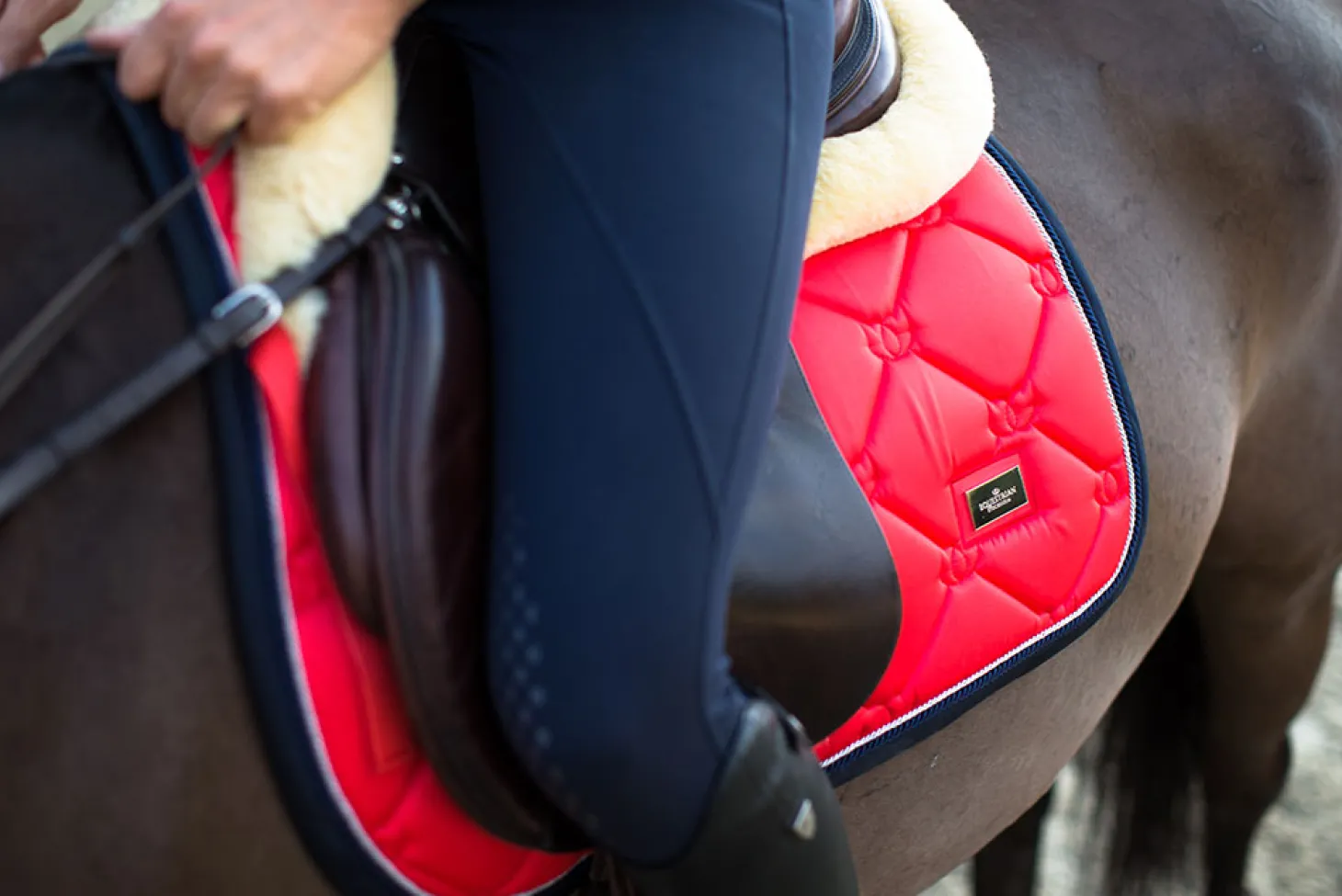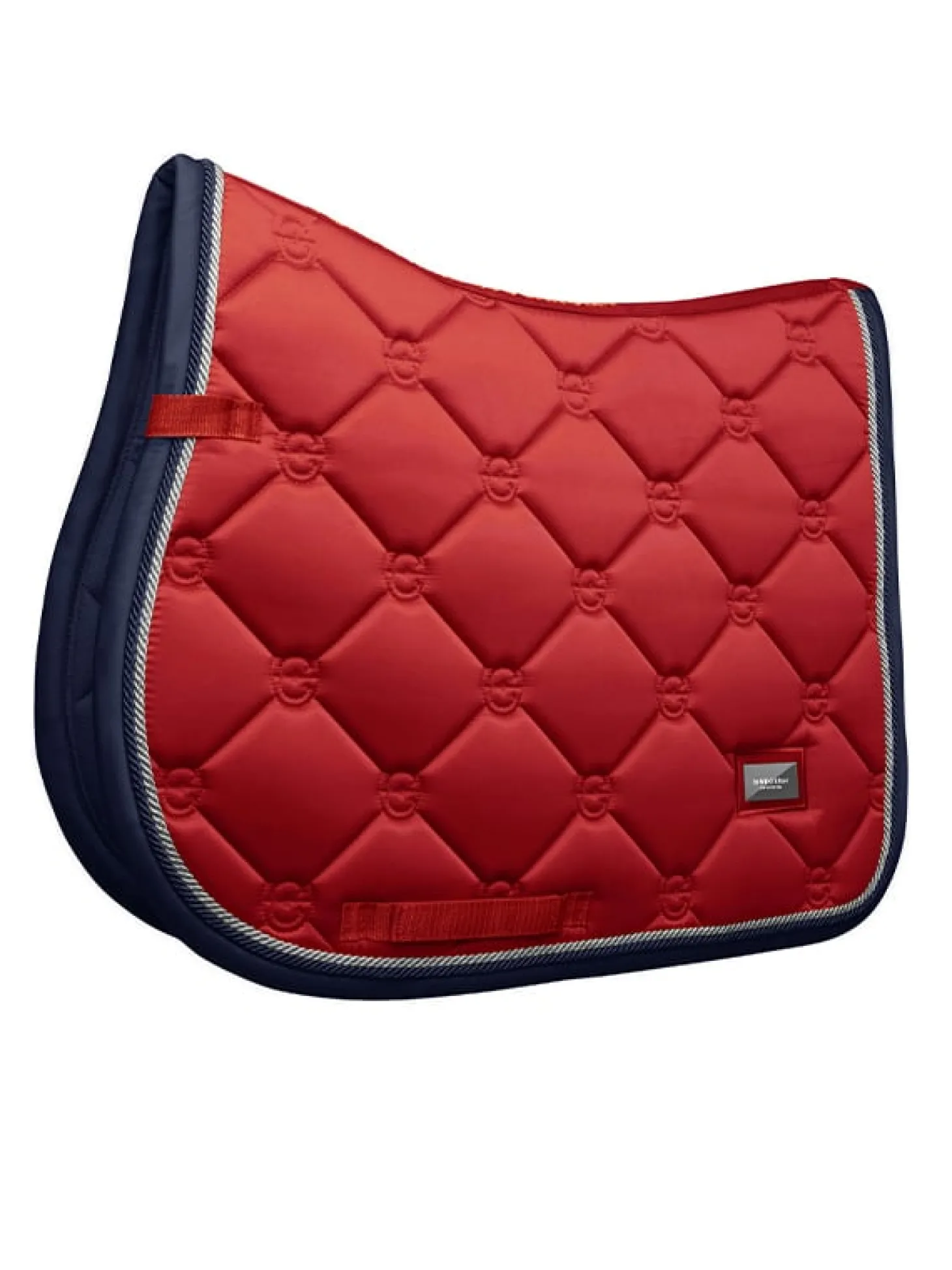 In unserer hochwertigen Dressurschabracke wird Shiny Grenadine Red mit einem Saum in Dark Navy Blue und silberfarbenen Details kombiniert.