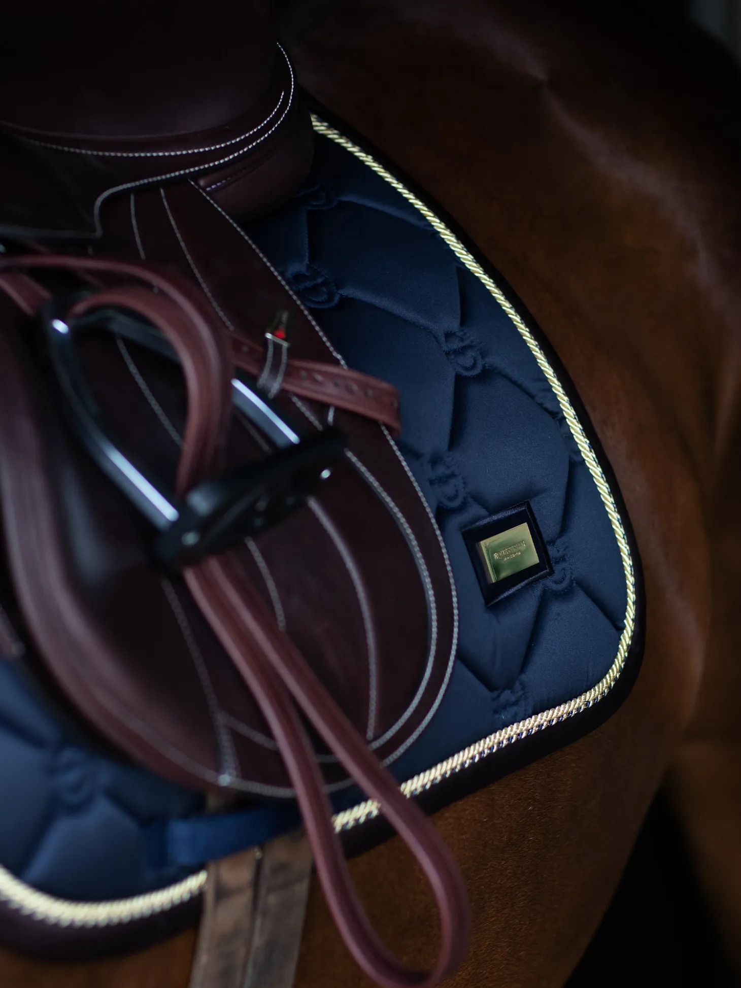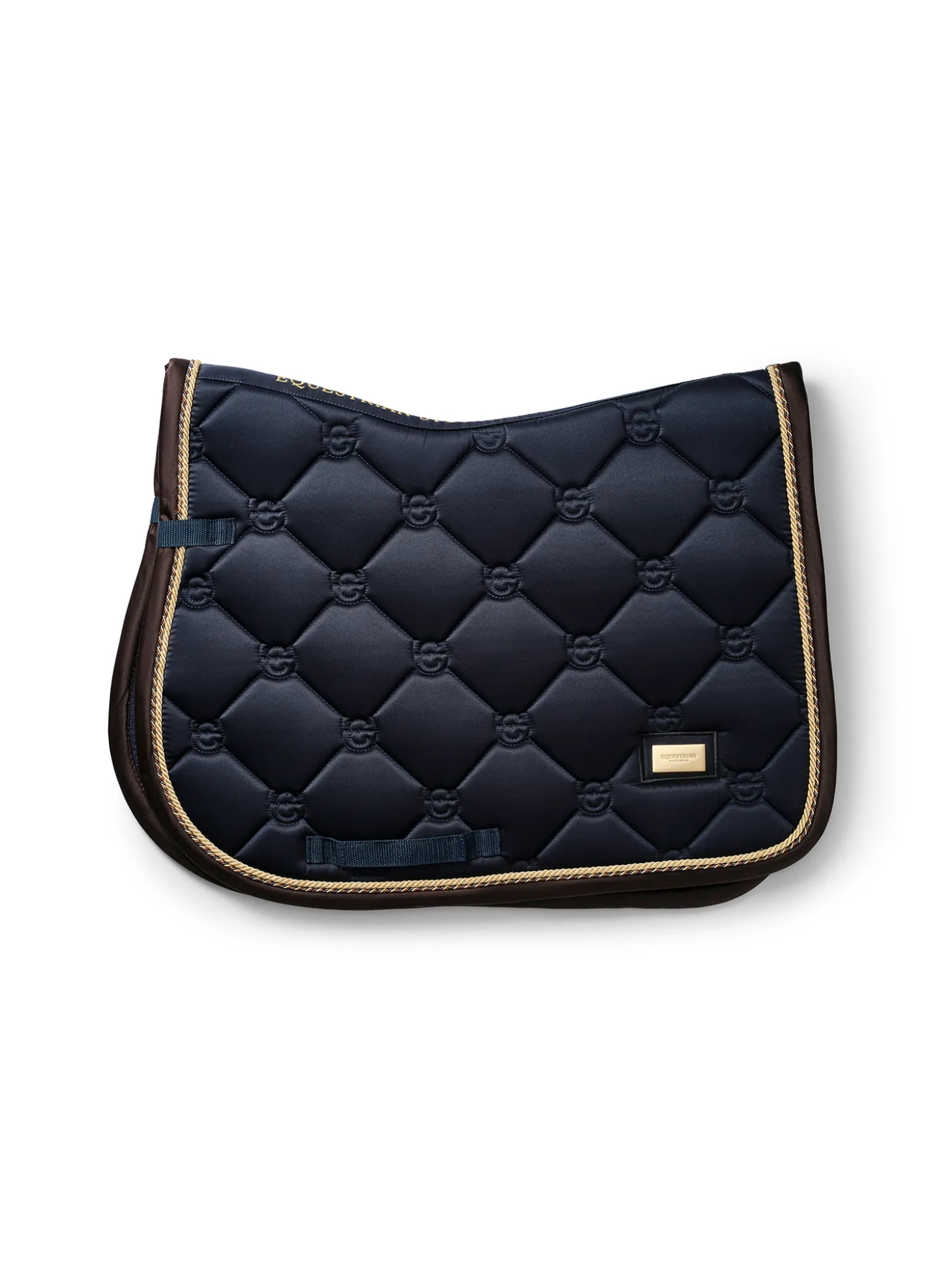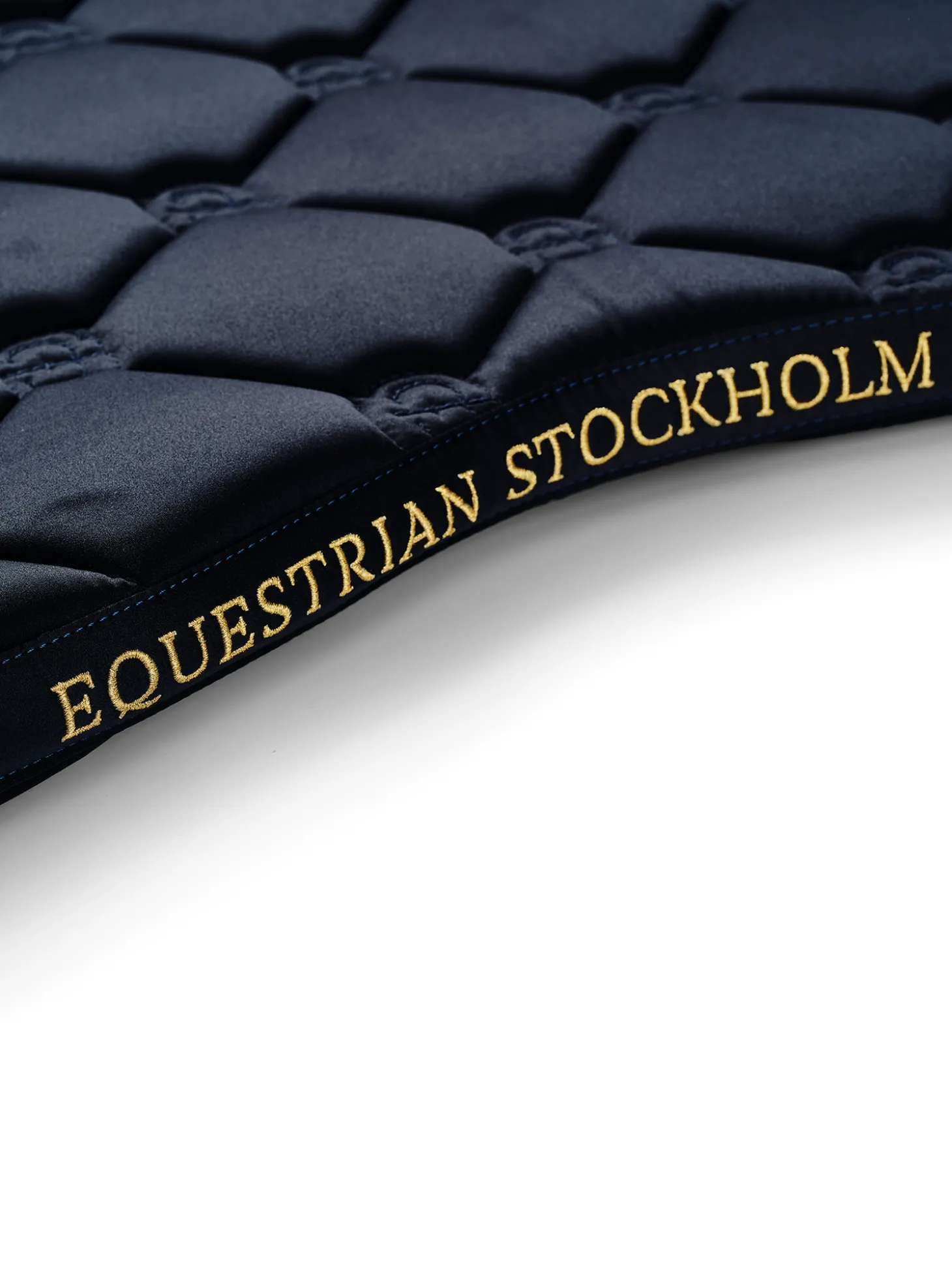 Die hochwertige Springschabracke in Shiny Navy ist ideal für Turniere oder für das Training! Das Material der Schabracke ist glänzend und schmutzabweisend und hat schöne goldfarbene Details und ein Muster mit dem Logo von Equestrian Stockholm.