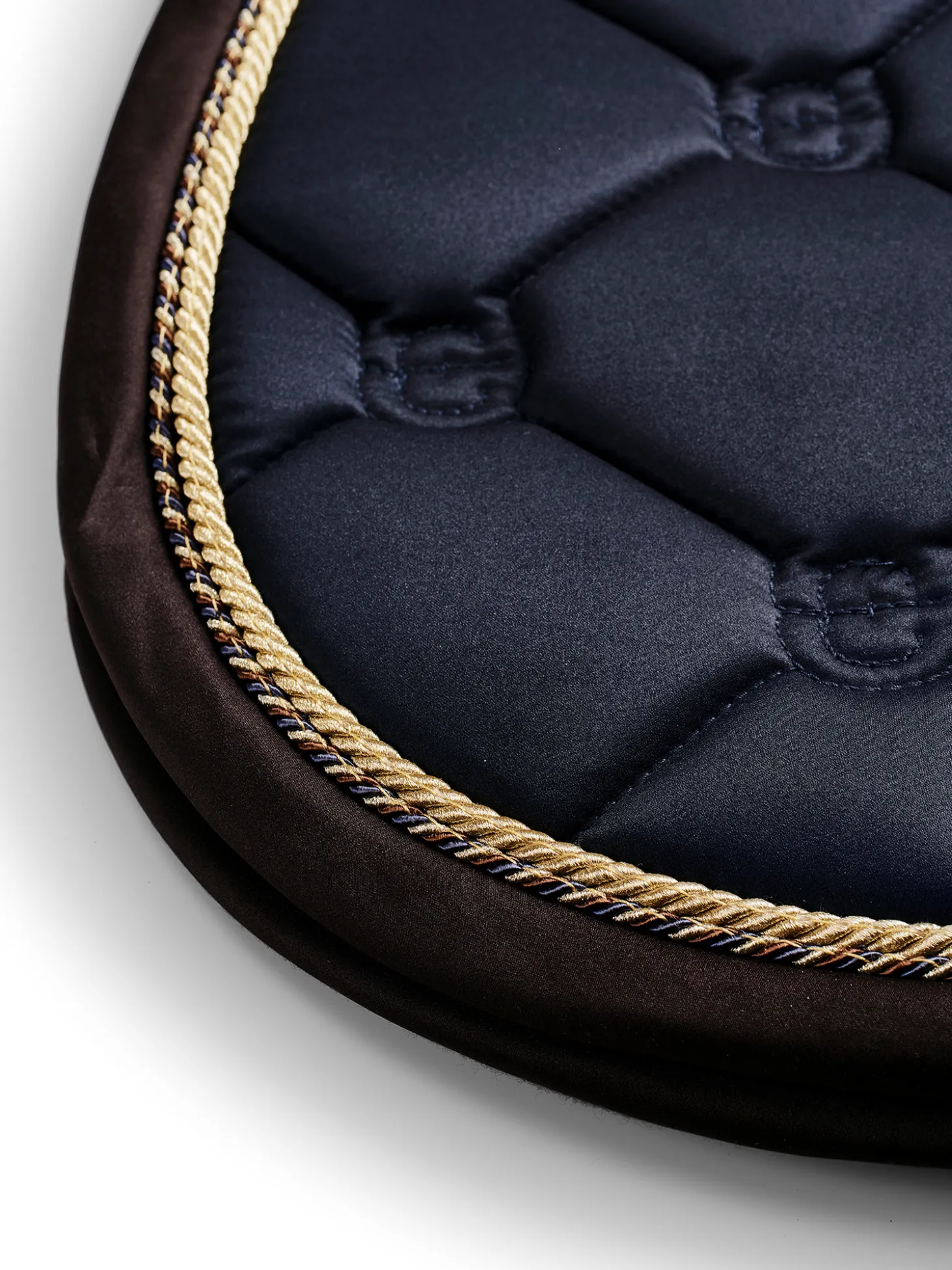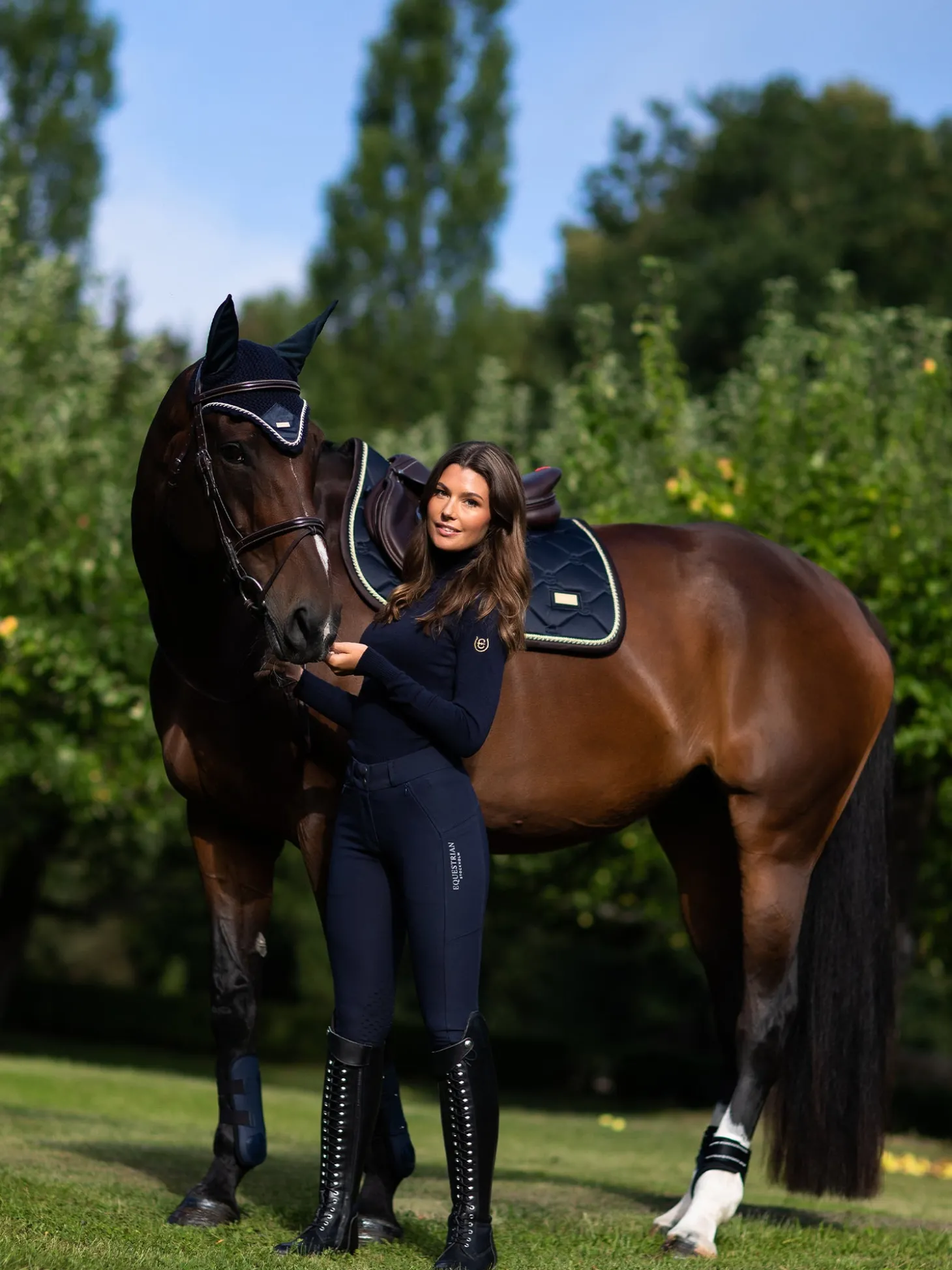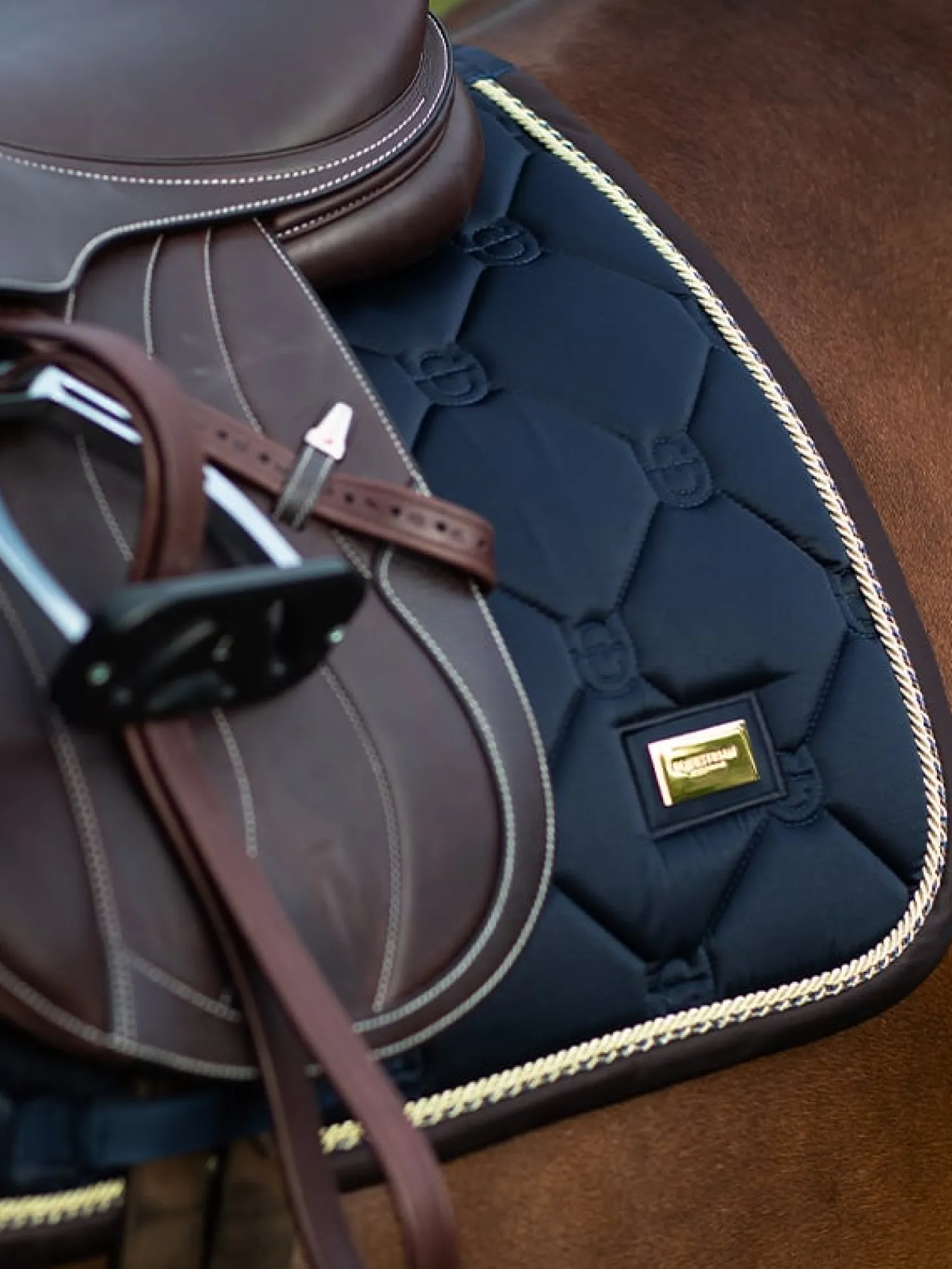 Die hochwertige Springschabracke in Shiny Navy ist ideal für Turniere oder für das Training! Das Material der Schabracke ist glänzend und schmutzabweisend und hat schöne goldfarbene Details und ein Muster mit dem Logo von Equestrian Stockholm.