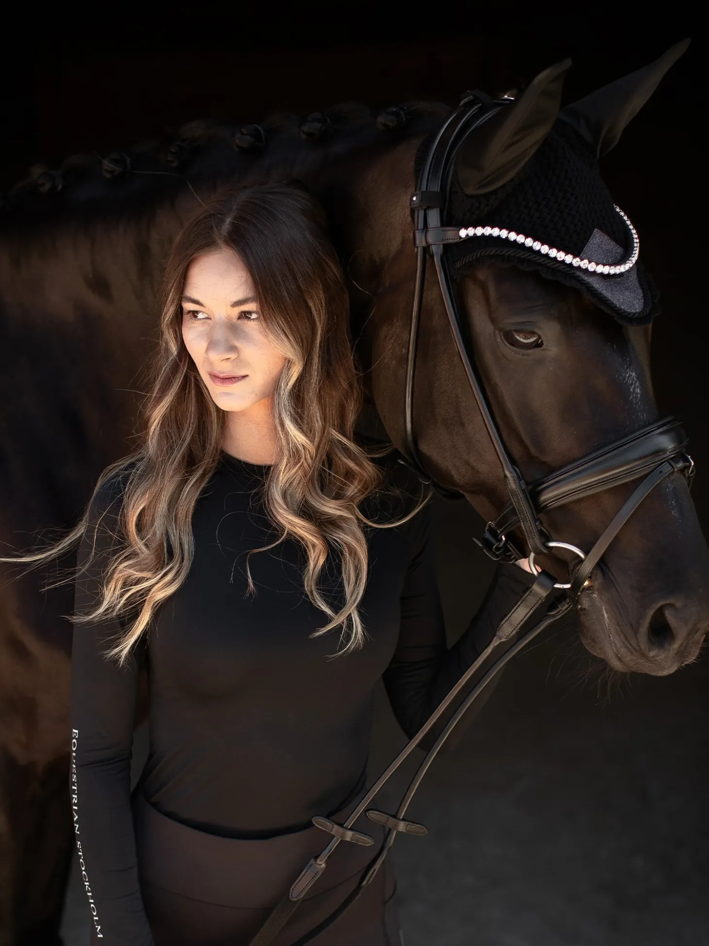 Details: Schwarzes metallisches Equestrian Stockholm Logo auf der oberen Bindung / Strapazierfähiger Schutzstreifen unter dem Klettverschluss am Sattelgurt in der Farbe Schwarz