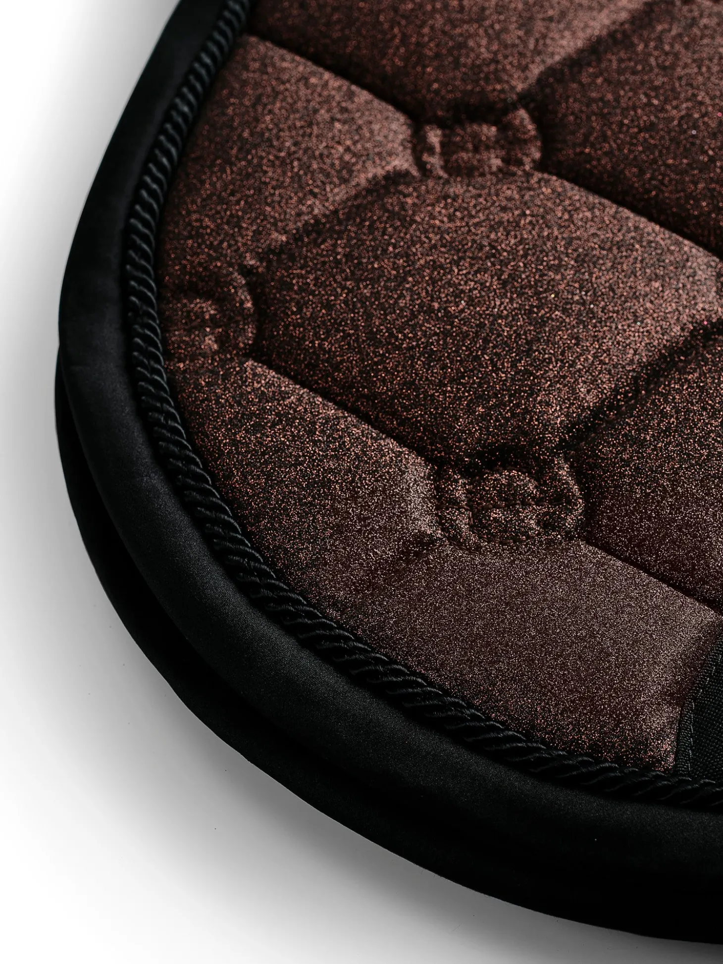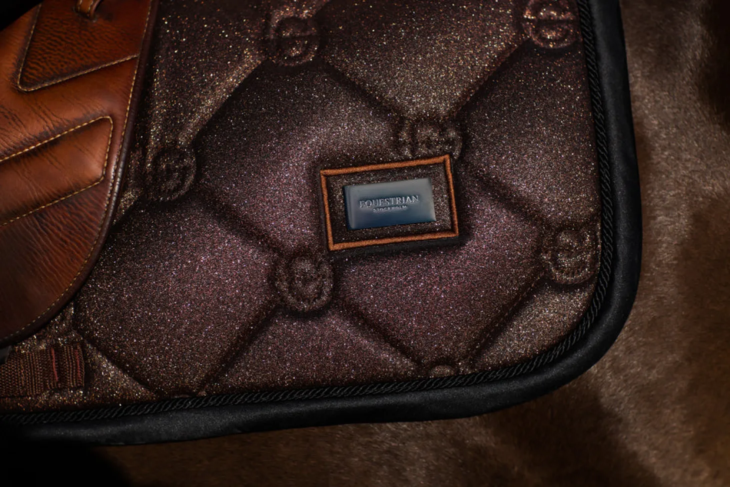 Elegante Schabracke in Braun Glitzer mit Chrom und schwarzen Details. Dekoriert mit unserem Equestrian Stockholm Abzeichen in Chrom. Das Material ist mit High IQ kühlen Komfort behandelt und sorgt somit für schnell trocknende und feuchtigkeitstransportierende Eigenschaften. Dies hilft Ihrem Pferd, länger trocken und frisch zu bleiben. Unter dem Klettverschluss am Sattelgurt, wo die Schabracke am stärksten beansprucht wird, haben wir einen dauerhaften Schutzstreifen angebracht. Kombinieren Sie die Schabracke mit anderen Teilen aus unserer Mahogany Glimmer Kollektion für einen stilvollen Look von Kopf bis Fuß.