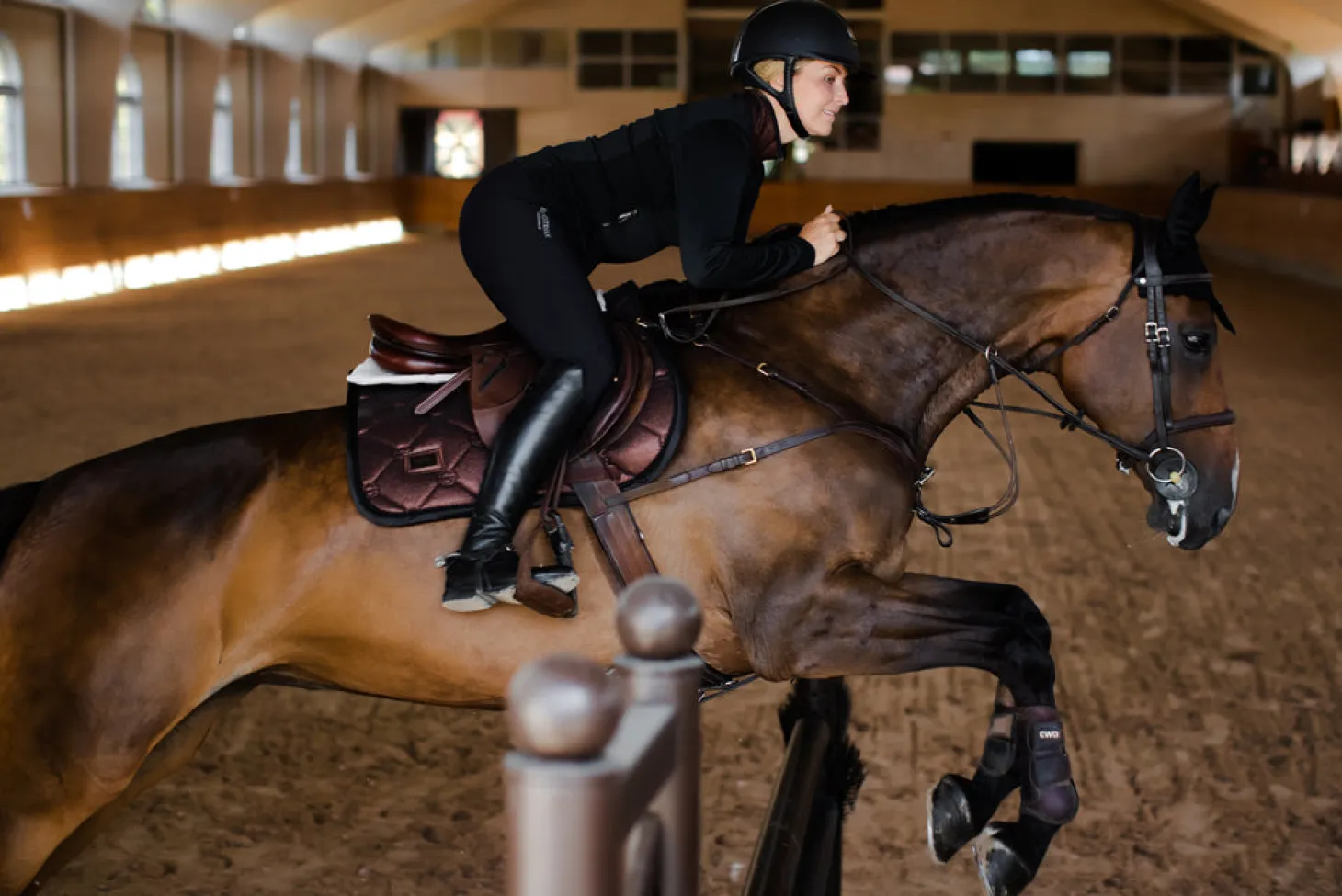 Details: Schwarzes metallisches Equestrian Stockholm Logo auf der oberen Bindung / Strapazierfähiger Schutzstreifen unter dem Klettverschluss am Sattelgurt in der Farbe Schwarz