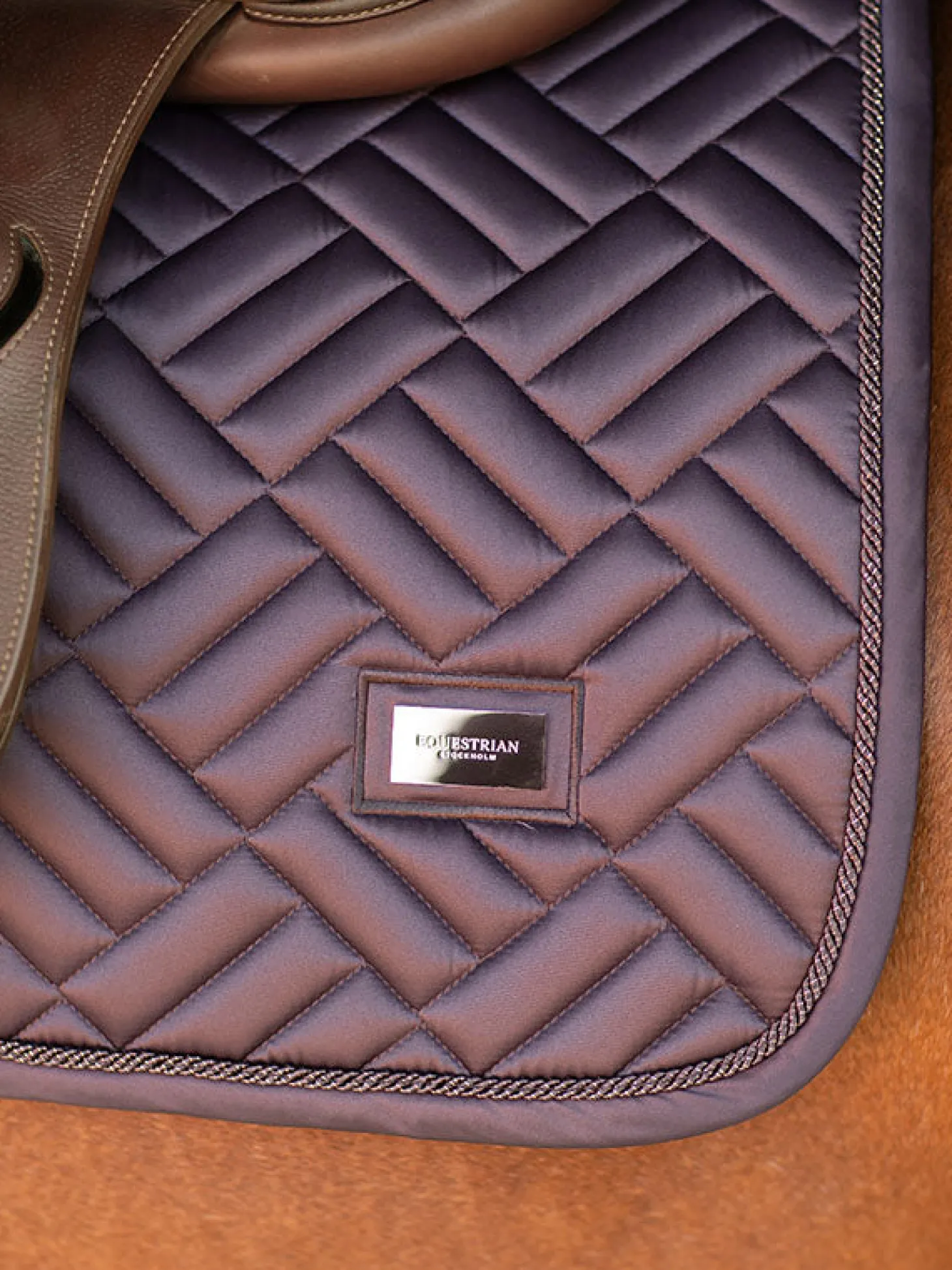 Elegante Schabracke mit moderner Labyrinth Steppung in Braun/Lila mit roségoldenen Details. Verziert mit dem Equestrian Stockholm Abzeichen in Roségold. Das Bambusmaterial ist aufgrund seiner thermoregulierenden Wirkung das ganze Jahr über perfekt – kühlend im Sommer und wärmend im Winter. Außerdem ist es schnelltrocknend, feuchtigkeitsableitend und antibakteriell. Kombinieren Sie die Schabracke mit anderen Teilen aus der Moonless Night Kollektion für einen stilvollen Look von Kopf bis Fuß.