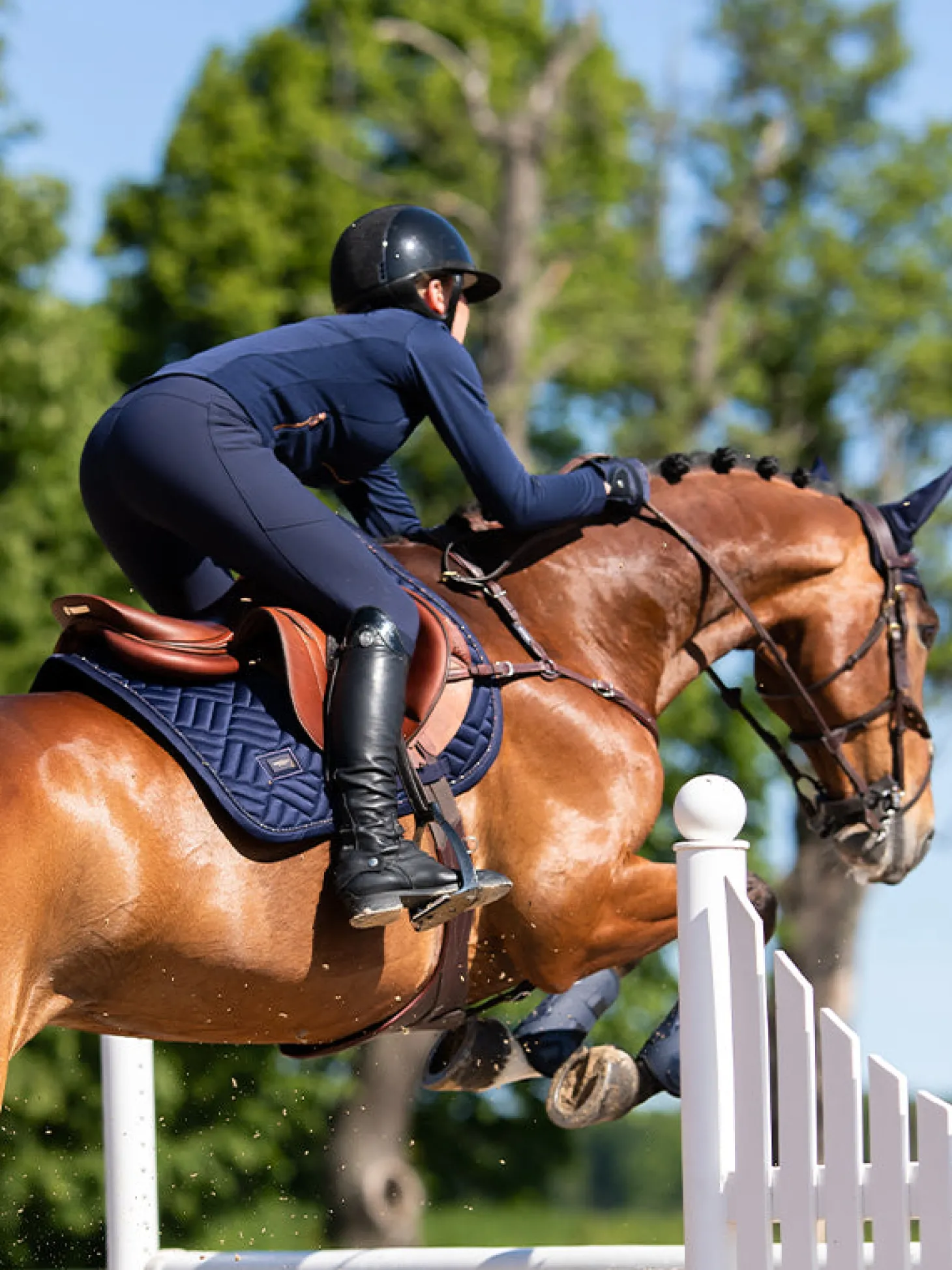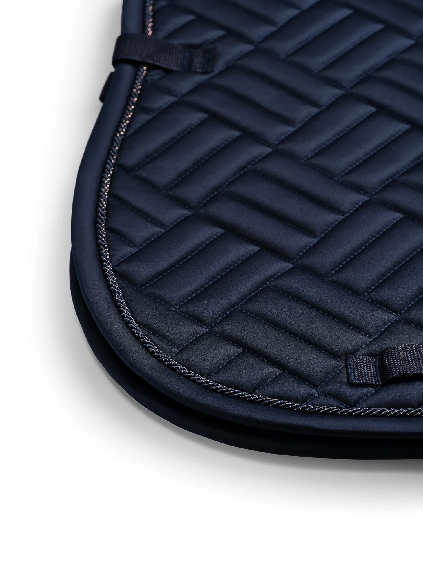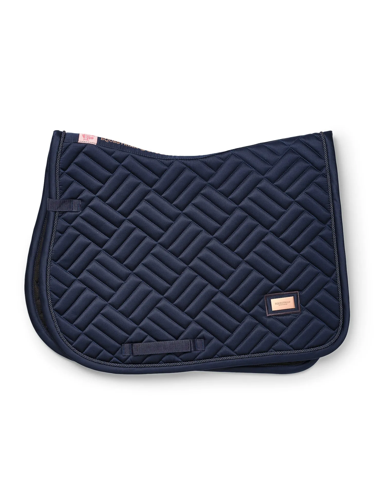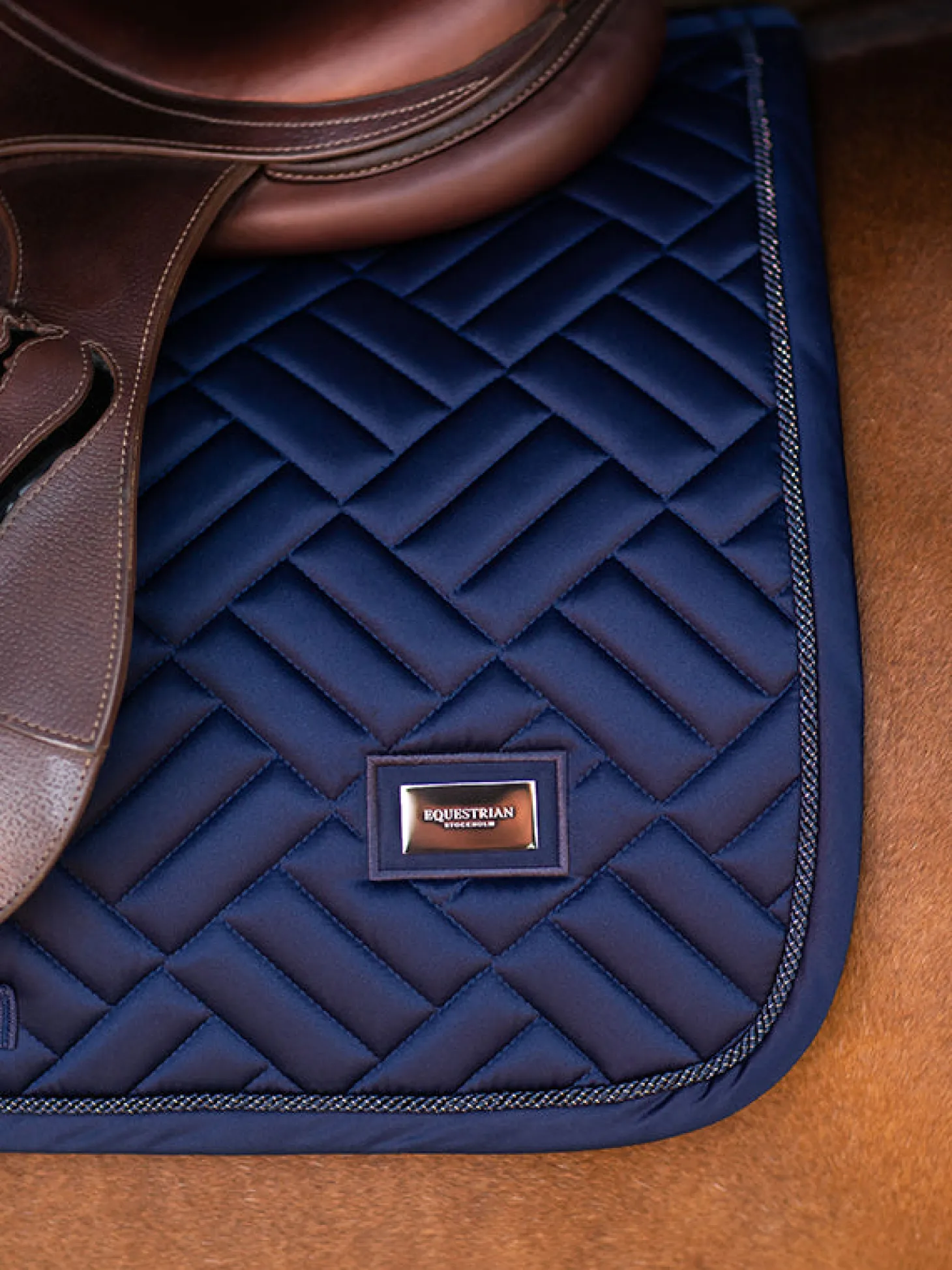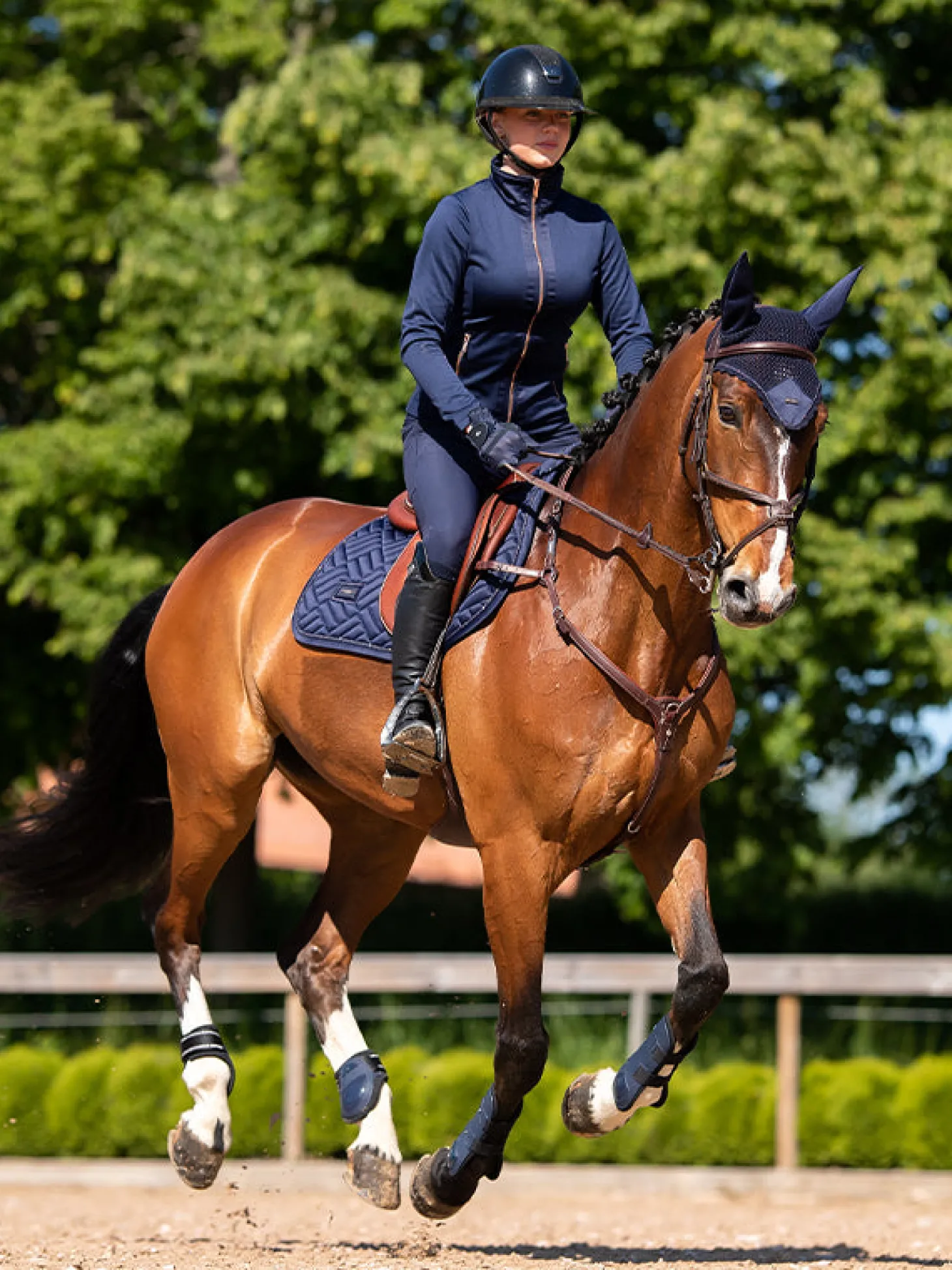 Elegante Schabracke mit moderner Labyrinth Steppung in Blau mit Roségold Details. Verziert mit dem Equestrian Stockholm Abzeichen in Roségold. Das Bambusmaterial ist aufgrund seiner thermoregulierenden Wirkung das ganze Jahr über perfekt – kühlend im Sommer und wärmend im Winter. Außerdem ist es schnelltrocknend, feuchtigkeitsableitend und antibakteriell. Kombinieren Sie die Schabracke mit anderen Teilen aus der Moonless Night Kollektion für einen stilvollen Look von Kopf bis Fuß.