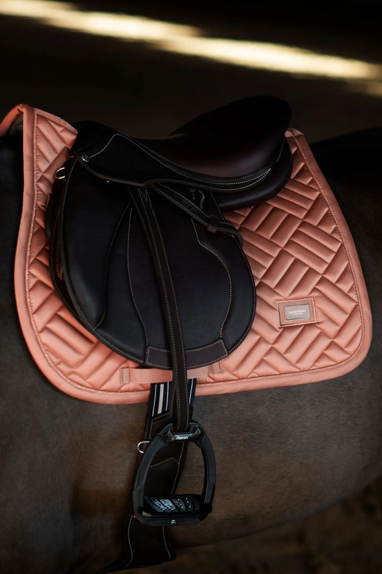 Elegante Schabracke mit moderner Steppung in Korallenrosa mit silbernen Details. Verziert mit dem Equestrian Stockholm Abzeichen in Silber. Das Bambusmaterial ist aufgrund seiner thermoregulierenden Wirkung das ganze Jahr über perfekt – kühlend im Sommer und wärmend im Winter. Außerdem ist es schnelltrocknend, feuchtigkeitsableitend und antibakteriell. Kombinieren Sie die Schabracke mit anderen Teilen aus der Coral Kollektion für einen stilvollen Look von Kopf bis Fuß.