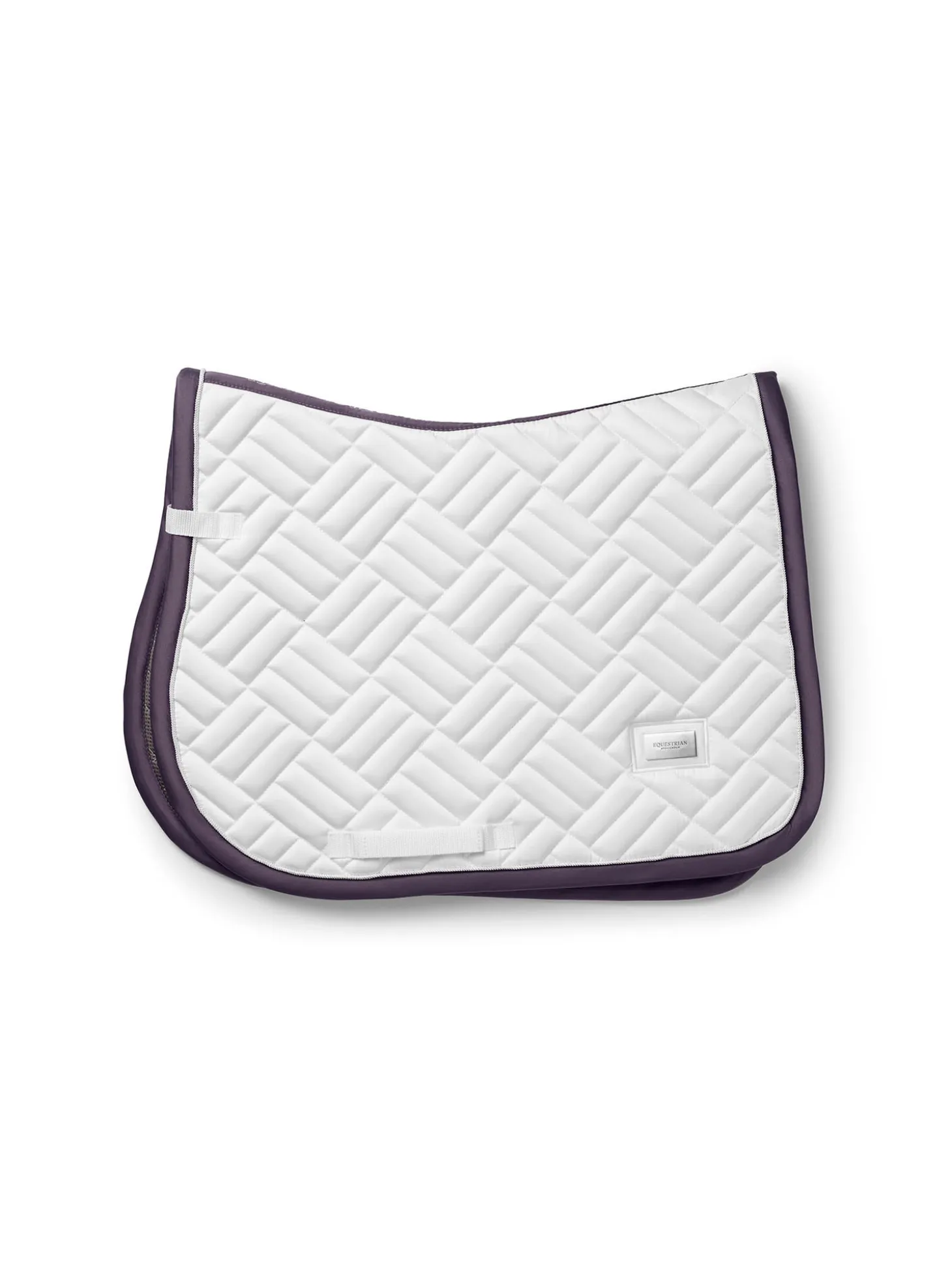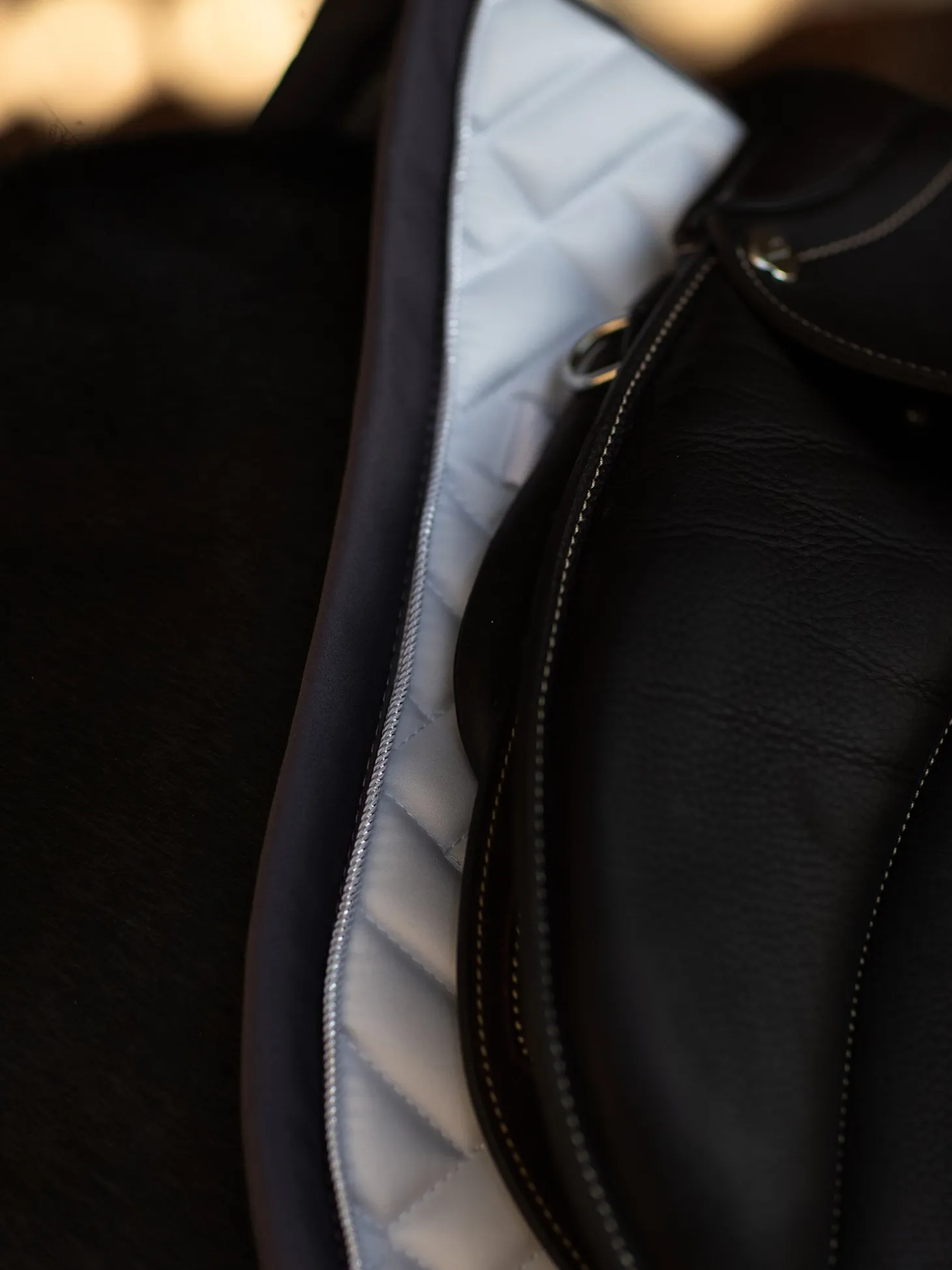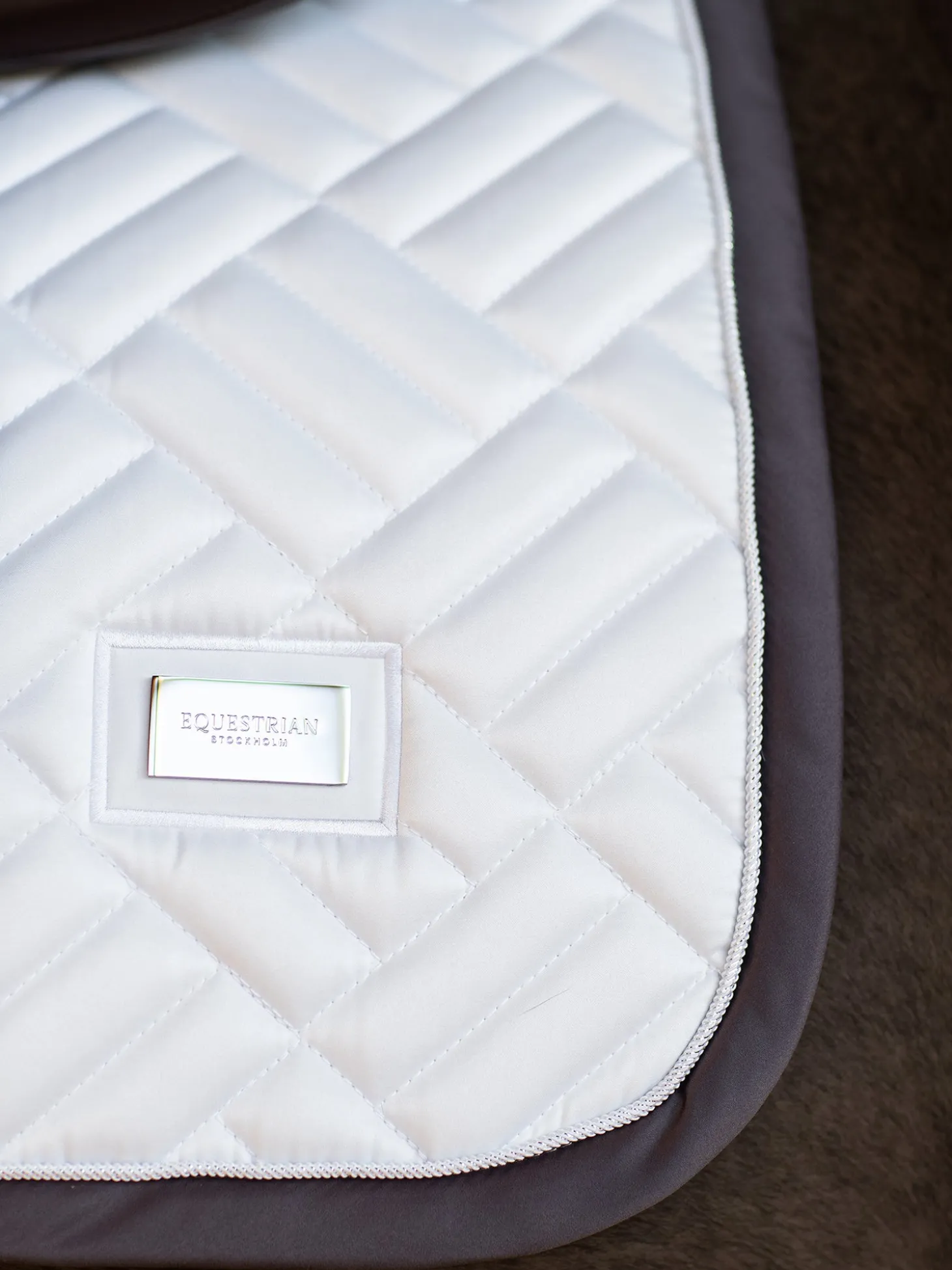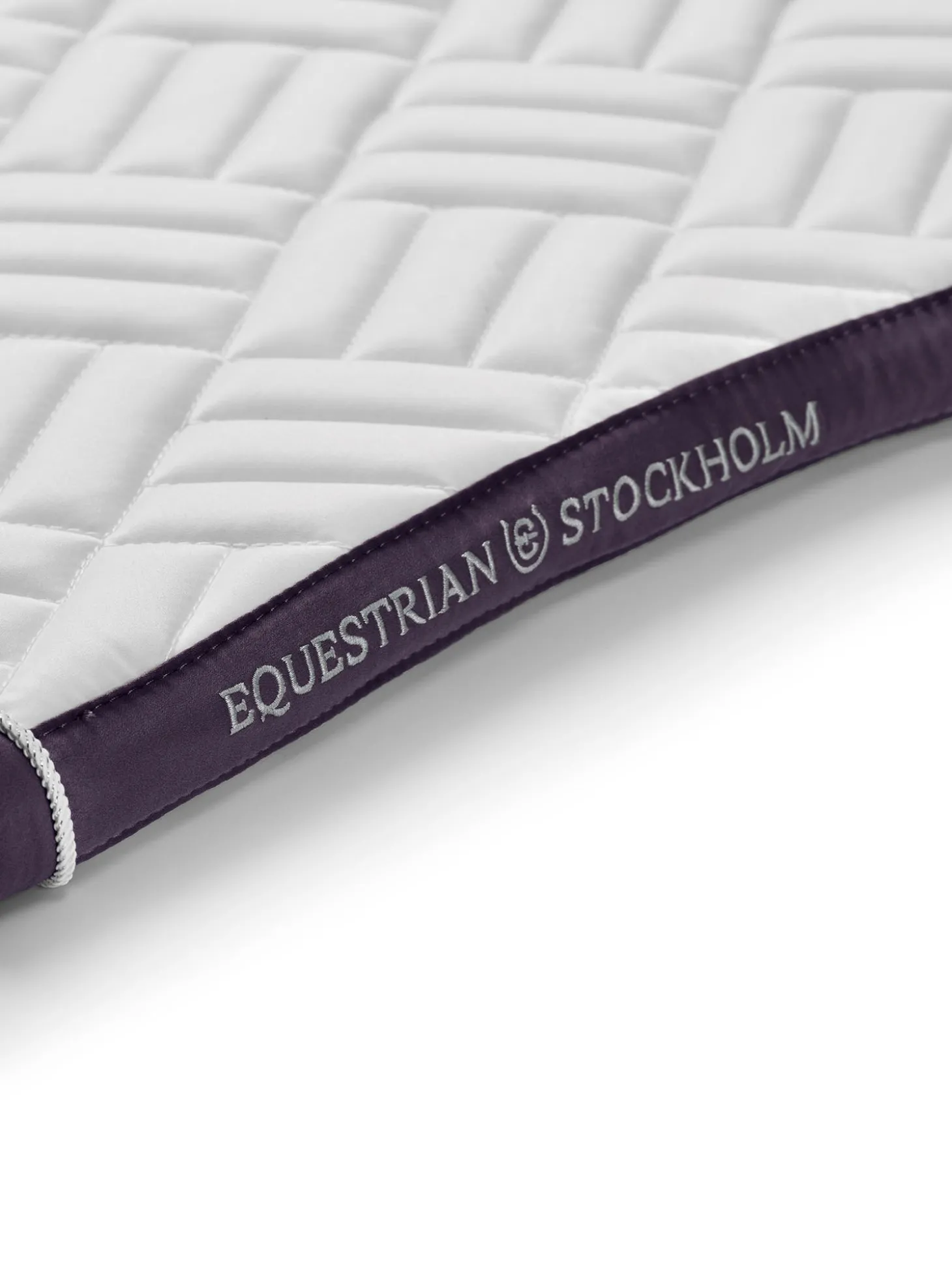Elegante Schabracke mit modernem Steppmuster in Weiß mit silbernen Details. Verziert mit dem Equestrian Stockholm Abzeichen in Silber. Das Bambusmaterial ist aufgrund seiner thermoregulierenden Wirkung – kühlend im Sommer und wärmend im Winter – das ganze Jahr über perfekt geeignet. Es ist außerdem schnell trocknend, feuchtigkeitstransportierend und antibakteriell. Kombinieren Sie die Schabracke mit anderen Teilen aus der Dark Violet Kollektion für einen stilvollen Look von Kopf bis Fuß.