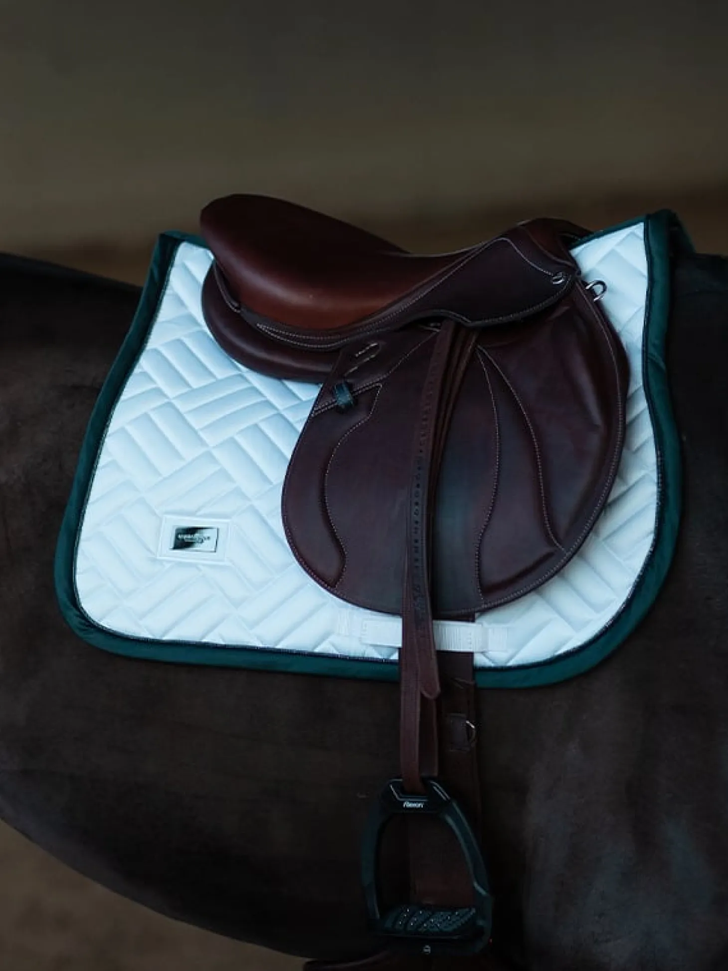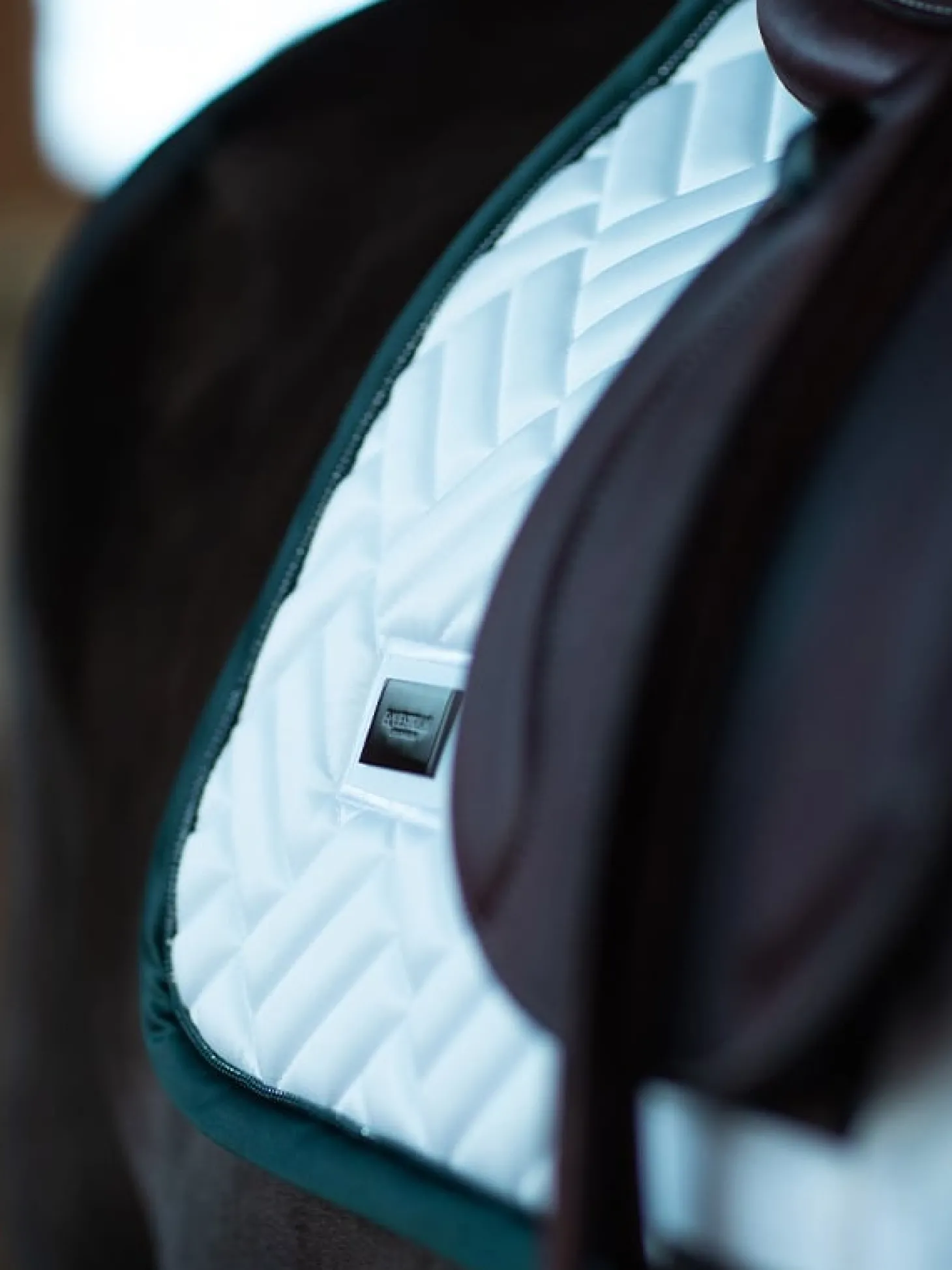 Elegante Schabracke mit moderner Steppung in Weiß mit dramatisch grünen und schwarzen Details. Verziert mit dem Equestrian Stockholm Abzeichen in schwarz. Das Bambusmaterial ist aufgrund seiner thermoregulierenden Wirkung das ganze Jahr über perfekt – kühlend im Sommer und wärmend im Winter. Außerdem ist es schnelltrocknend, feuchtigkeitsableitend und antibakteriell. Kombinieren Sie die Schabracke mit anderen Teilen aus der Dramatic Monday Kollektion für einen stilvollen Look von Kopf bis Fuß.