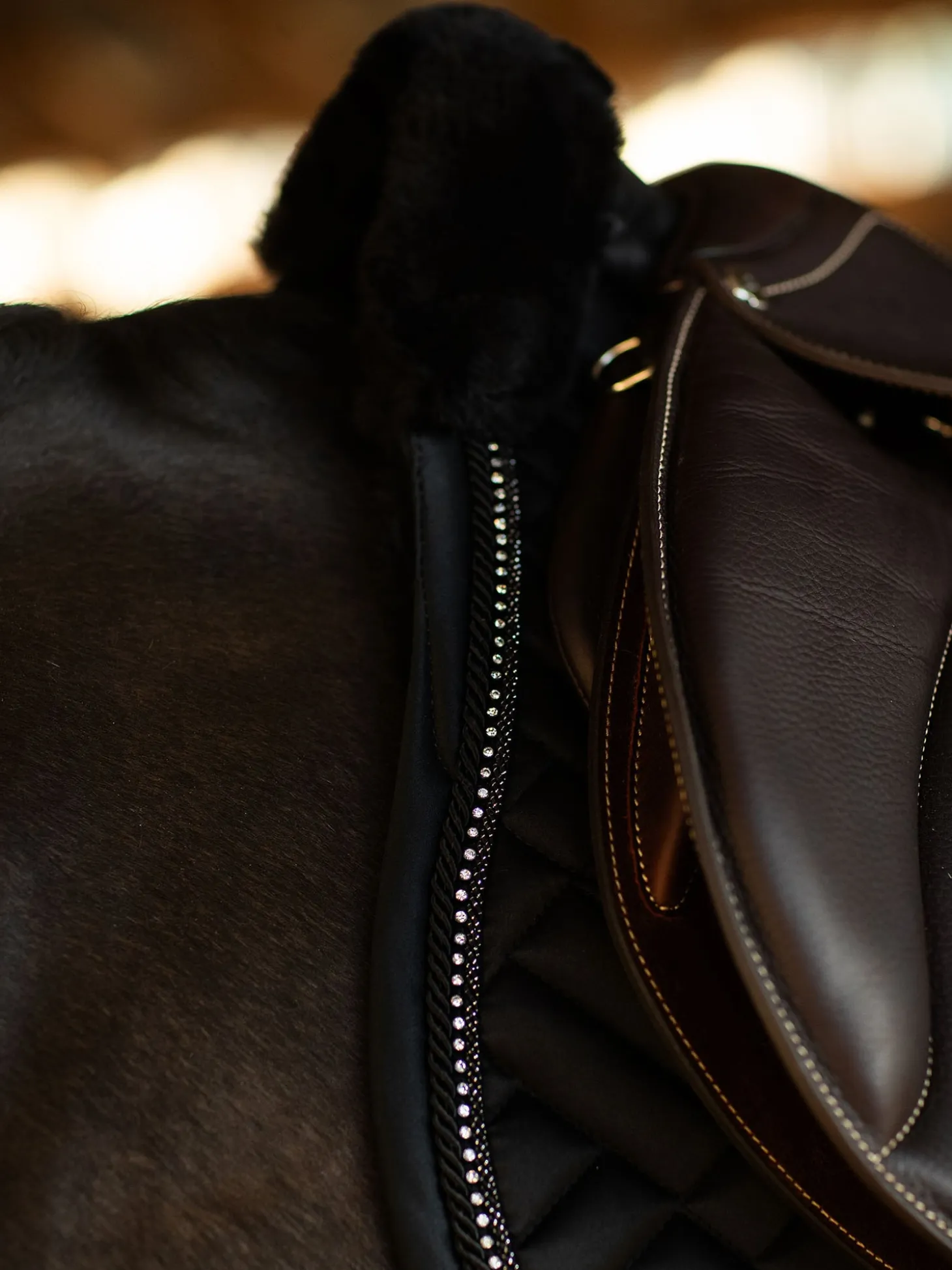 Elegante vegane Schabracke aus Kunstfell mit moderner Steppung und einem eleganten schwarzen Equestrian Stockholm Emblem. Die Schabracke besteht aus atmungsaktivem, feuchtigkeitsableitendem Bambusmaterial, das Ihrem Pferd das ganze Jahr über Komfort bietet und jedem Ritt einen Hauch von Eleganz verleiht.